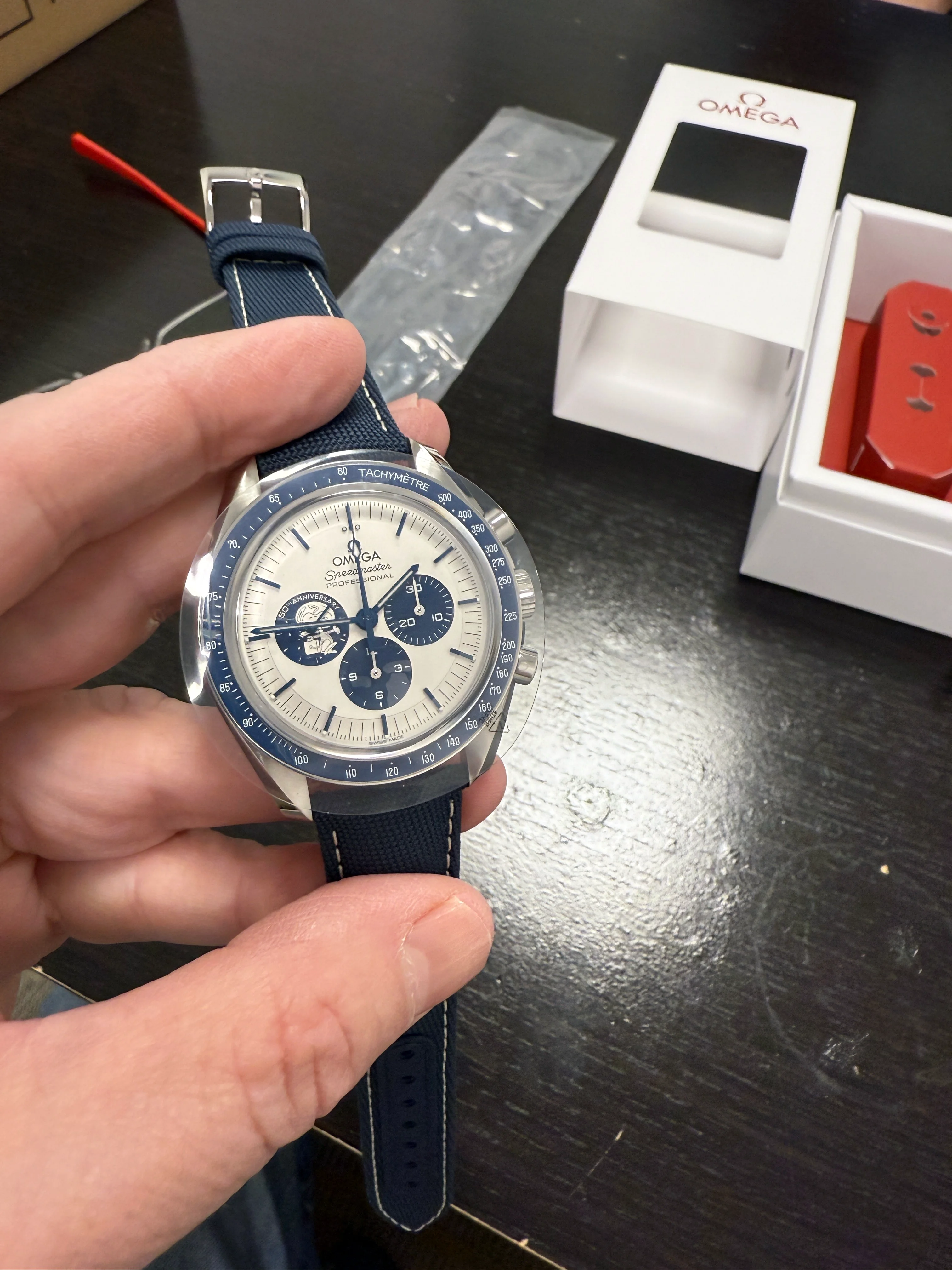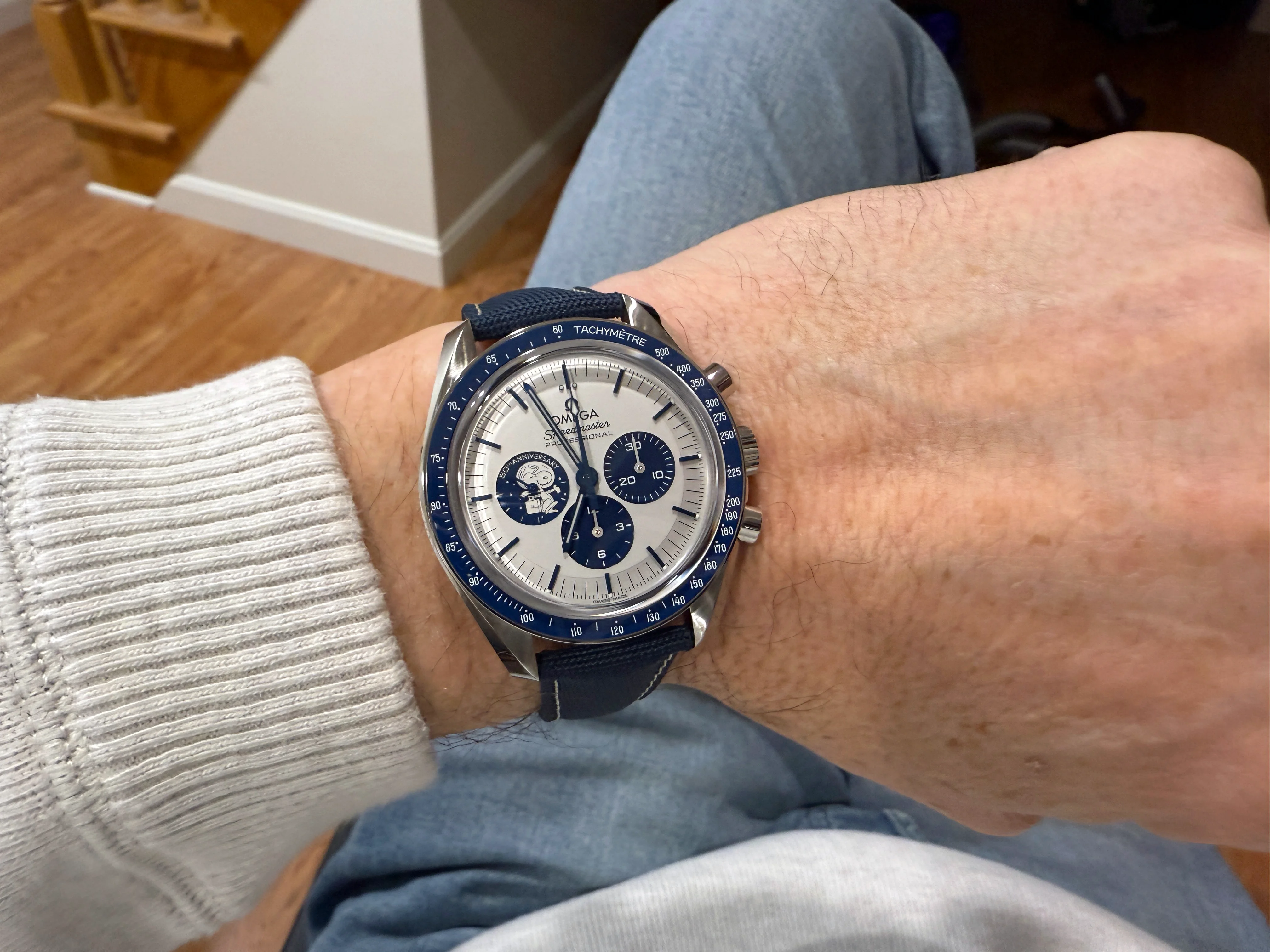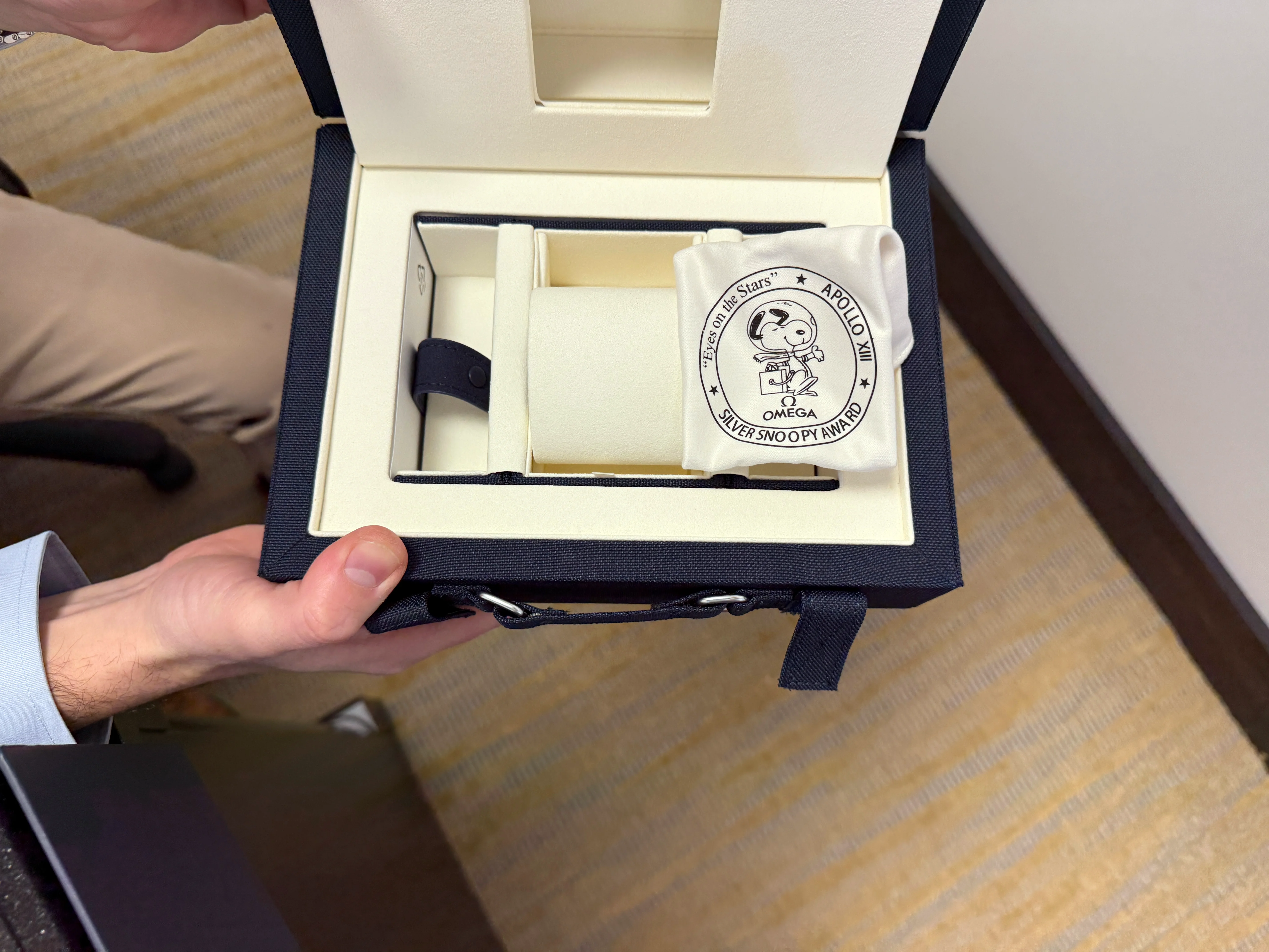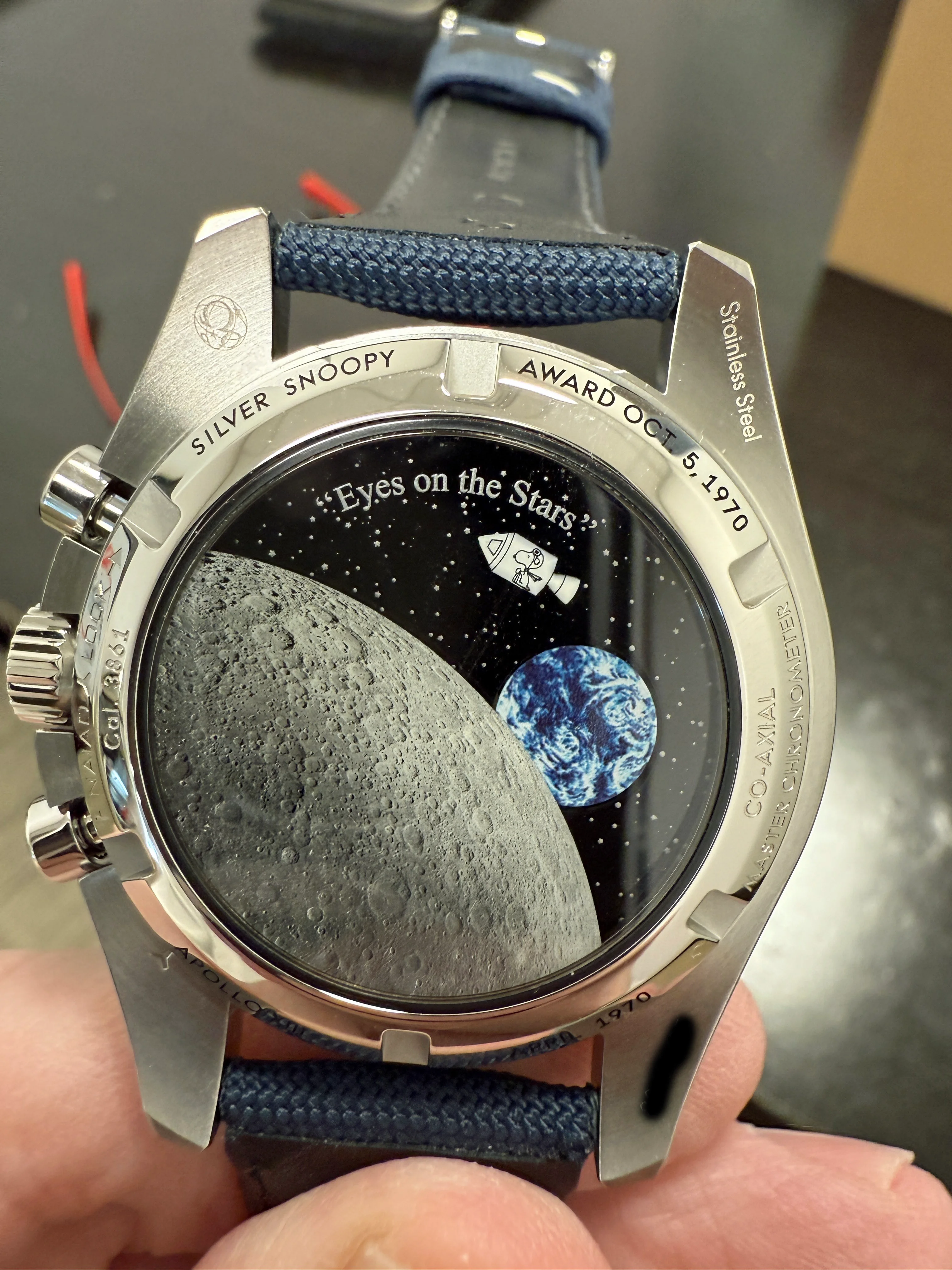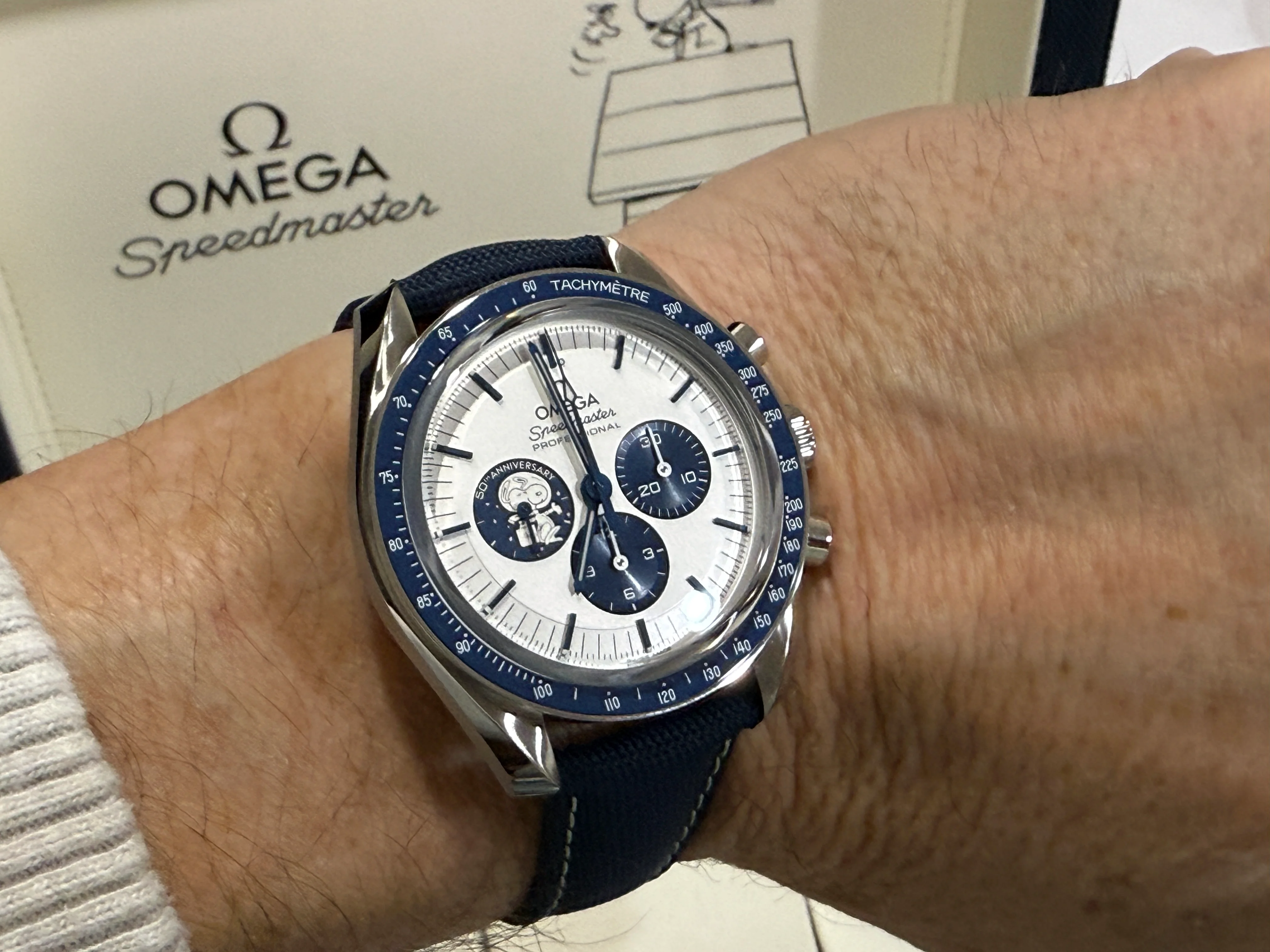 ·I received a call from my dealer and picked up the watch today, still in its delivery case. I have always been a Peanuts fan and my birthday is Oct. 5th, the same day Omega received the award from NASA. Always thought the watch would look great in my small collection. As people have stated that strap is extremely stiff. But I believe, like a good pair of boots, that it will just take some work to break in and then be worth the effort. Here are some pics from the dealer and when I arrived home.