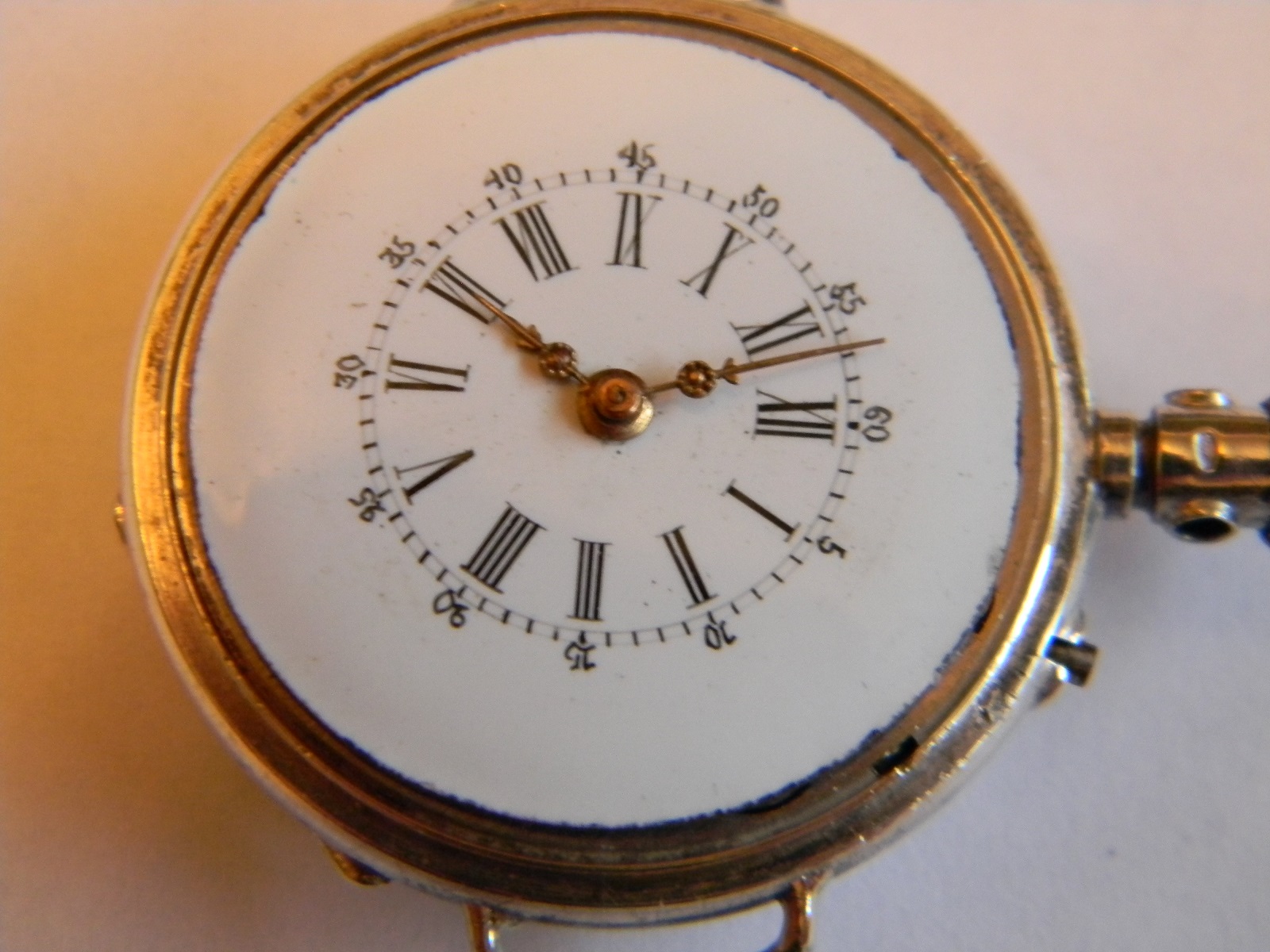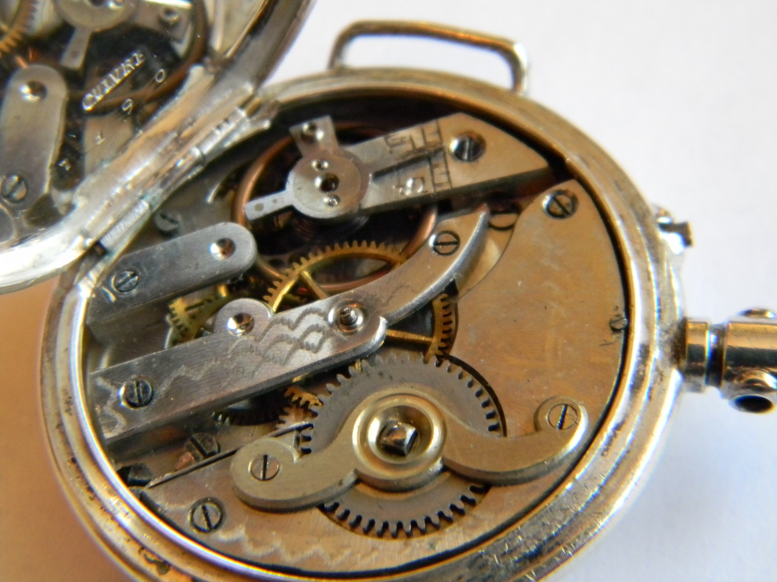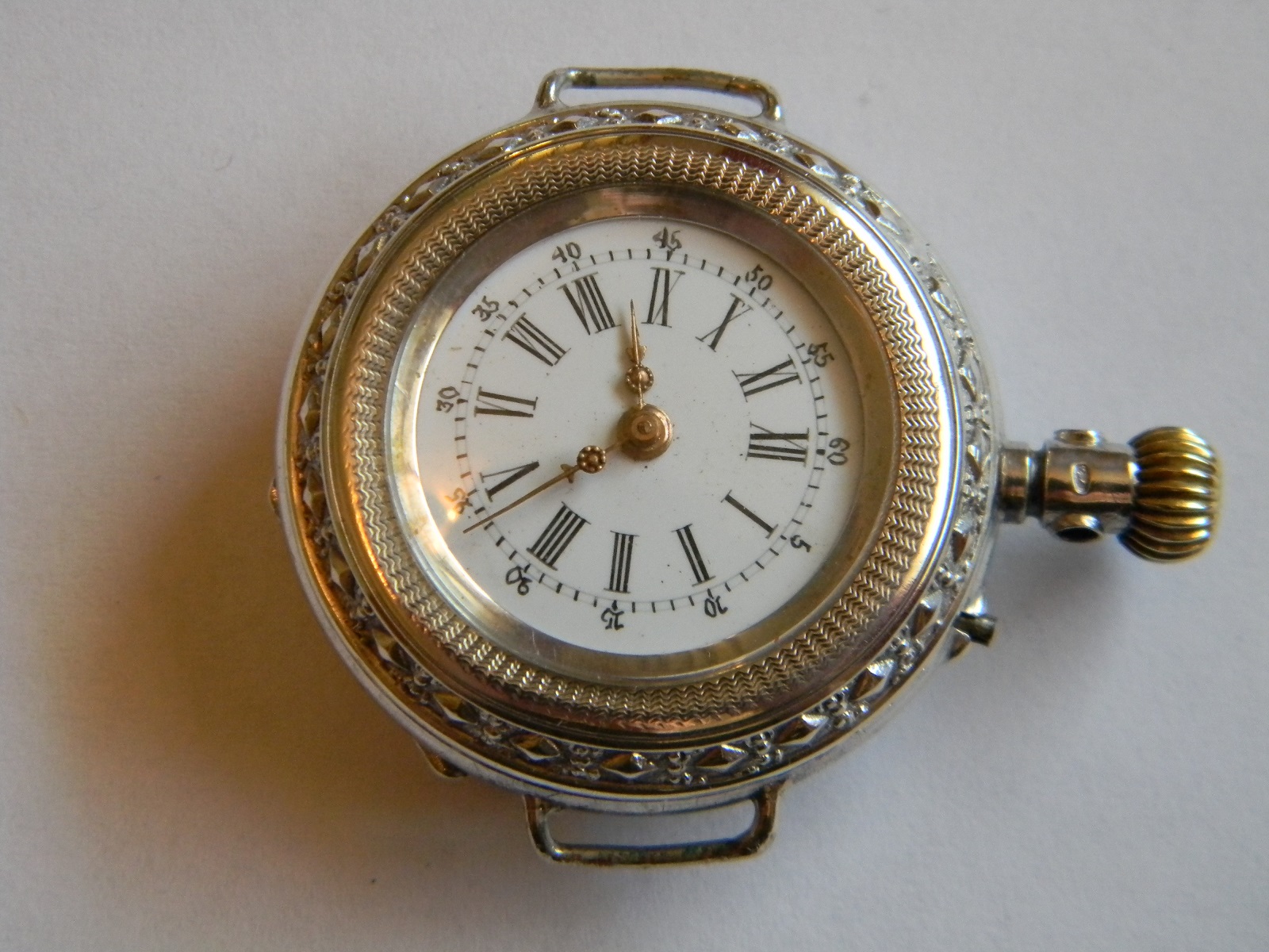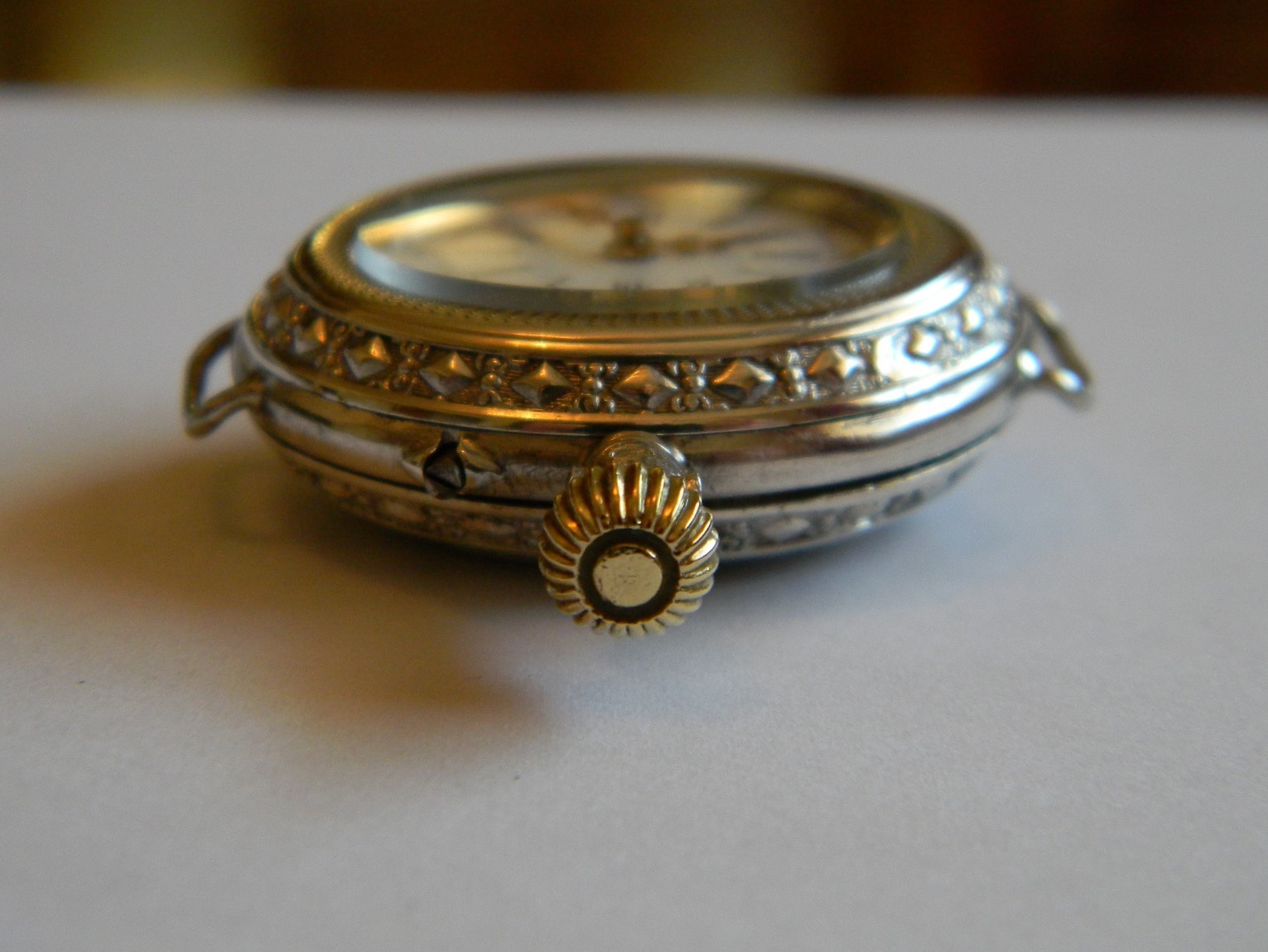 Modified from a pocket watch to a wristlet with added silver wire lugs