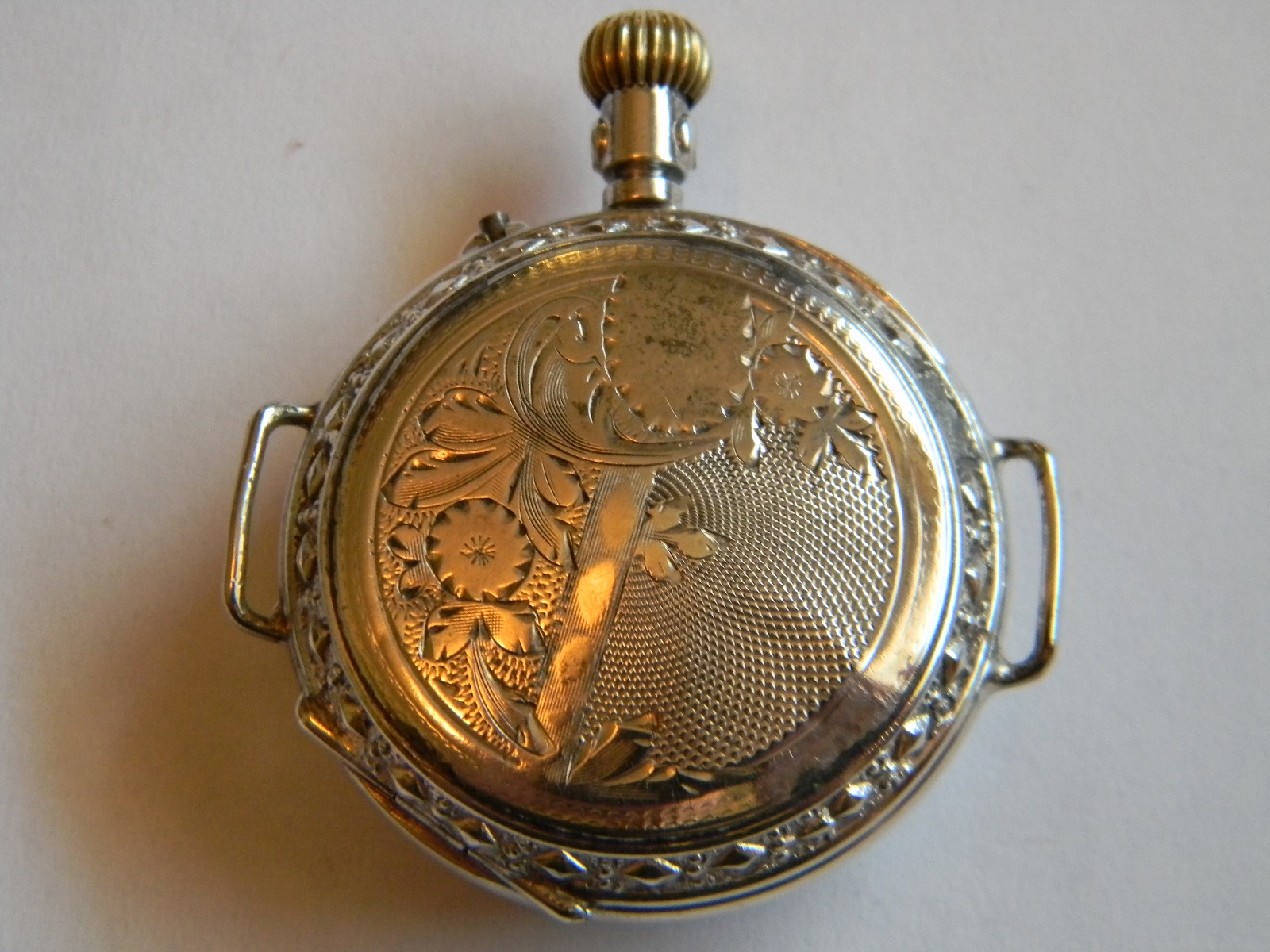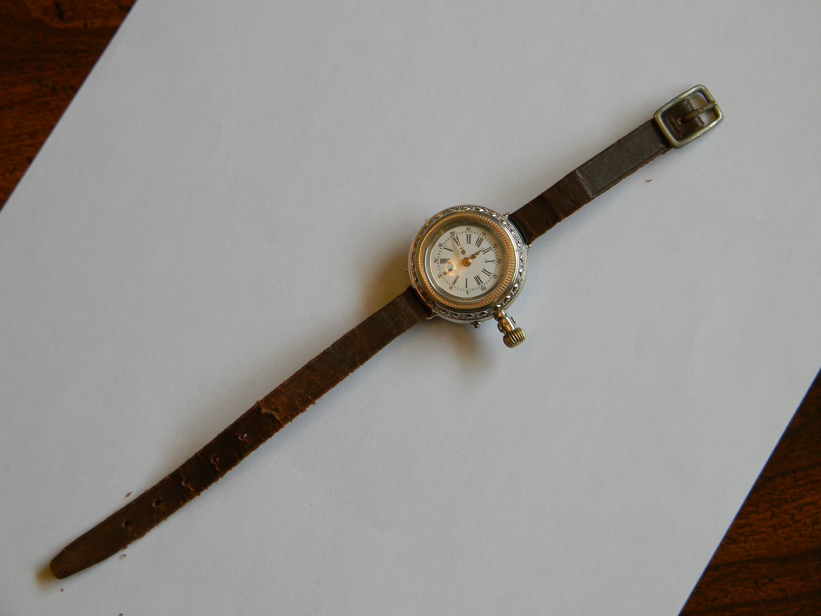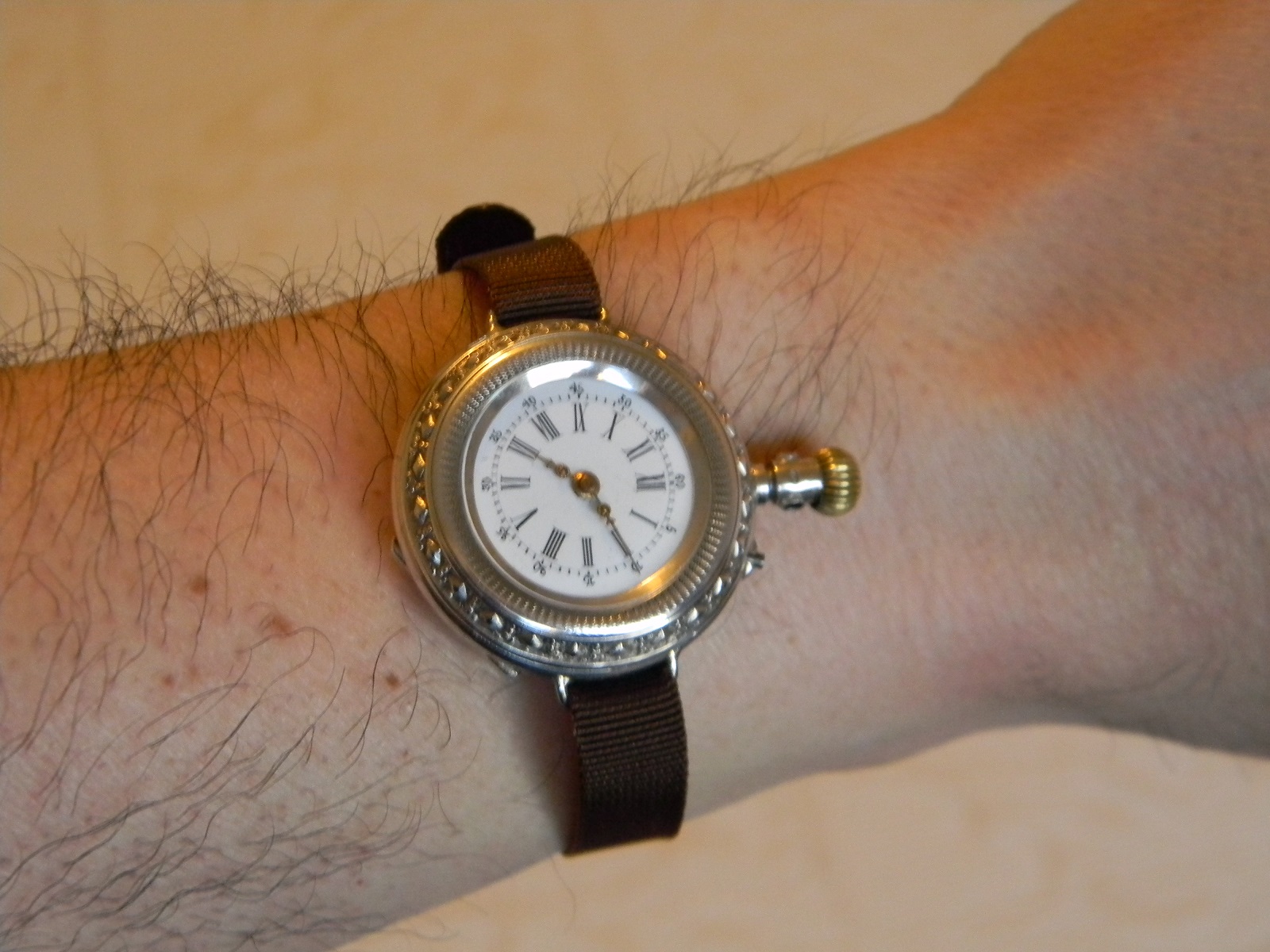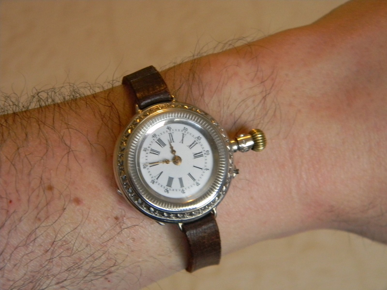 Modified from a pocket watch to a wristlet with added silver wire lugs