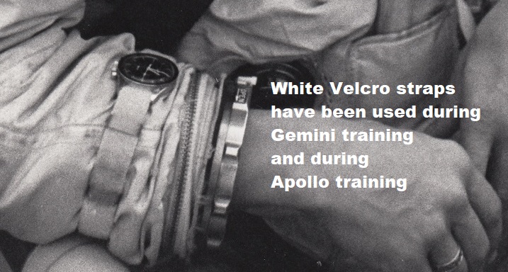 On Mercury flights, astronauts wore stretchaable bracelets or steel mesh bracelets. During Gemini and Apollo training white velcro straps were used, while during actual flight, black velcro straps were used.