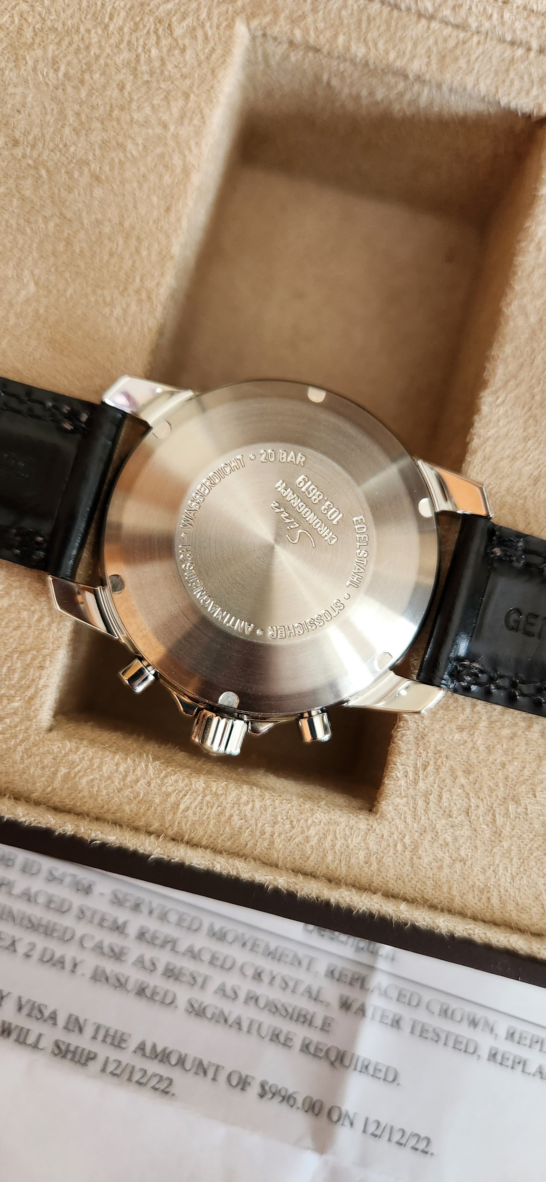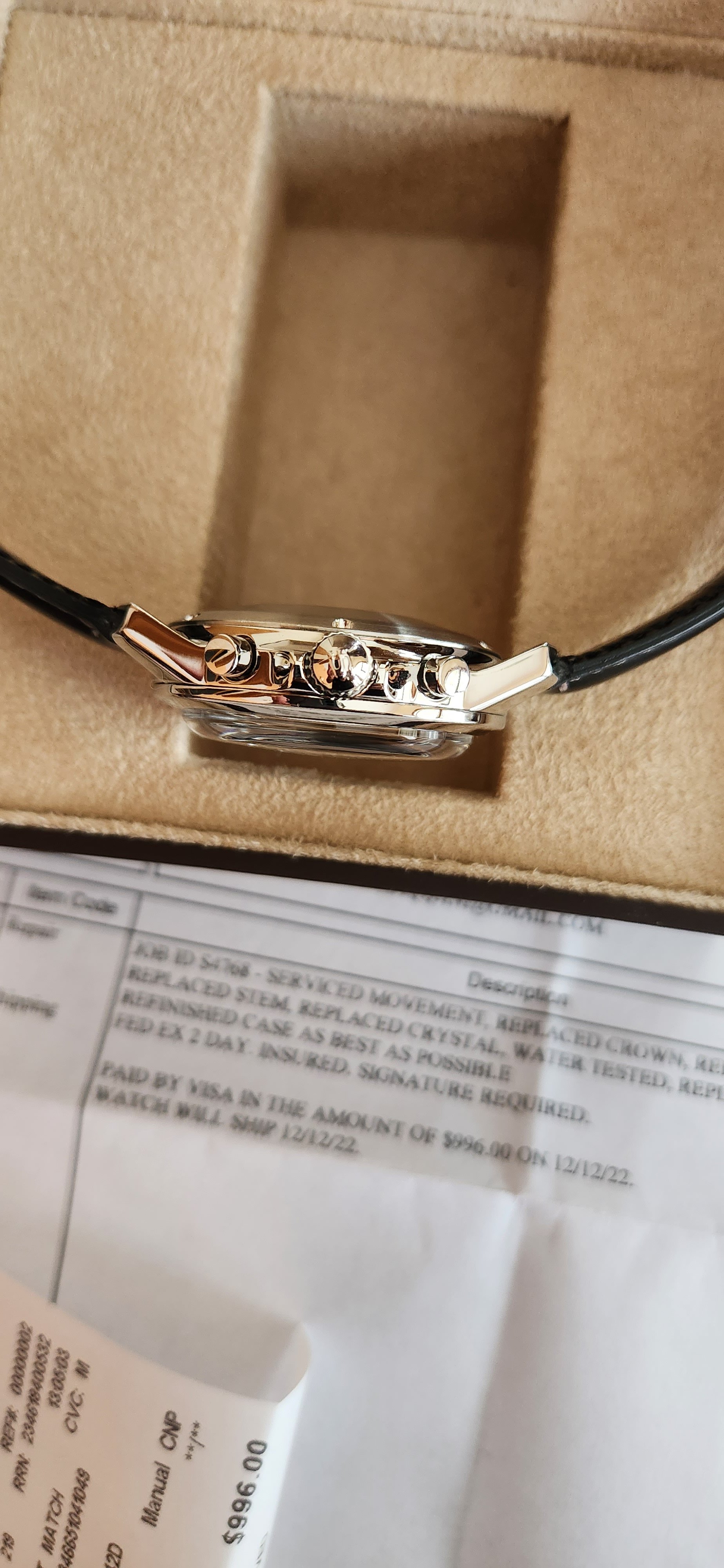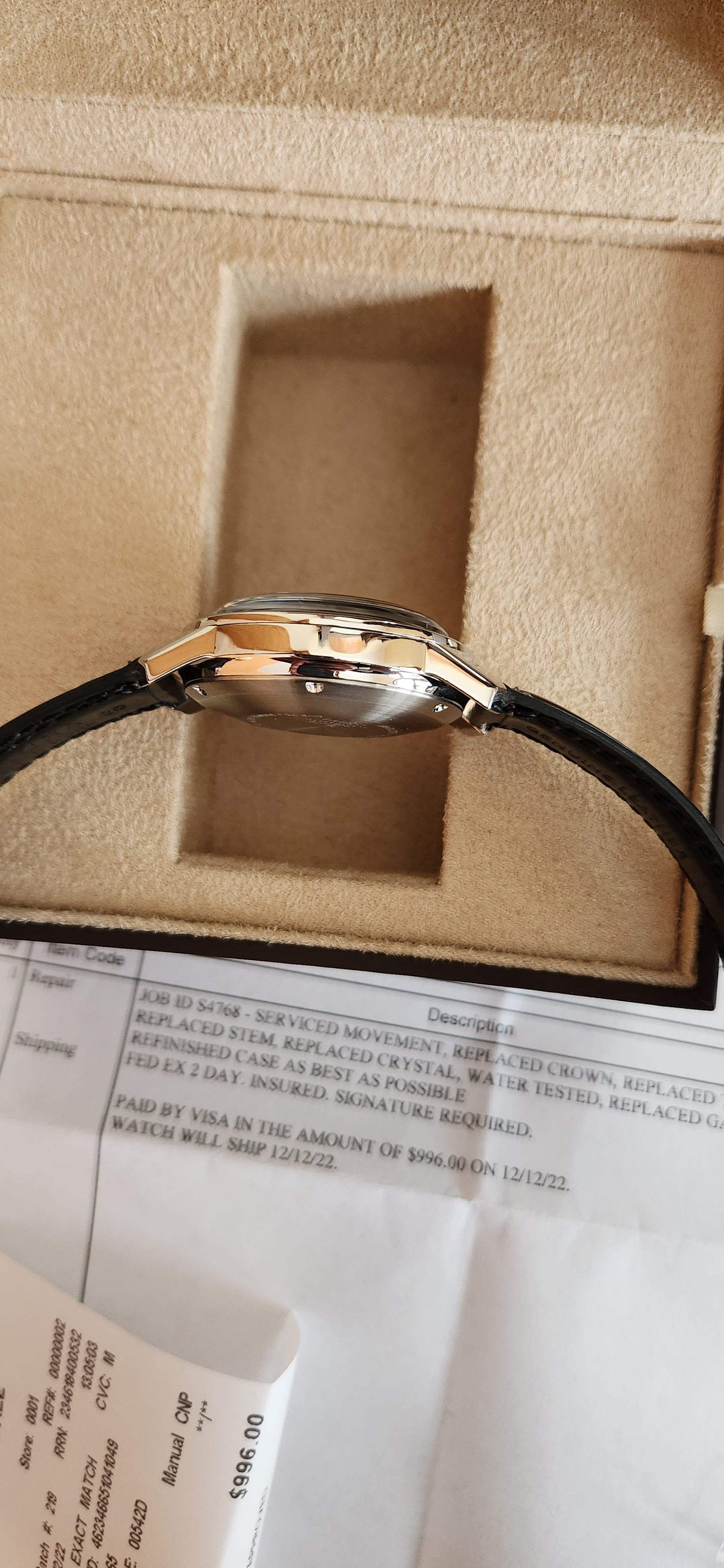 I opted for the premium service with every recommended part (cost $996). Under RGM warranty and I will include paperwork from RGM. Basically mint condition. Will come in a nice box bit I do not have original box or papers. Currently on a Mimosa strap but I will of course include the original strap as well. This is simply a beautiful piece and you will not find another one in this shape.