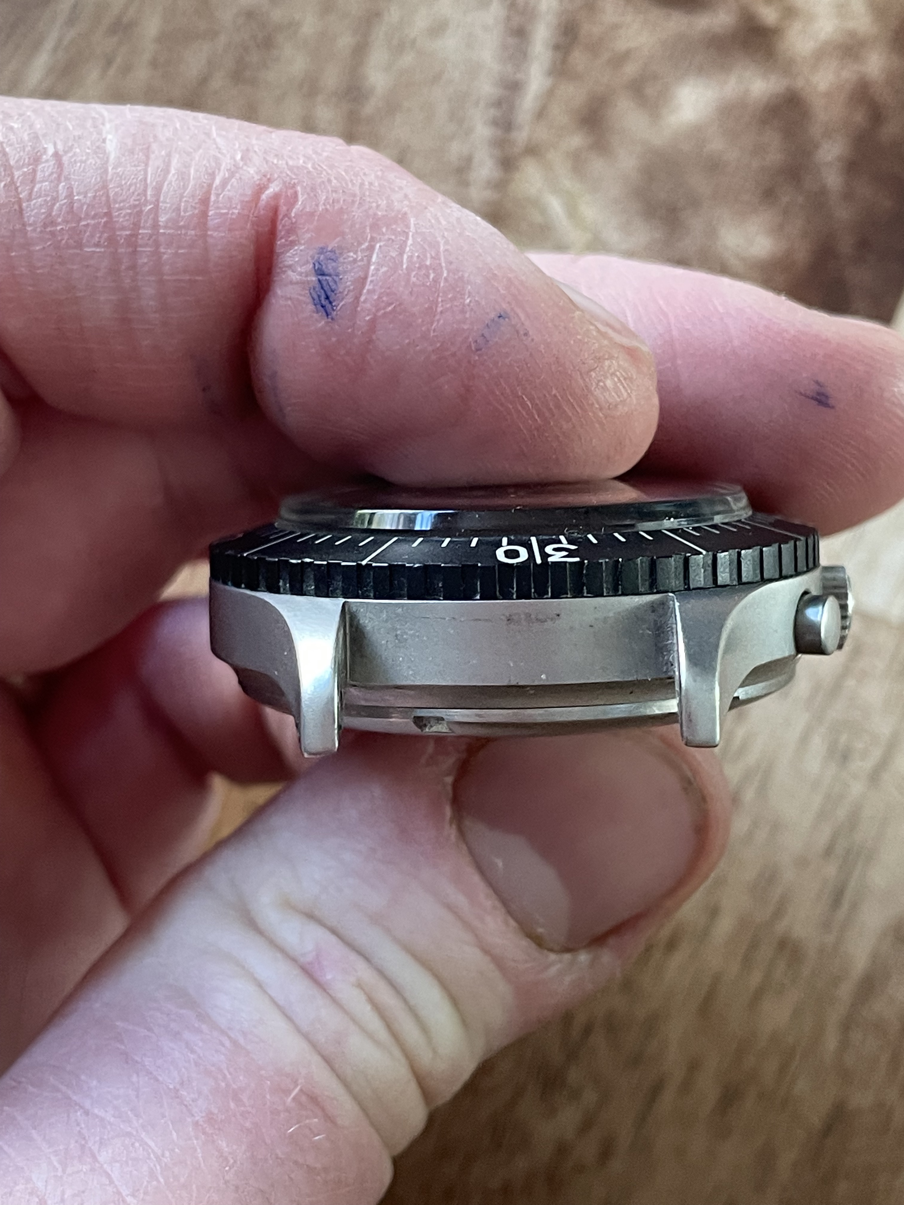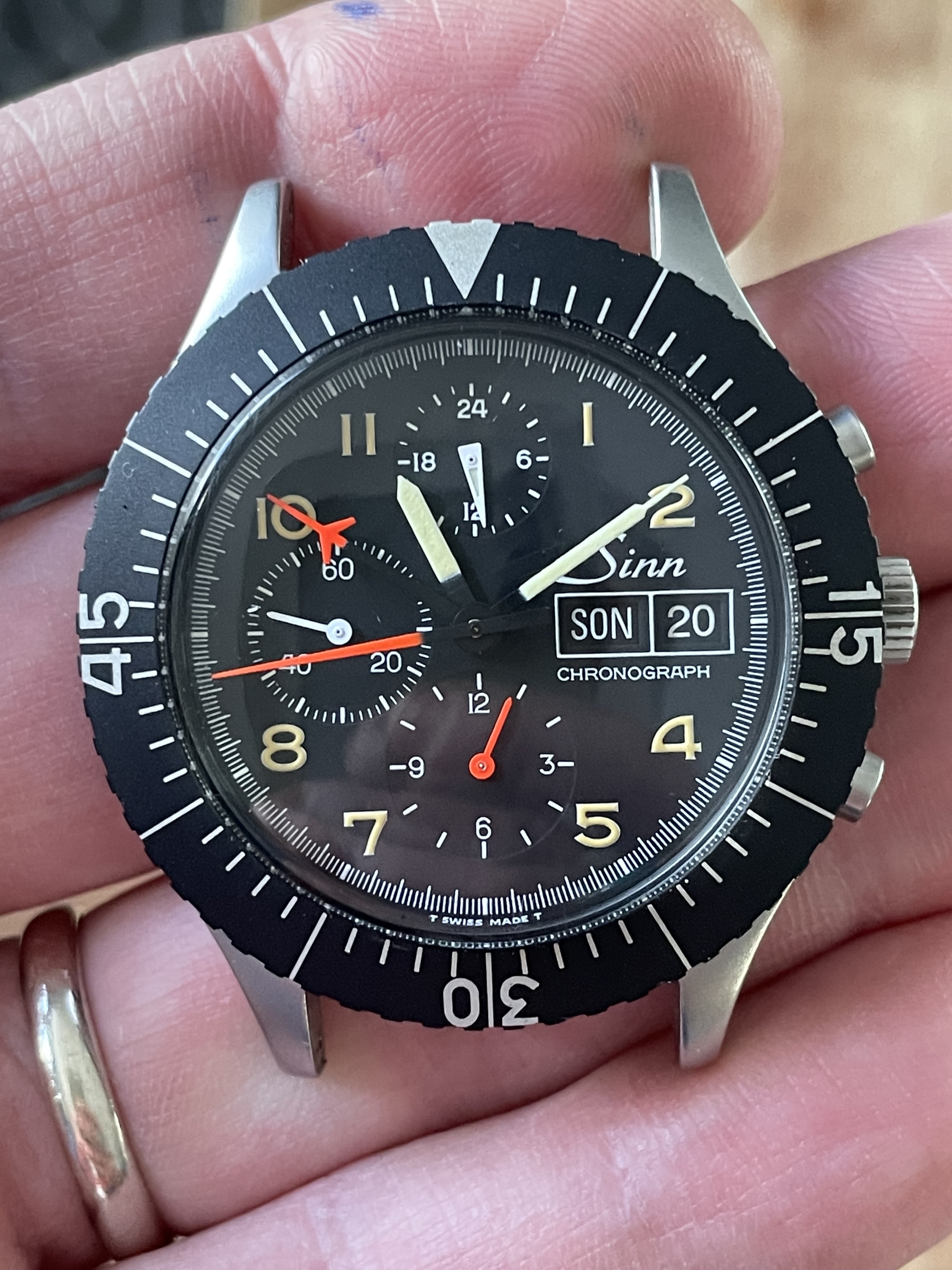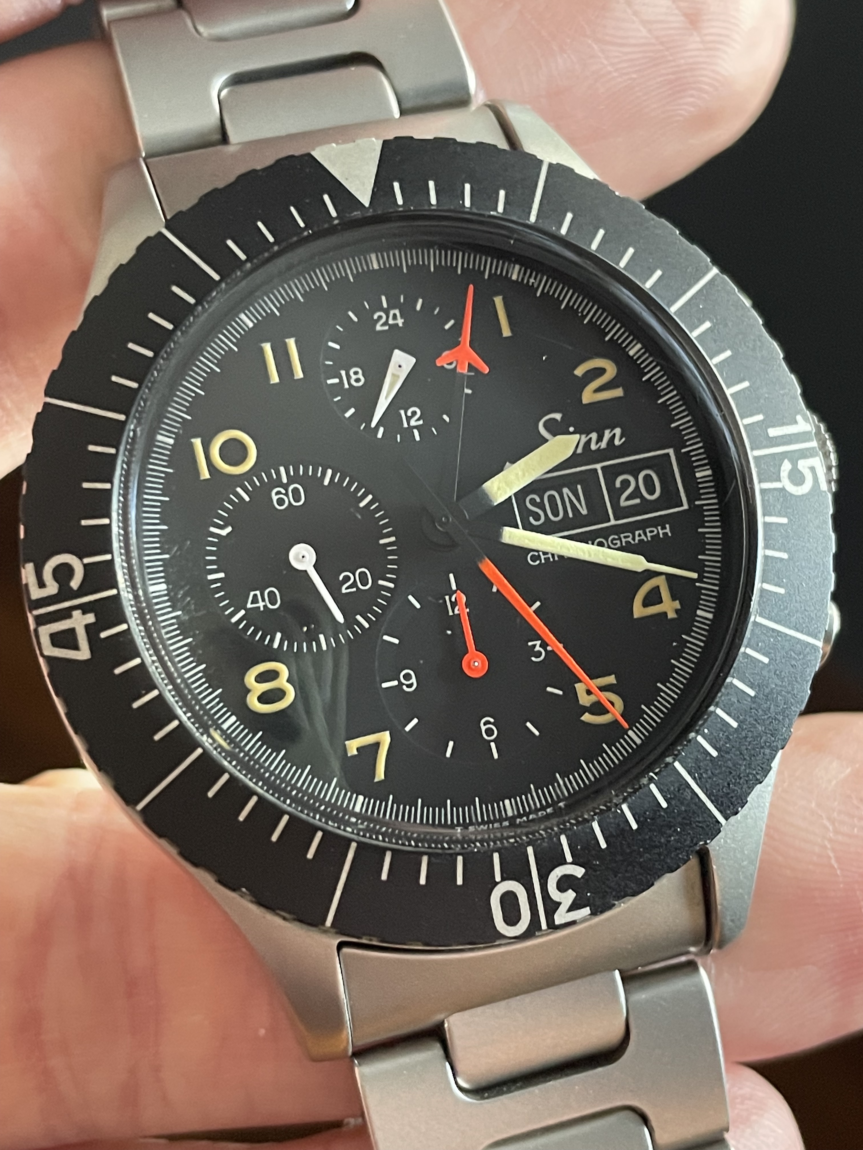 DIAL+HANDS: The lume has aged just slightly darker on the markers than the hands but everything glows and fades identically. There’s no mark I can see anywhere, and everything’s crisp and original. The date wheel seems to be in German.