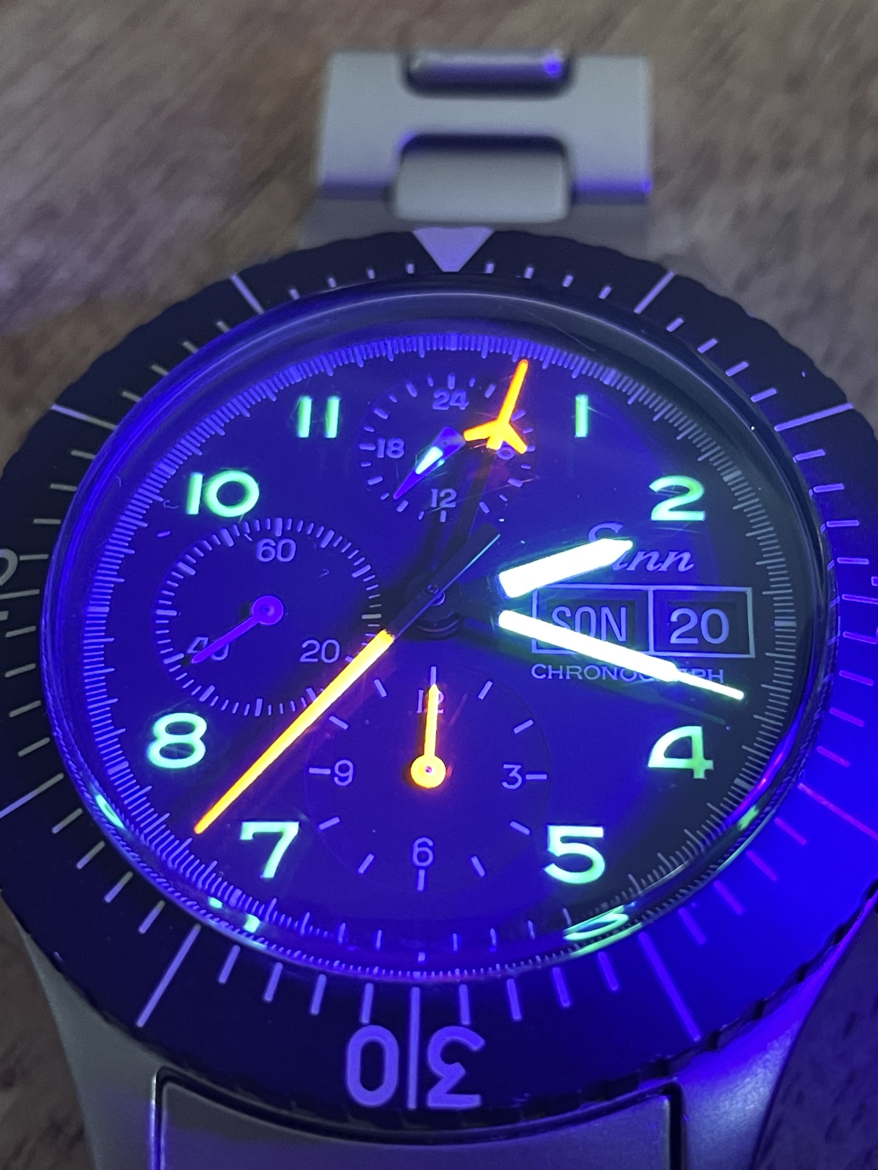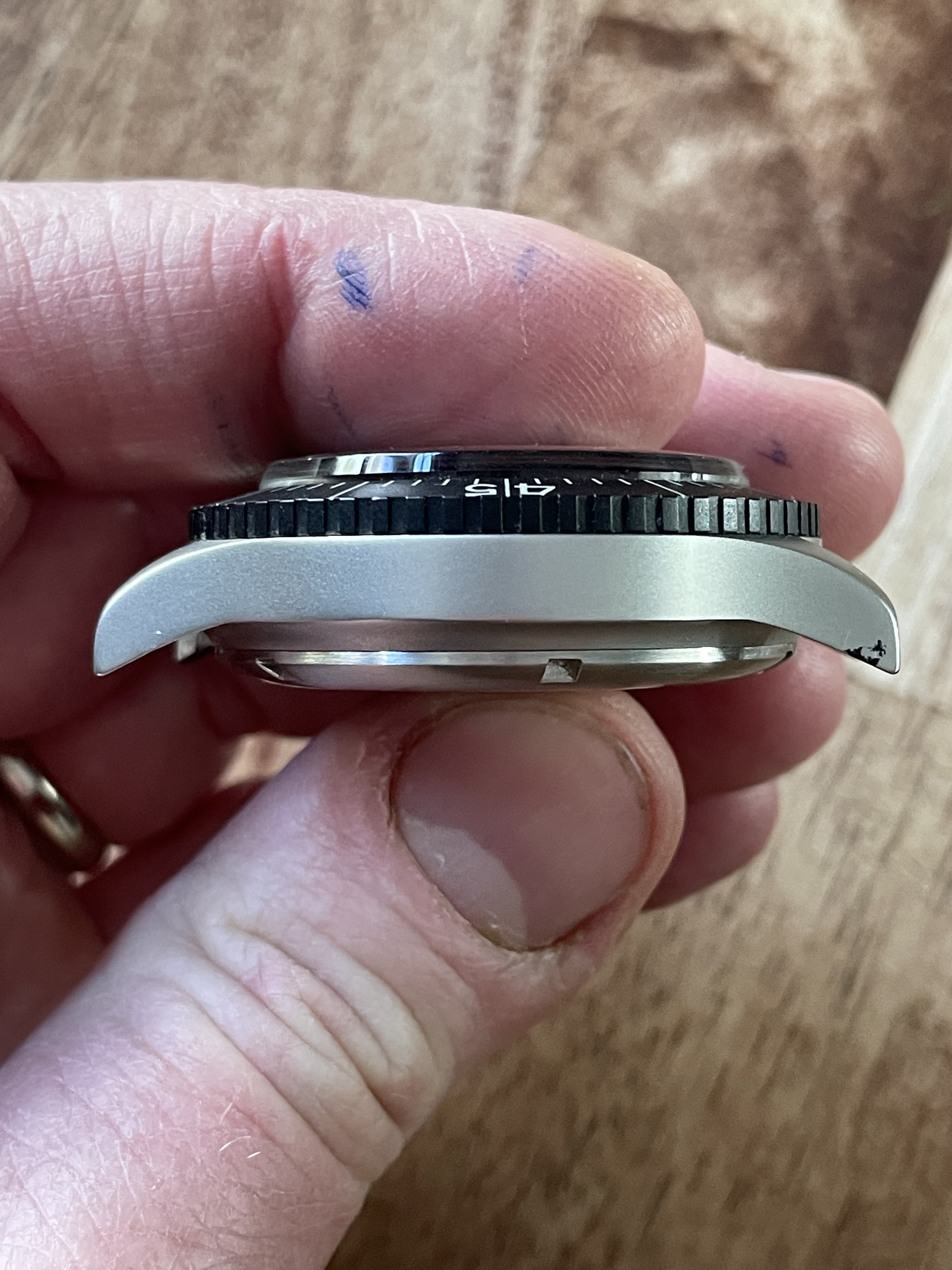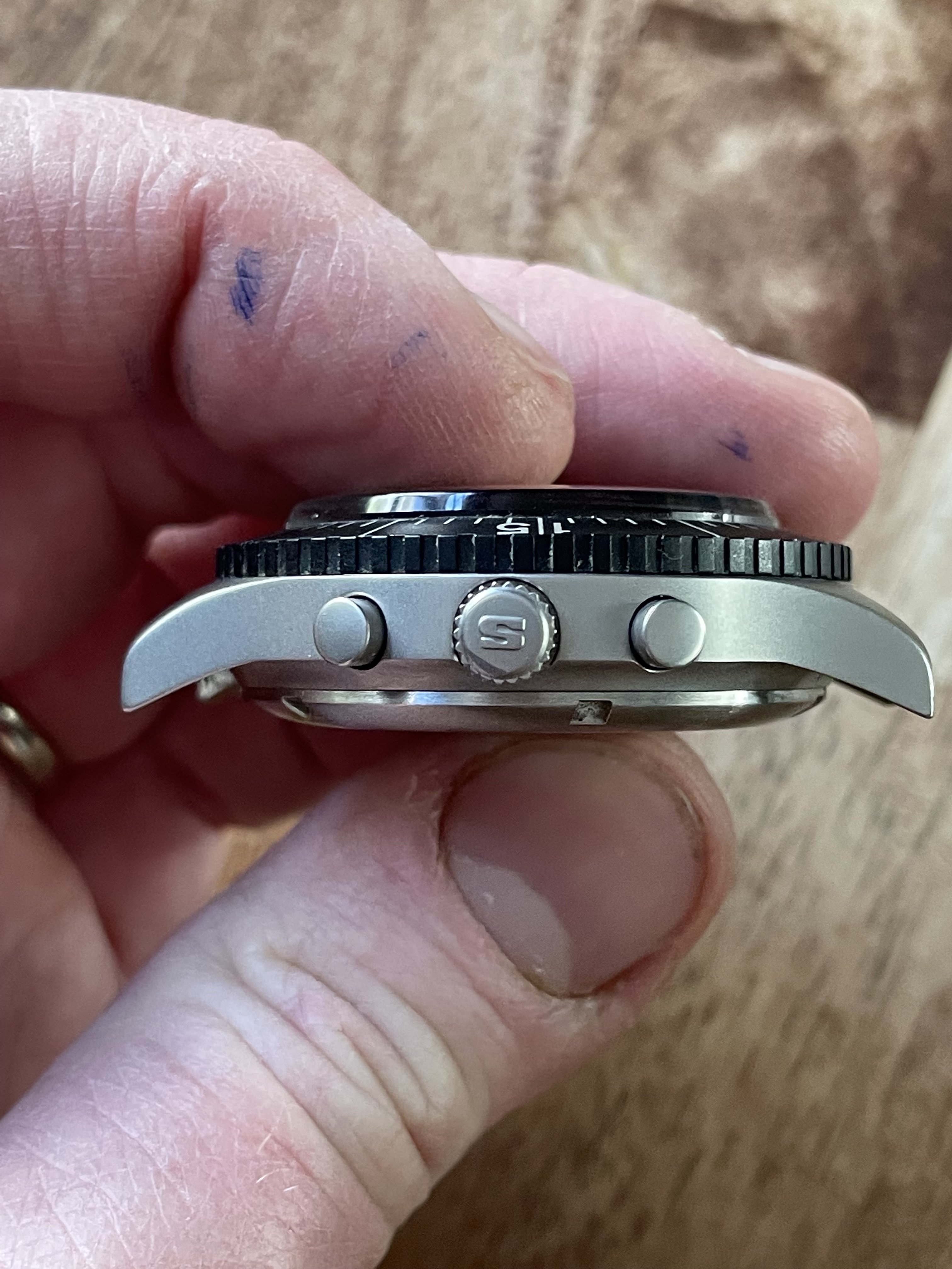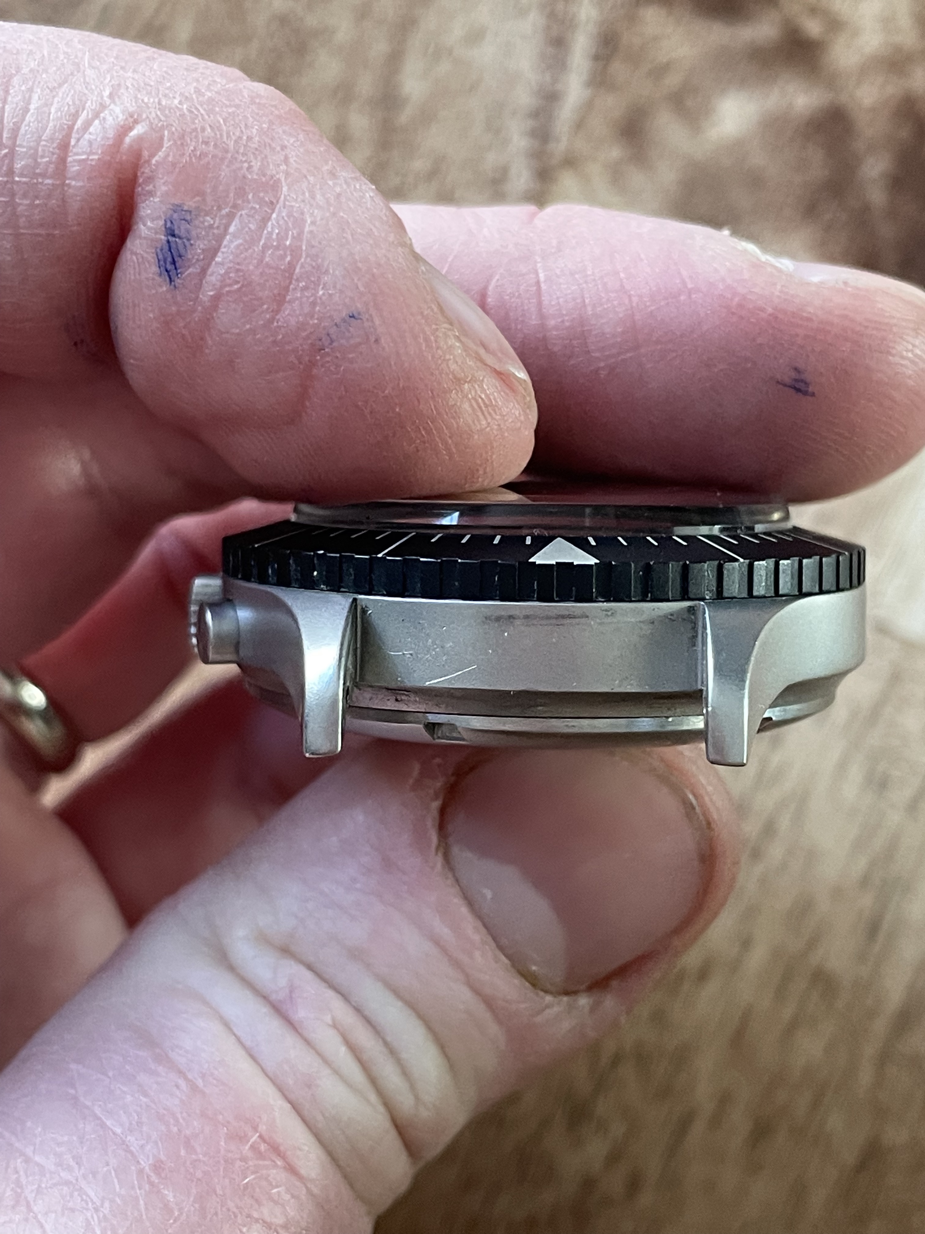 DIAL+HANDS: The lume has aged just slightly darker on the markers than the hands but everything glows and fades identically. There’s no mark I can see anywhere, and everything’s crisp and original. The date wheel seems to be in German.