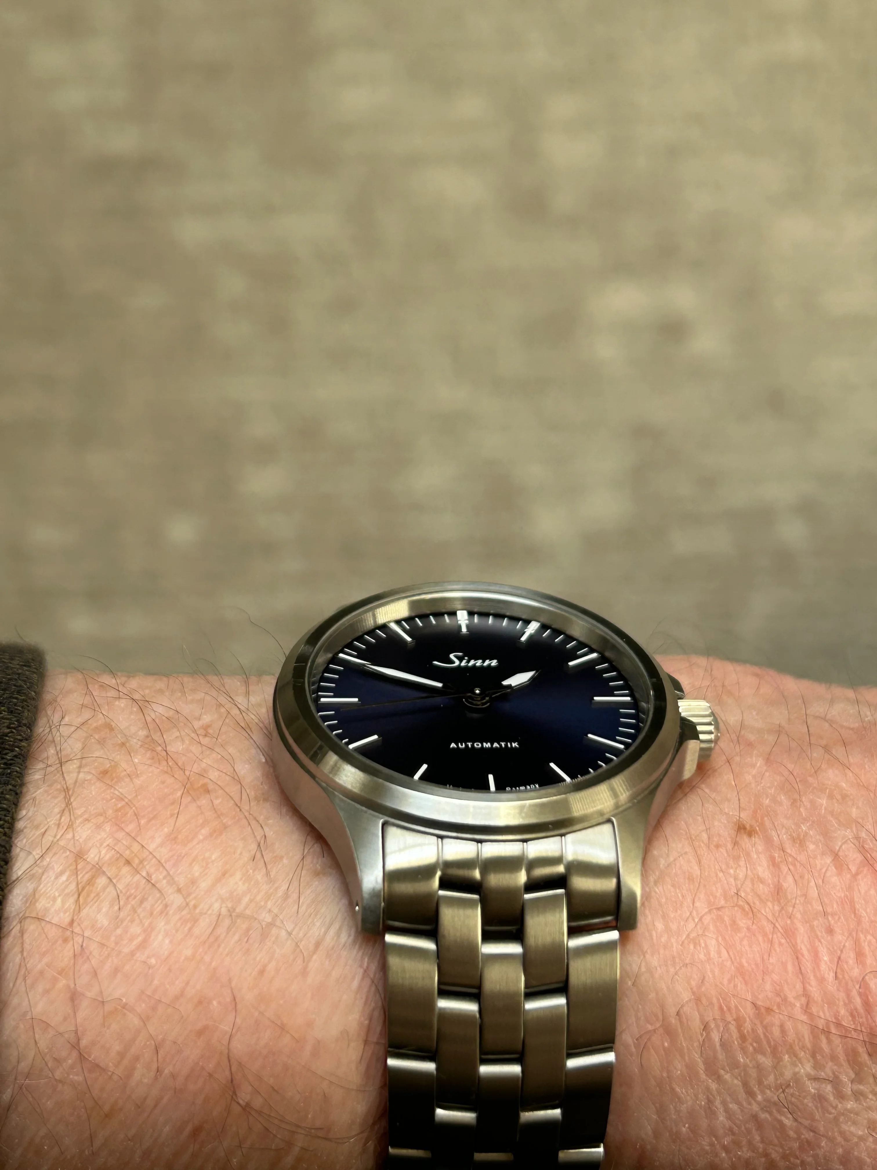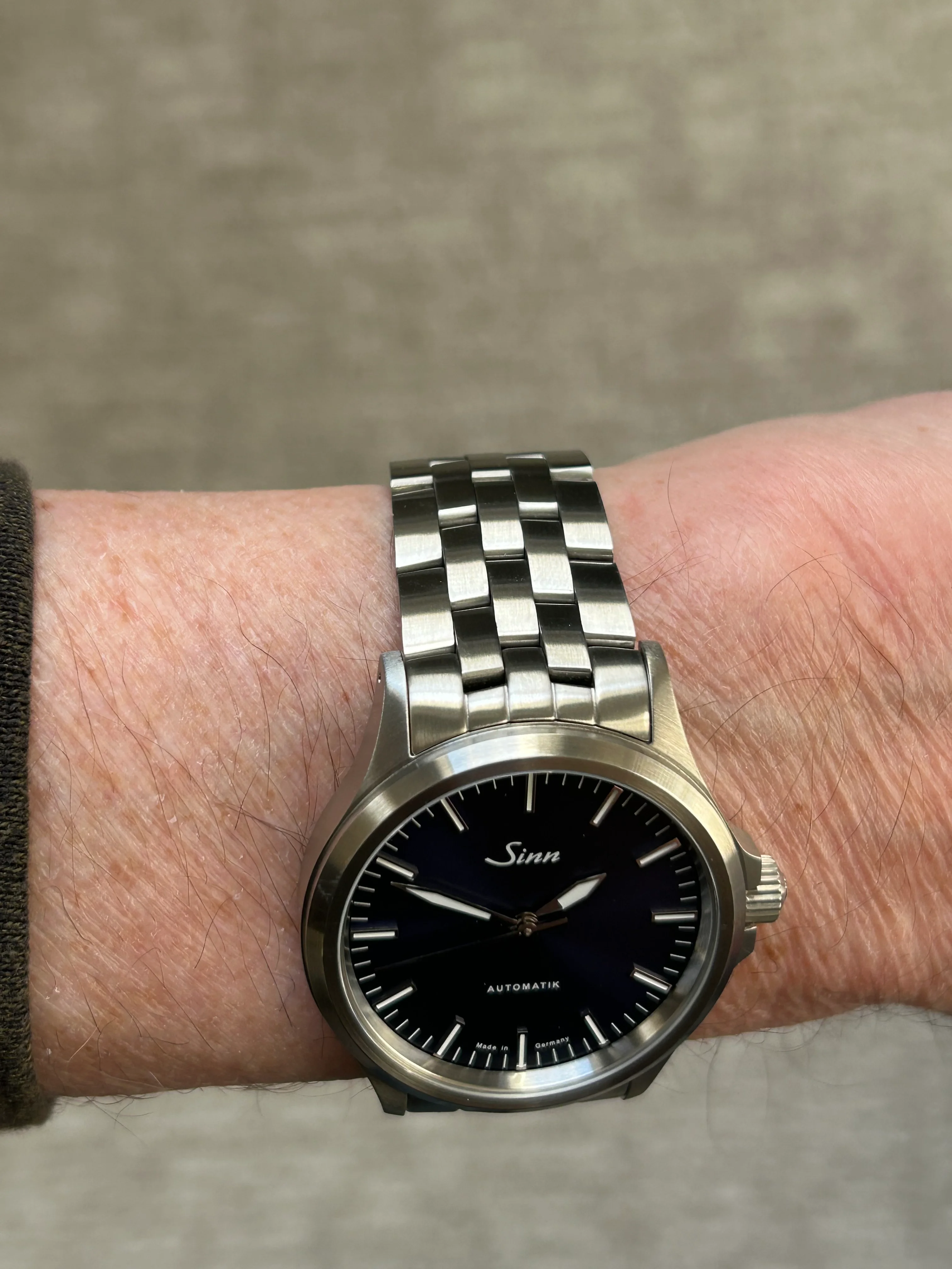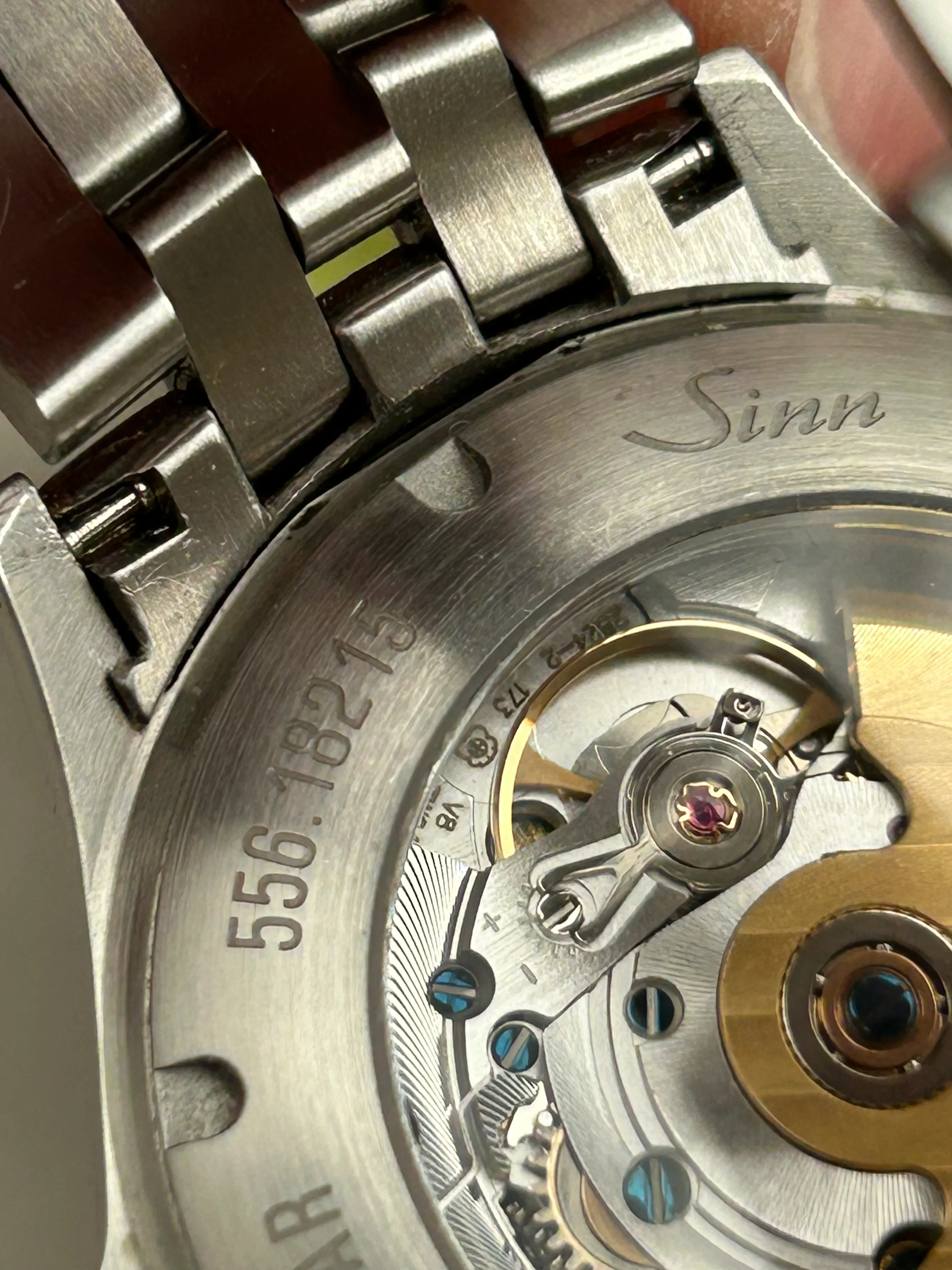 I’ve owned this watch and the black 556i and this one definitely feels like an upgrade. Same 38.5mm stainless steel case, no date, but with rhodium applied dial markers, and hands. Has the 25 jewel ETA 2824-2 movement. Deep blue sunray dial that can appear dark blue to almost black depending on the lighting. It’s on the Sinn Fine-Link bracelet sized for a 7.25 inch wrist, and includes 2 extra links. Double AR sapphire crystal is clear, no marks. Has sapphire crystal on caseback.