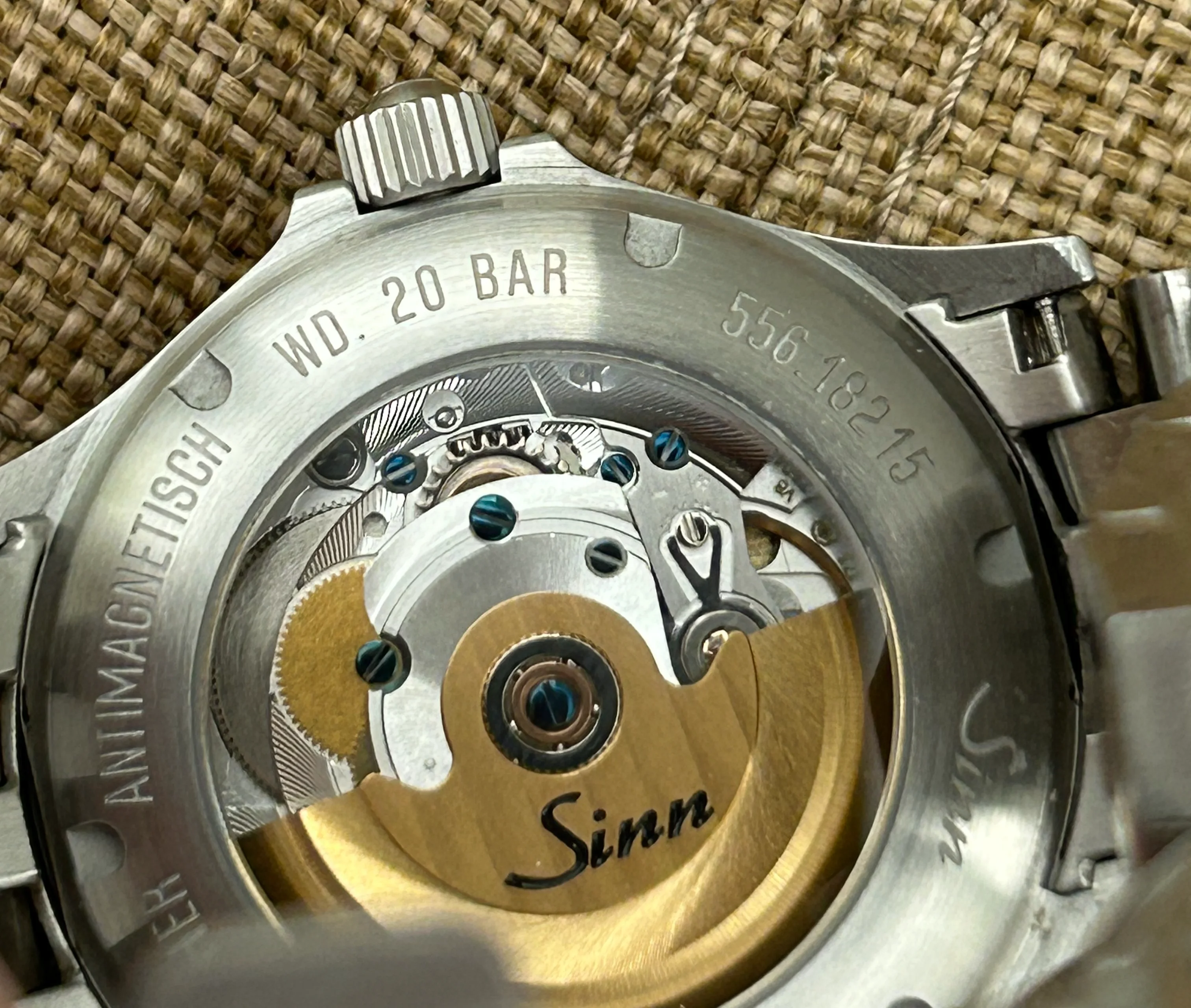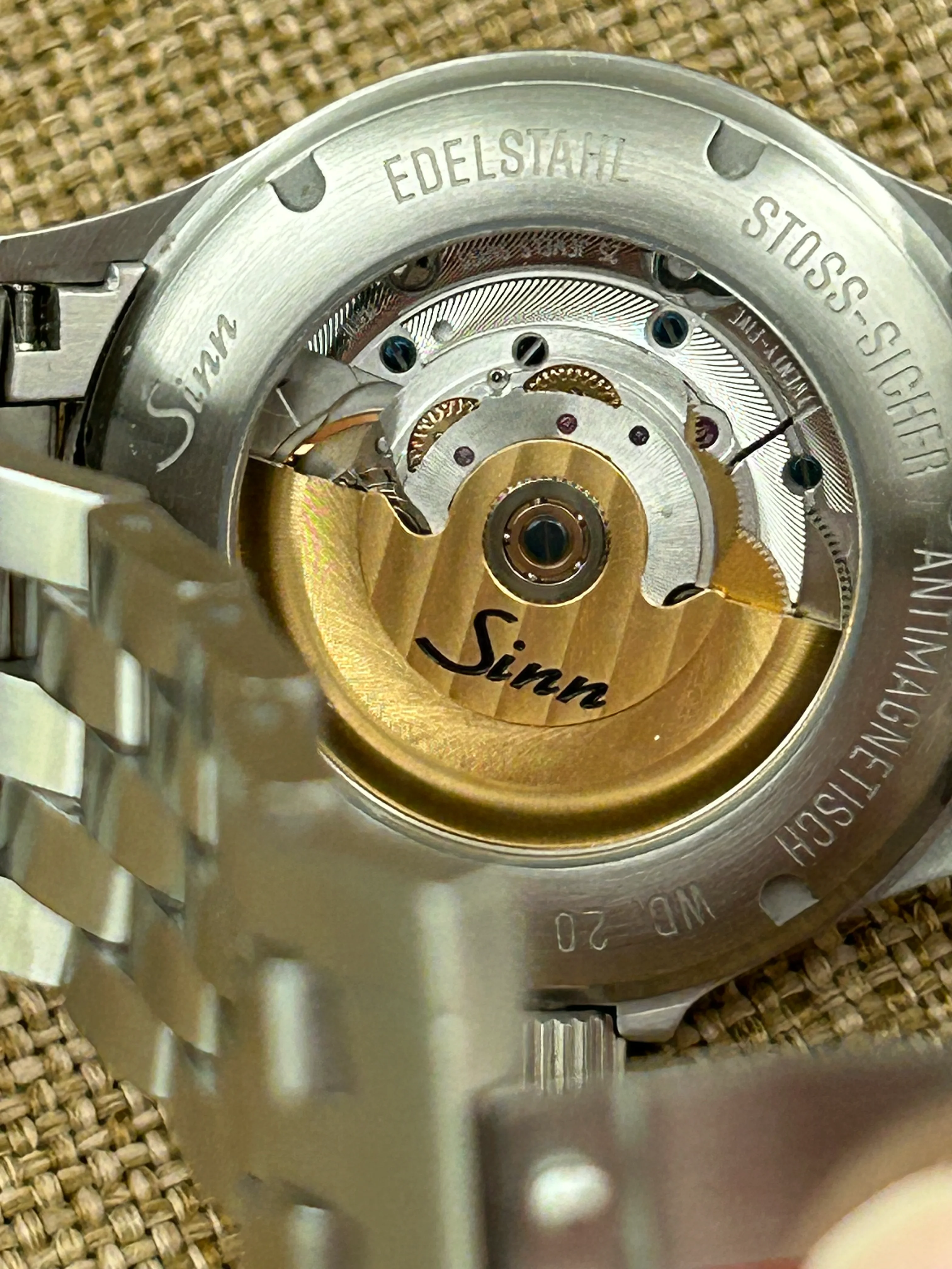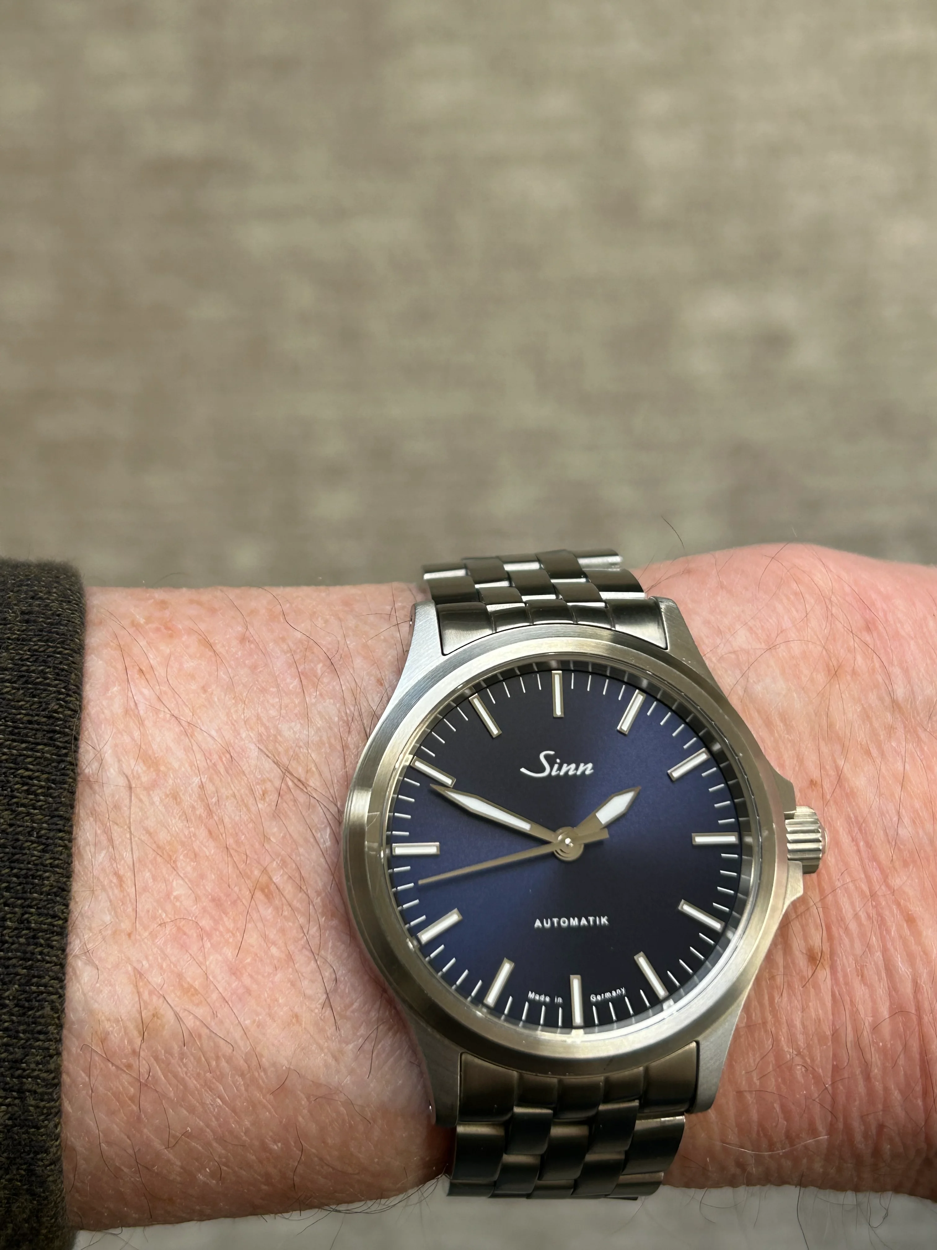 I’ve owned this watch and the black 556i and this one definitely feels like an upgrade. Same 38.5mm stainless steel case, no date, but with rhodium applied dial markers, and hands. Has the 25 jewel ETA 2824-2 movement. Deep blue sunray dial that can appear dark blue to almost black depending on the lighting. It’s on the Sinn Fine-Link bracelet sized for a 7.25 inch wrist, and includes 2 extra links. Double AR sapphire crystal is clear, no marks. Has sapphire crystal on caseback.