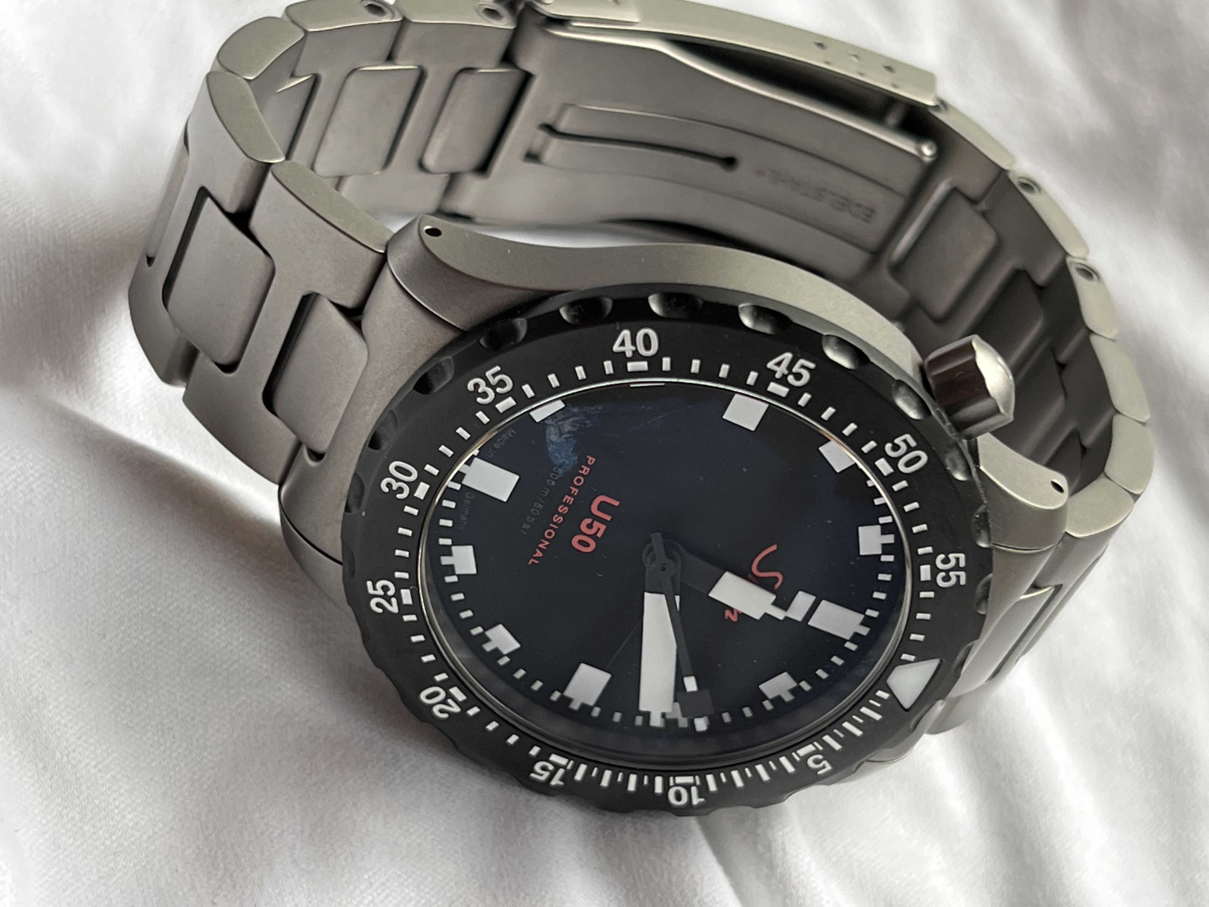 I purchased this watch directly from Watchbuys in 2022, and it has been used sparingly since then. Case, crystal and even bracelet are in immaculate condition. Crown and bezel operate precisely and timekeeping is excellent at +4 or so depending on position. The lume is superbly bright and long-lasting, and this U50 also boasts an extended PR of 56 hours.