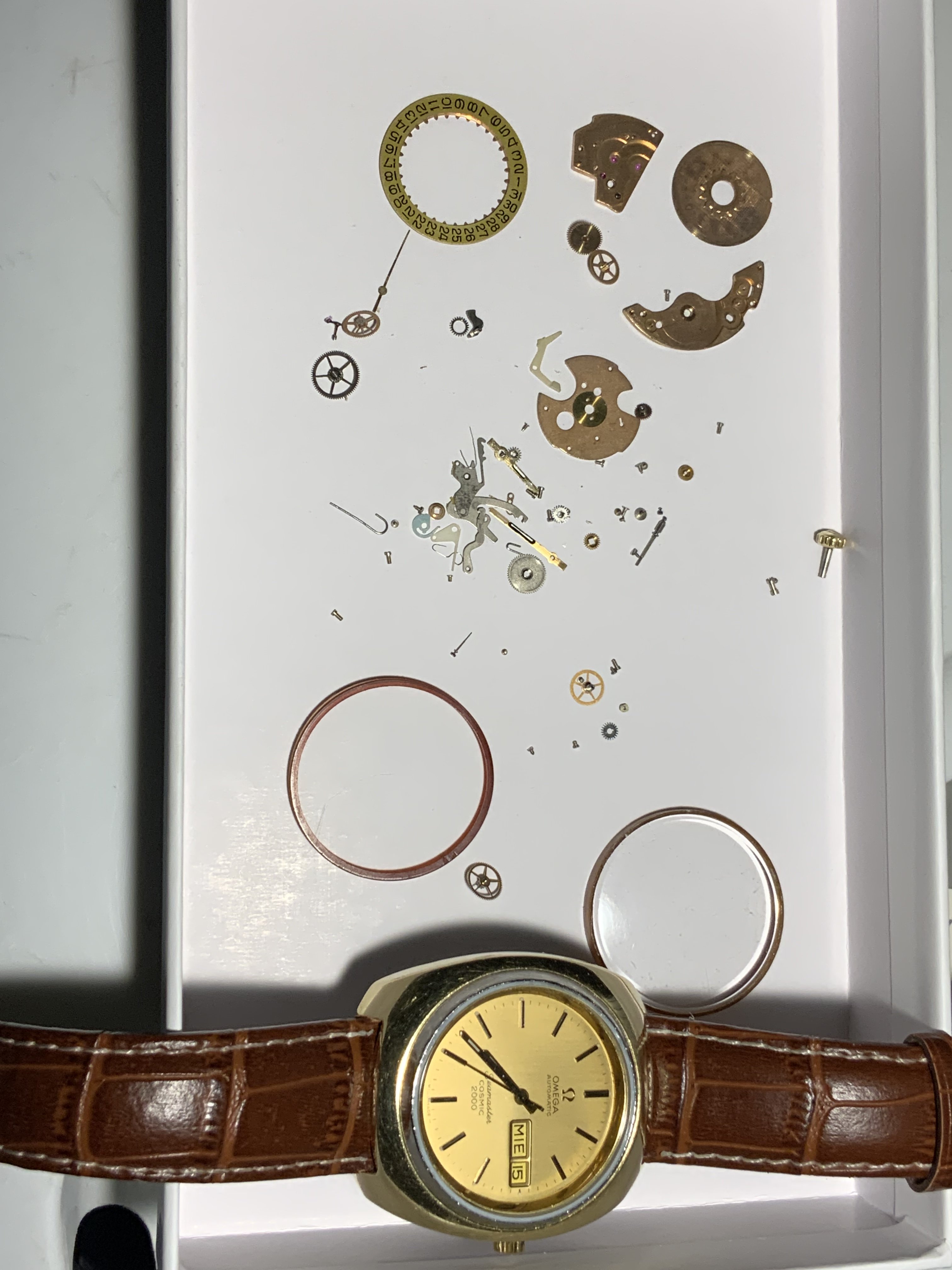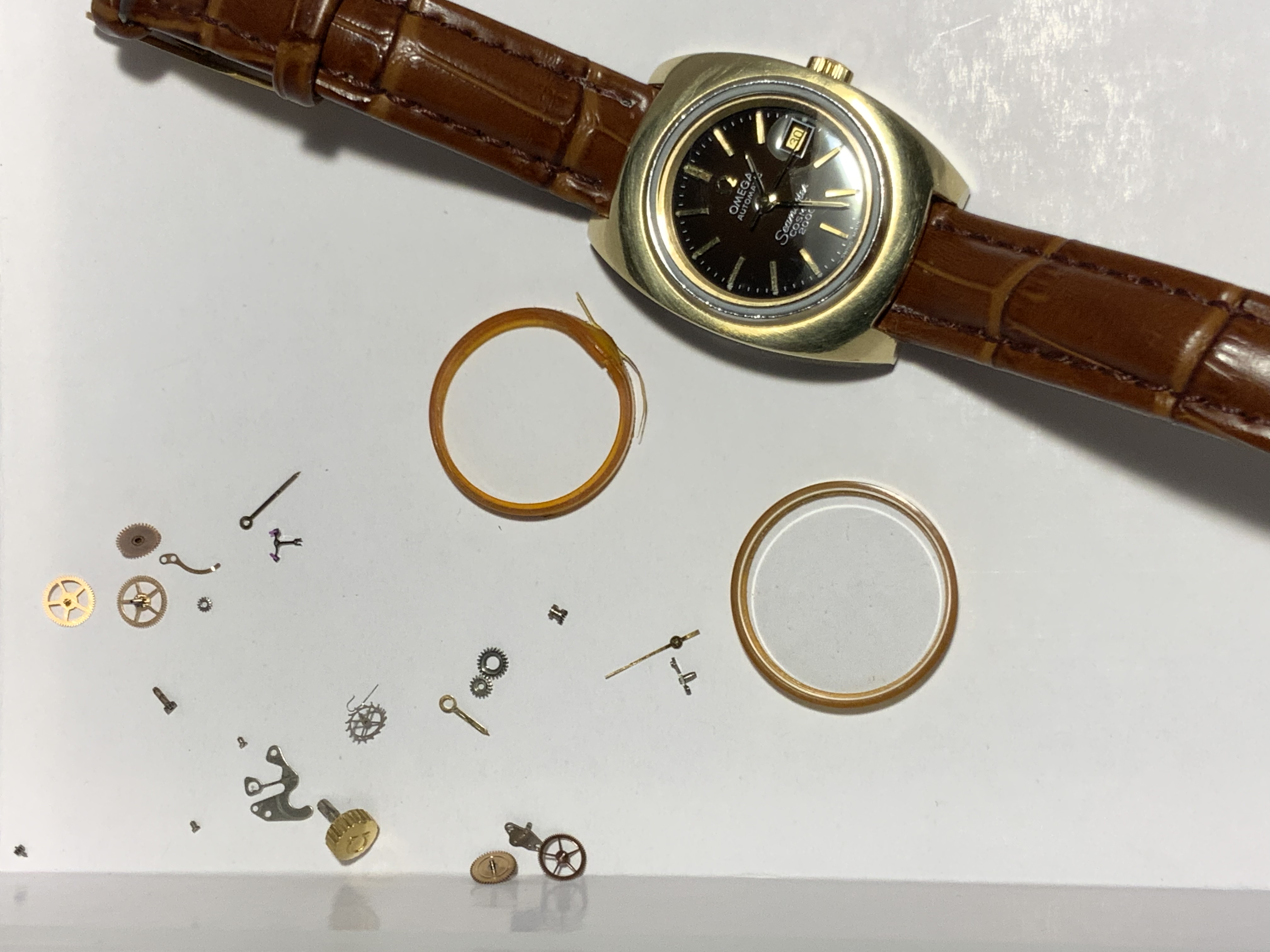 I would like to share my experience of two Seamaster Cosmic 2000 (weird, not so popular Banana casing) serviced (his and her sort of), sent to Switzerland via local OB. Here are the photos of components they replaced. I guess some of those parts are almost not available in US.