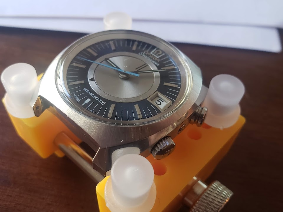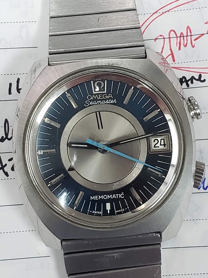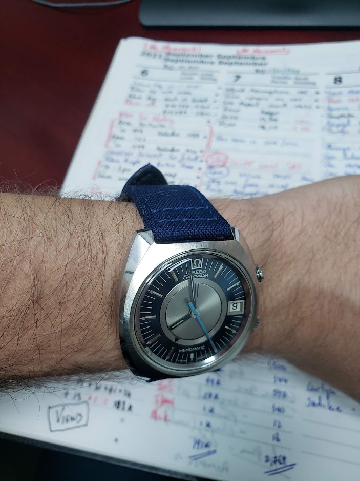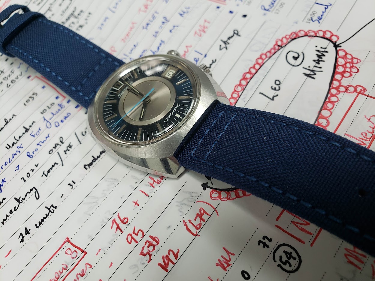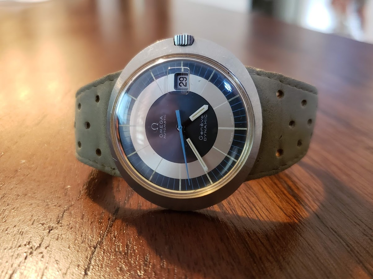 I was drawn to two models, the Memomatic and Dynamic Geneve, both with blue and white dials (Bullseye).