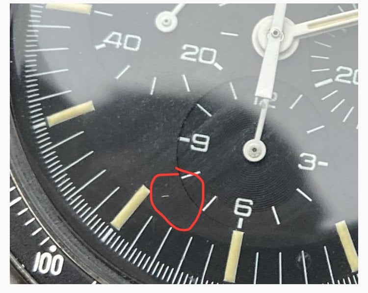 Recently I bought a Speedmaster 145.022. Superhappy with it. It has a small mark on the dial, right top above 7. It is very small, visible in certain angles because it seemed to have lost paint. Would it be wise to repair or just leave it as it is? The rest of the dial is pretty flawless.