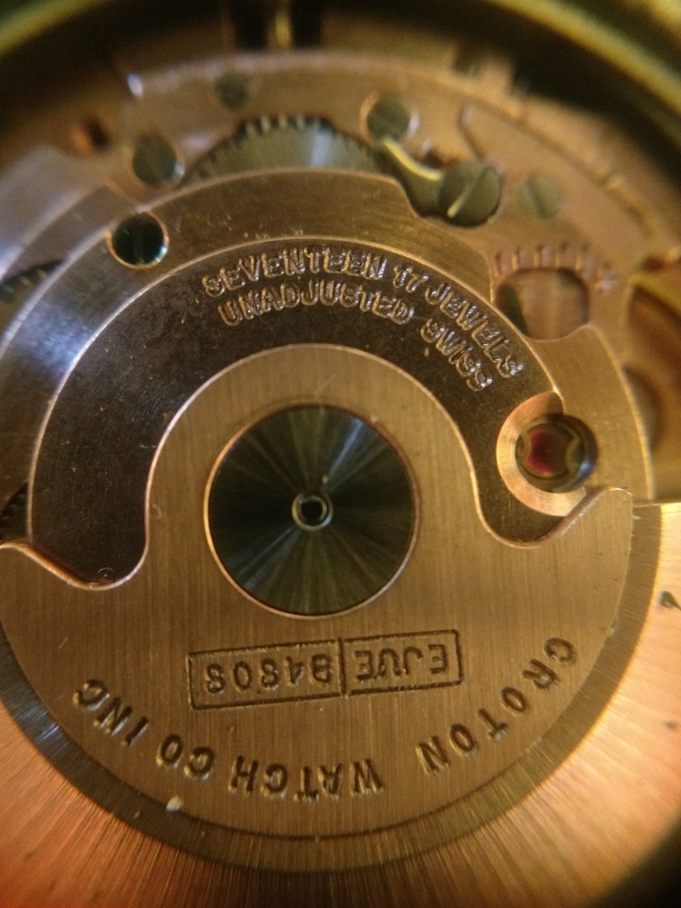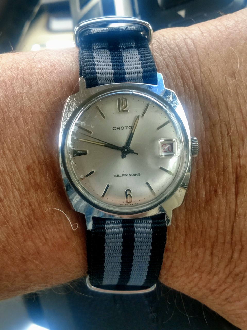Early 1960s Croton Selfwinding: 32.4mm square case, 37.5mm lug-to-lug, 10mm thick case back to top of crystal, 17mm band, 17 jewels ETA 2472 automatic movement. Note the "Ra Swiss Ra" below the six o'clock marker denoting radium lume.