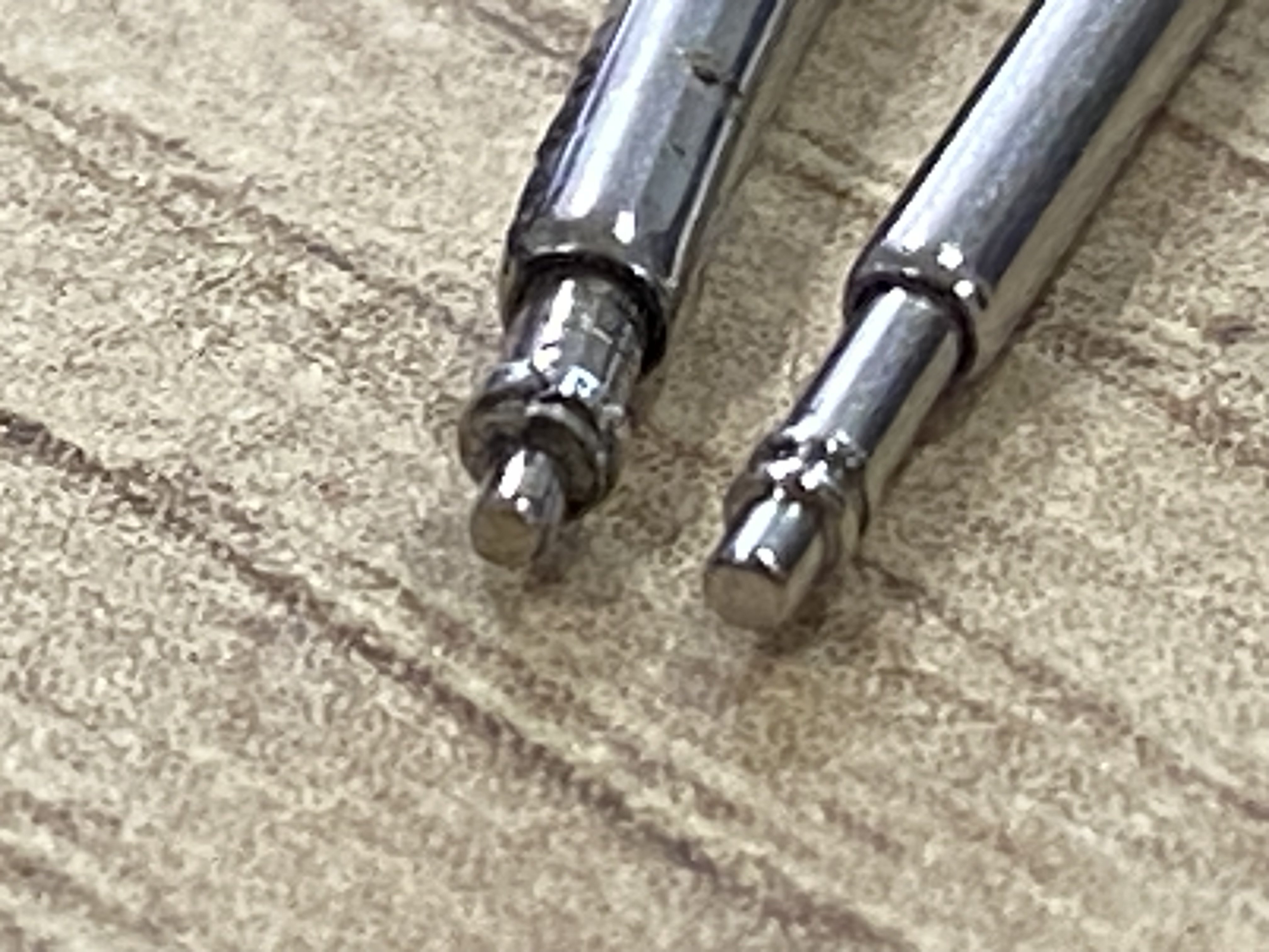 In the photo, the bar/tip on the left came with my watch (a 19mm lug-width JLC 140.8.93.S), and the one on the right is a 1.5mm quick release bar from Delugs, but the tip itself is too large to fit into the hole in the lugs of the watch (when it's fully compressed, it can just squeak by width-wise, but the tip is still not fully recessed into the hole, so it wouldn't be very secure). Any suggestions would be greatly appreciated!