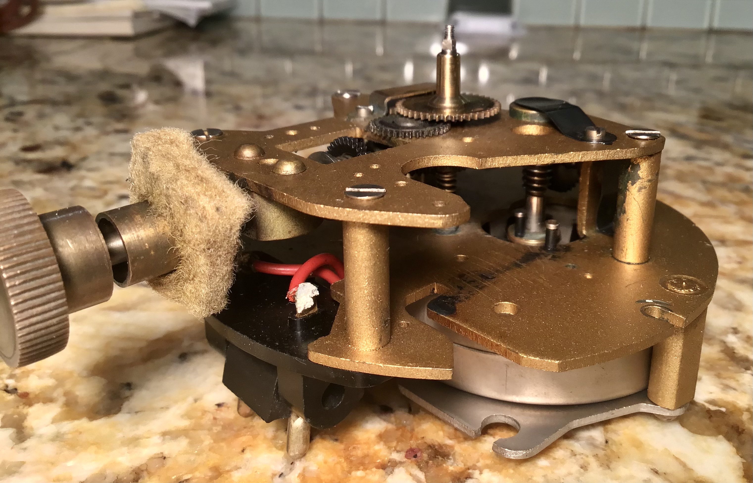 I recently acquired an ~85 year old Smiths wall clock with type 2 “deluxe” self starting movement. The synchronous motor starts right up and runs beautifully, but the spring mechanism for ensuring the self starting rotor rotates in one direction only, that being counter-clockwise (or anti-clockwise as you would say in UK) has detached. Is there anyone who could post a pic showing the detail of how this assembly is supposed to be fitted into place? I have attached a close up of the vicinity of the spring's placement and a pic of the three parts I found rattling around in the bakelite housing of the movement