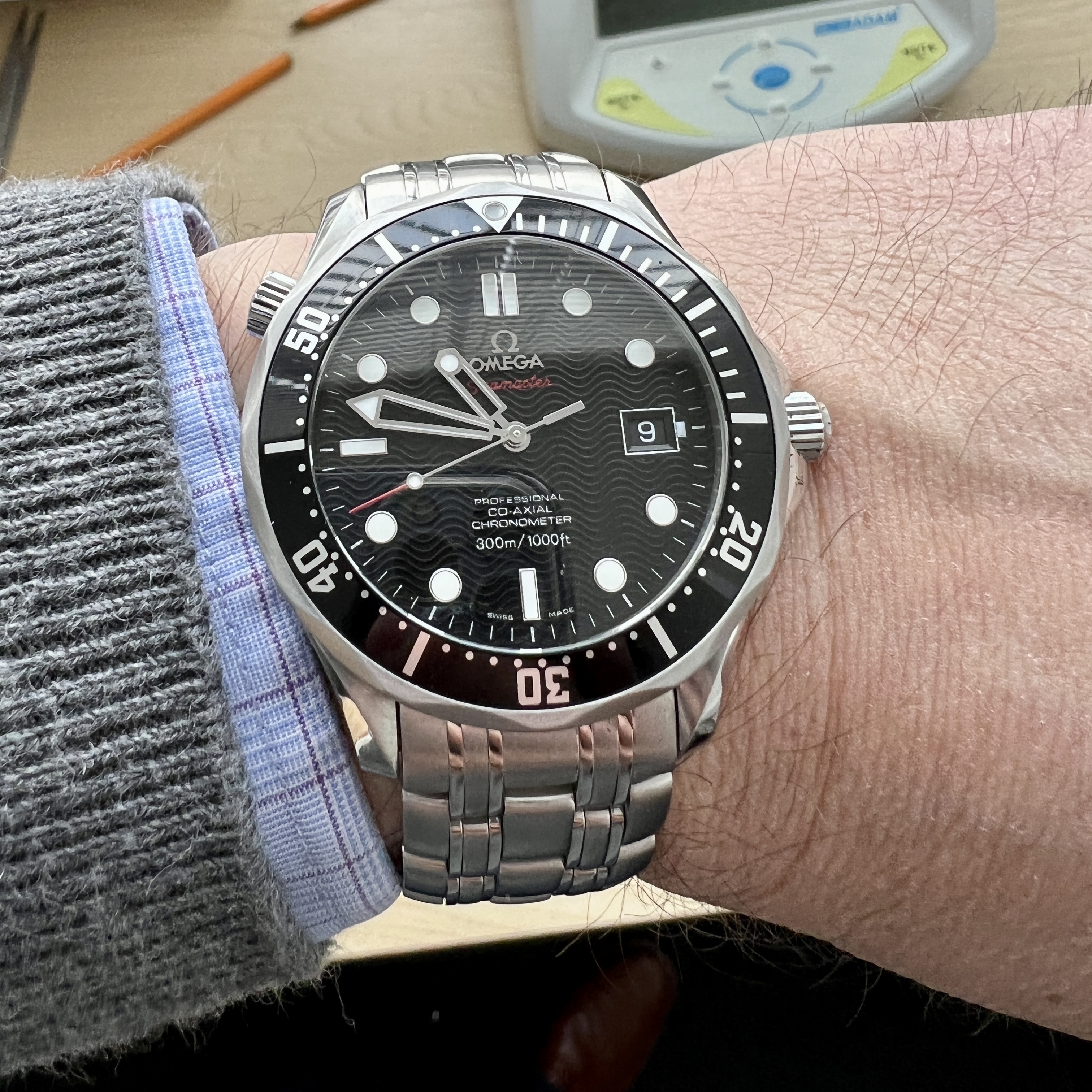 Here it is, fresh from a full overhaul at STS who never fail to do a tidy job: it looks and feels brand new The cost of the service was eye wateringly expensive as the bezel and crystal were replaced but this does have the advantage that it is now truly mint. The fully brushed finish is very very impressive in the flesh. It is a trick Omega repeated with the Speedy Tuesday 1 and really adds to the tool watch aesthetic, though ironically a fully polished finish would be easier to maintain as a wipe with a Cape Cod can sort most things on a polished finish, not so here. The titanium models have a similar matt look and it does suit the sword hands (Blake) dial well. I don't think this finish would work at all well with the Bond dial though as that is a much blingier design.