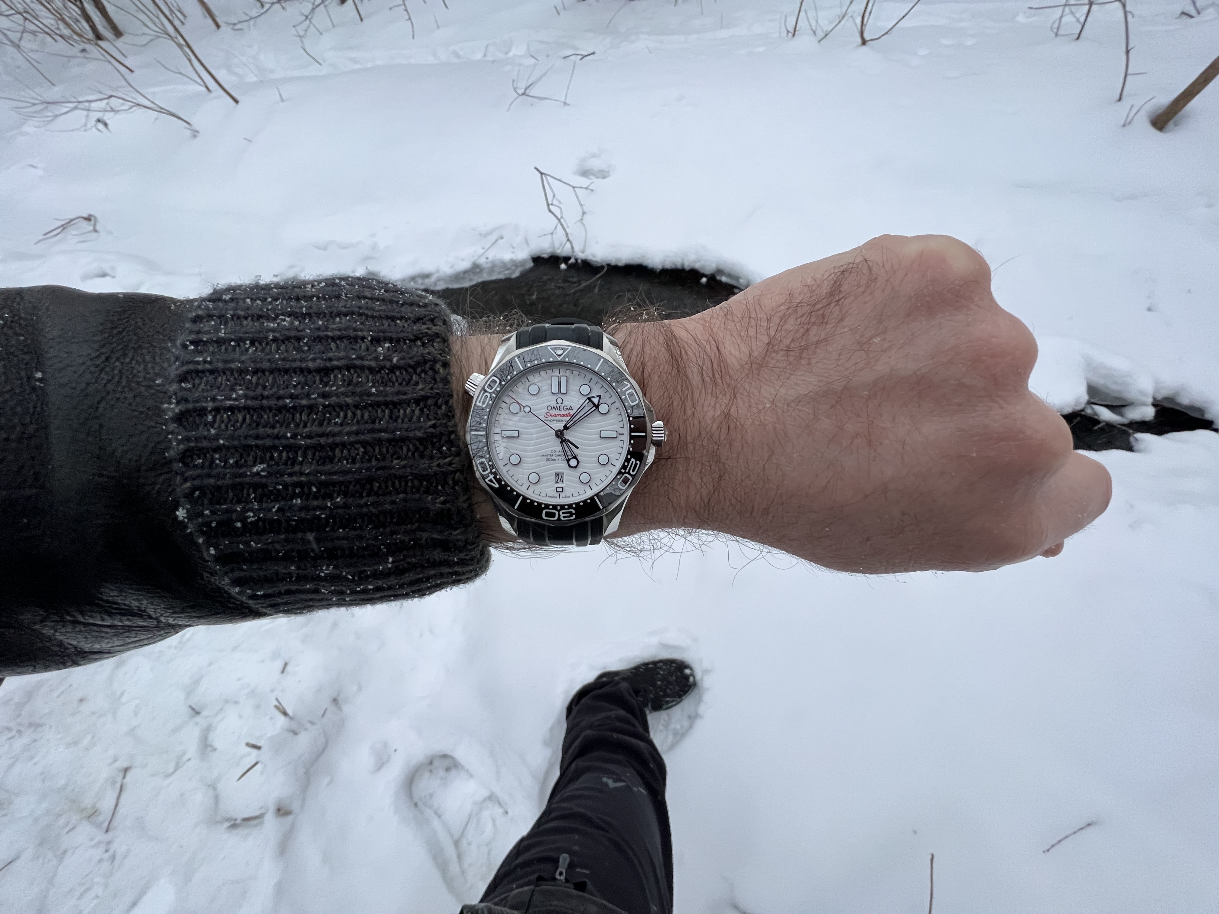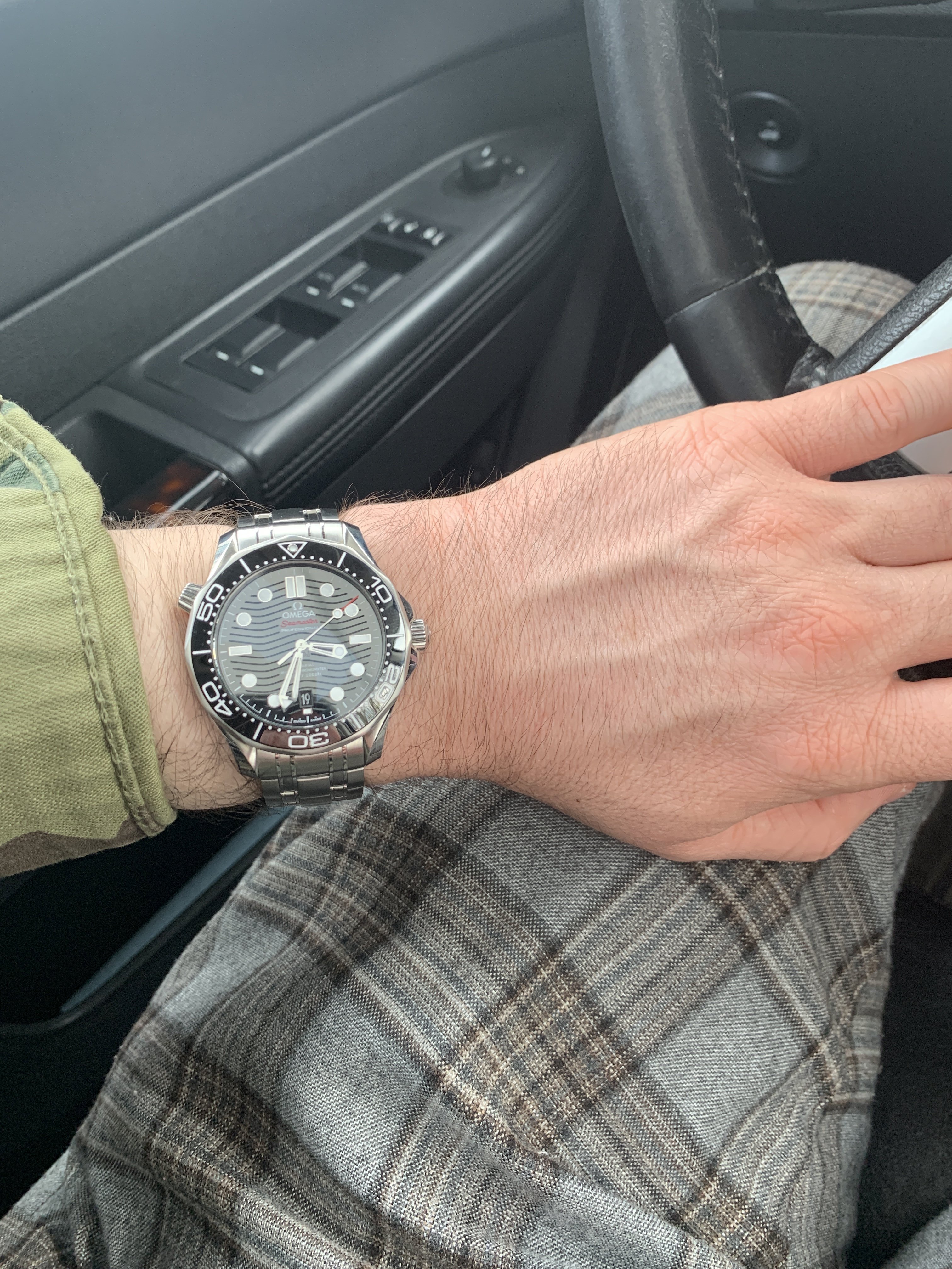 Third and best, the green color is really fascinating and versatile. Omega nailed it. The green really does appear black / dark grey most of the time in indoor settings. Only in bright light ( or under the jewelers perectly corrected LEDs ), does the green pop inside. I tend to wear a lot of black and have no problem wearing my green dial. It goes well with a blue blazer, of course, as well. Outside it is a different story and the green is really fun.
