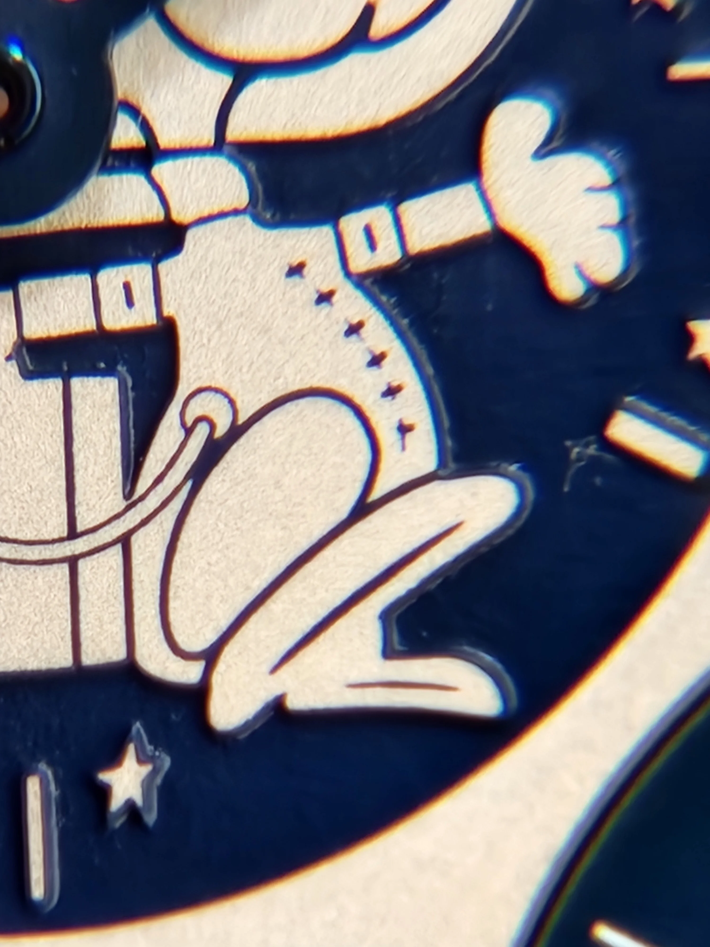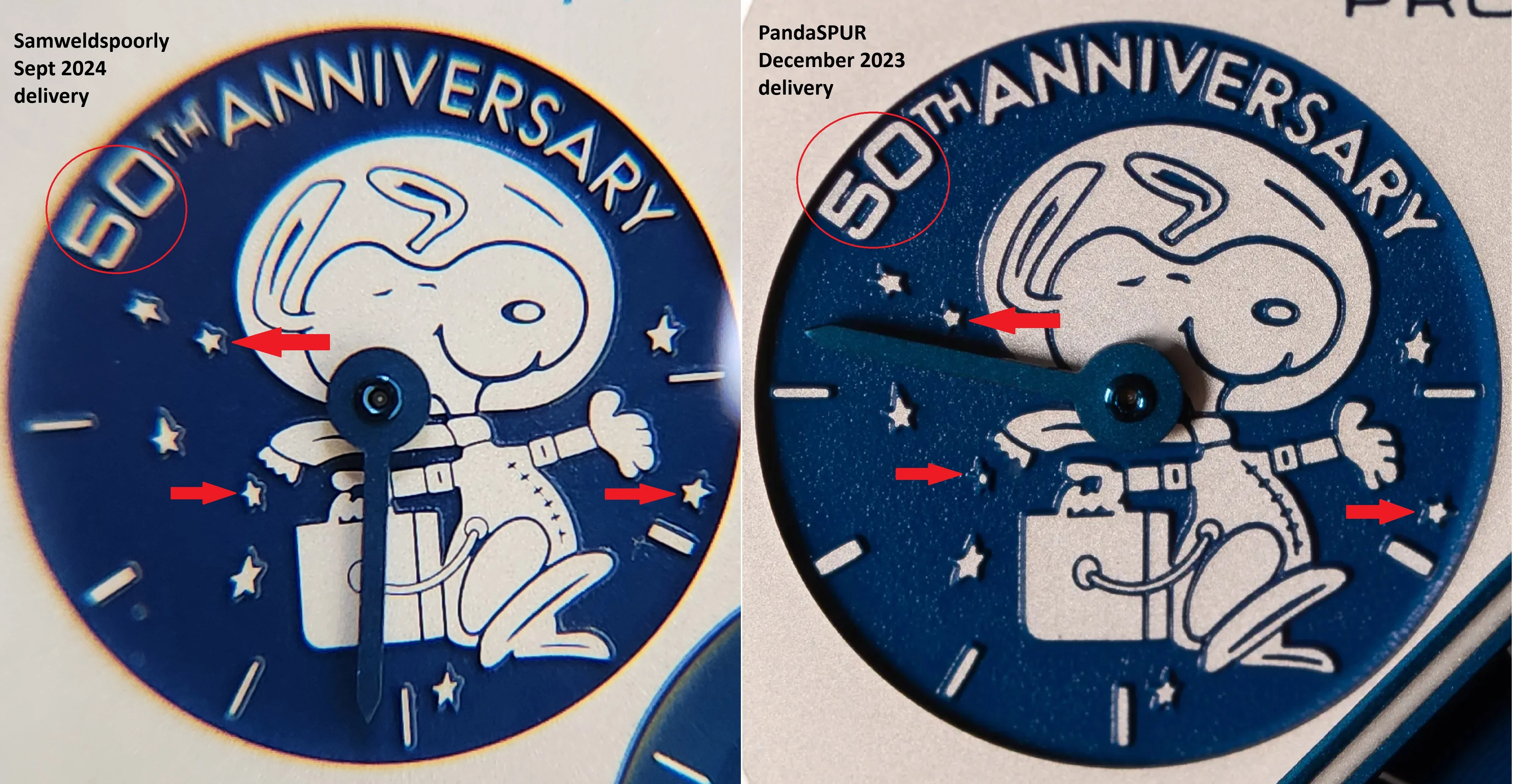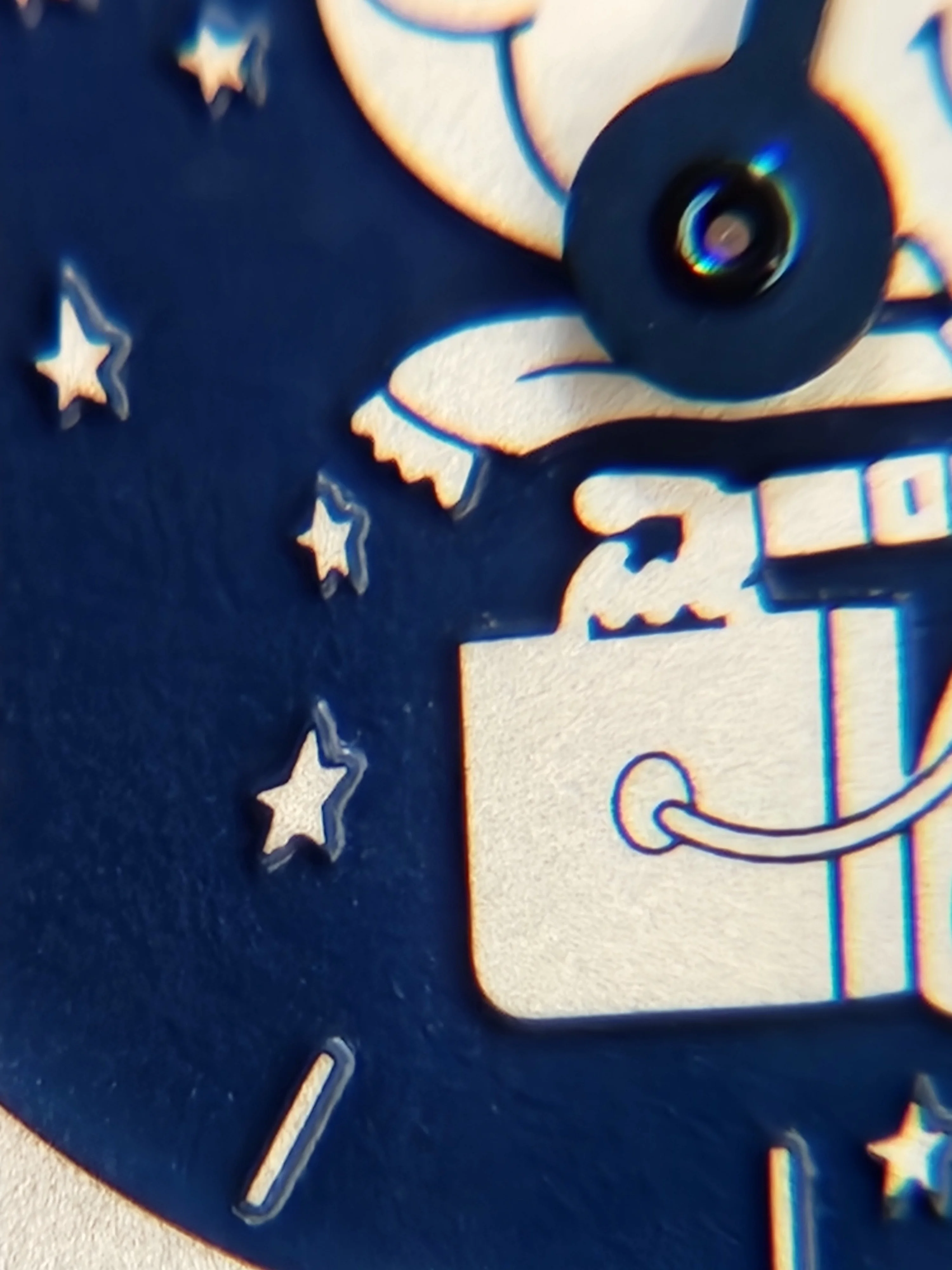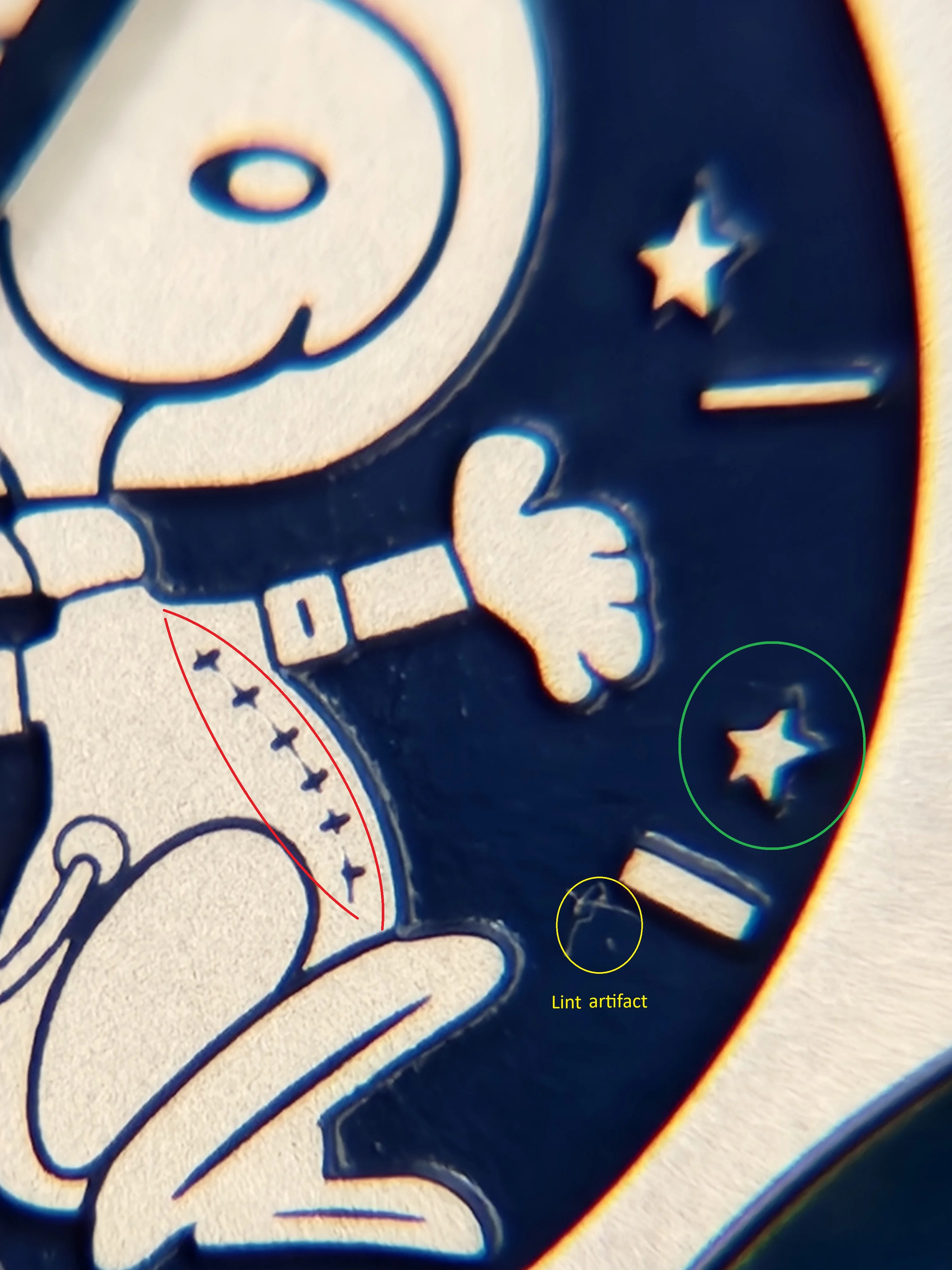 5. Here is my takeaway. None of this really matters to me as an owner and it shouldn’t matter to anyone else really IMO. We are all looking at these under loupes. I have taken hundreds of photos of my snoopy and stared at mine endlessly and NEVER noticed this until people started talking about it. I look down at it and can’t visibly discern any issues with the naked eye. I think this is just standard manufacturing variation. I don’t think these should be graded or thought of as less than. Take a look at Omega Speedies from the past. The Moon to Mars release has WILD variation between sub-dials based on UV exposure and which sub vendor made the printings. Or any of the mission patch releases from the 80’s. Do you think owners ever noticed printing differences and shared high-res macro images to compare and complain about the quality? Absolutely not. You still have a wonderful engineered and executed special release on your wrist. It’s not a FP Journe, relax. Try to keep things in perspective. The distance between the surface of the snoopy and blue painted background is less than a sheet of paper, or 0.0025”. Two and a half thousands of an inch. With all these variables and stack up tolerances involved, I’m surprised they look as good as they do. And it took 5 years for anyone to notice. I would say this is NOT a quality issue. Furthermore. I think the MOST LIKELY explanation is that early on in production, people complained about the definition of the stars, so they started grinding more the image down to get the star resolution up. But sacrificing image definition on internal features to get there. It’s a balancing act. And it all comes down to these stack up tolerances to best case/best image quality. We haven’t seen any examples with NO zipper buttons. And no examples with pinpoint stars (no star point definition) so I believe the acceptance criteria lies between these two features and their depths.