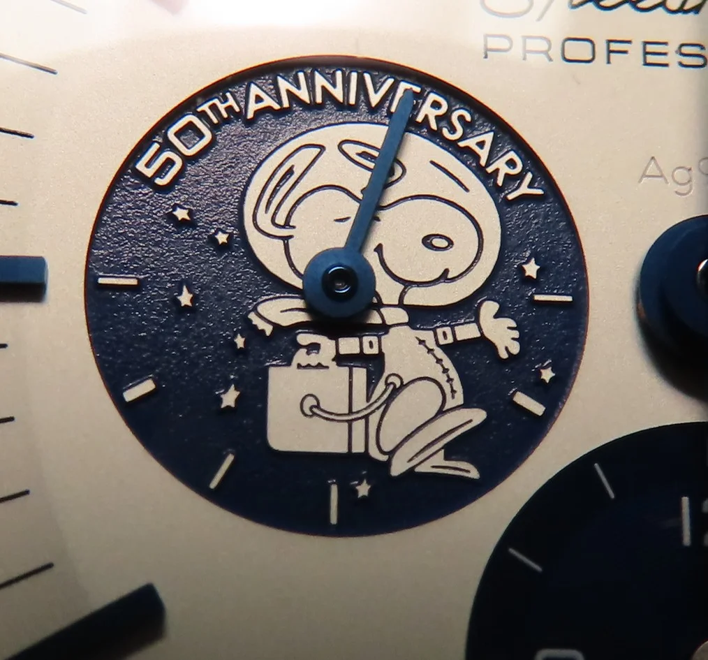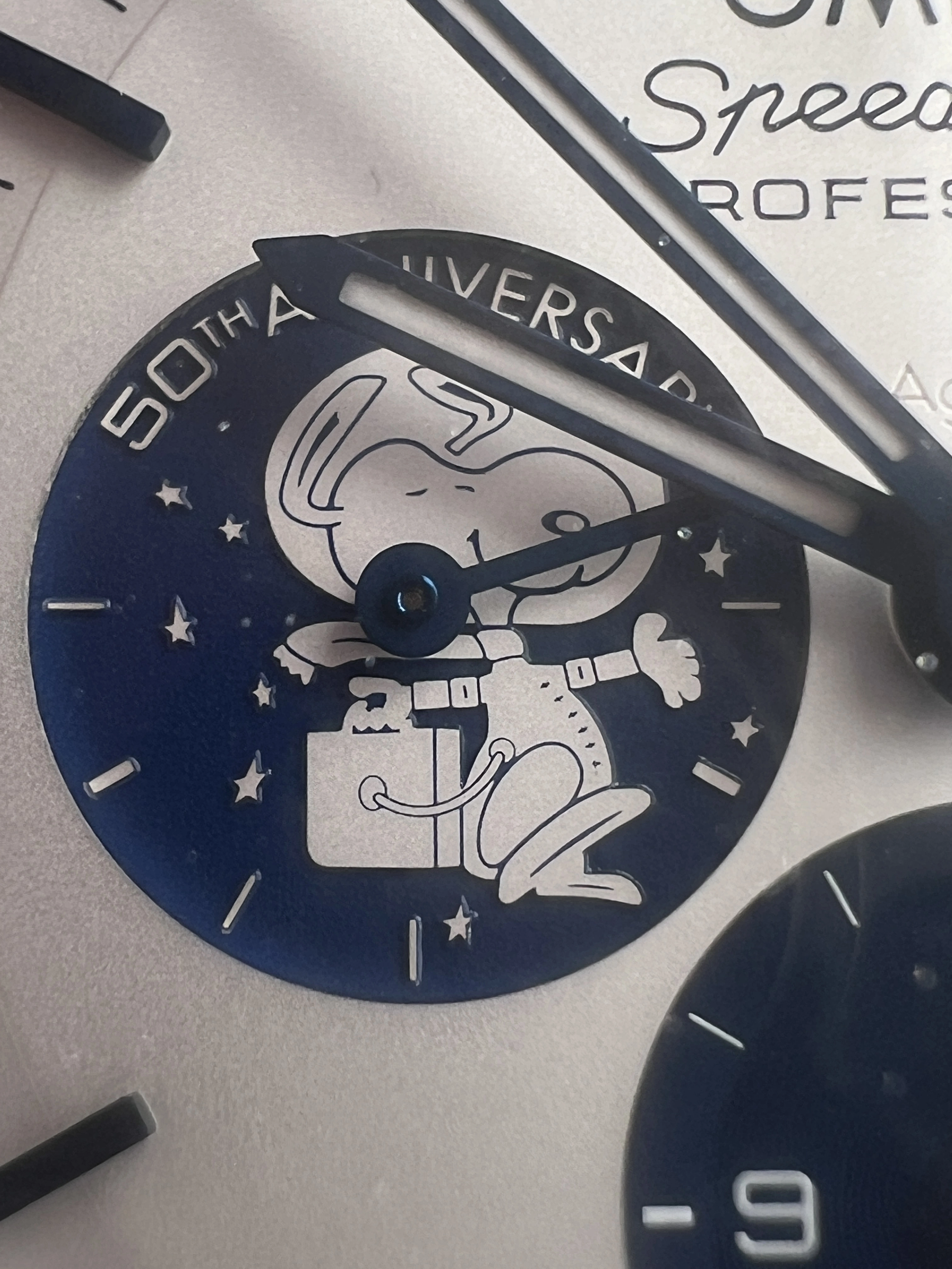 Here's another one for the database. An 8370XXXX serial number, sold September 2022 from a European OB. All stars present with five points showing, Snoopy fully buttoned/zipped up, firm margins on right foot, left paw fully distinguished. Firm, distinct lines on Snoopy's head, body and umbilical cord. Thick, bold lettering. The angle of the pic shows the sharp 3D impression of the stamped silver dial and the hammered texture of the blue enameled surface. I think this is about as good as it gets, imo.