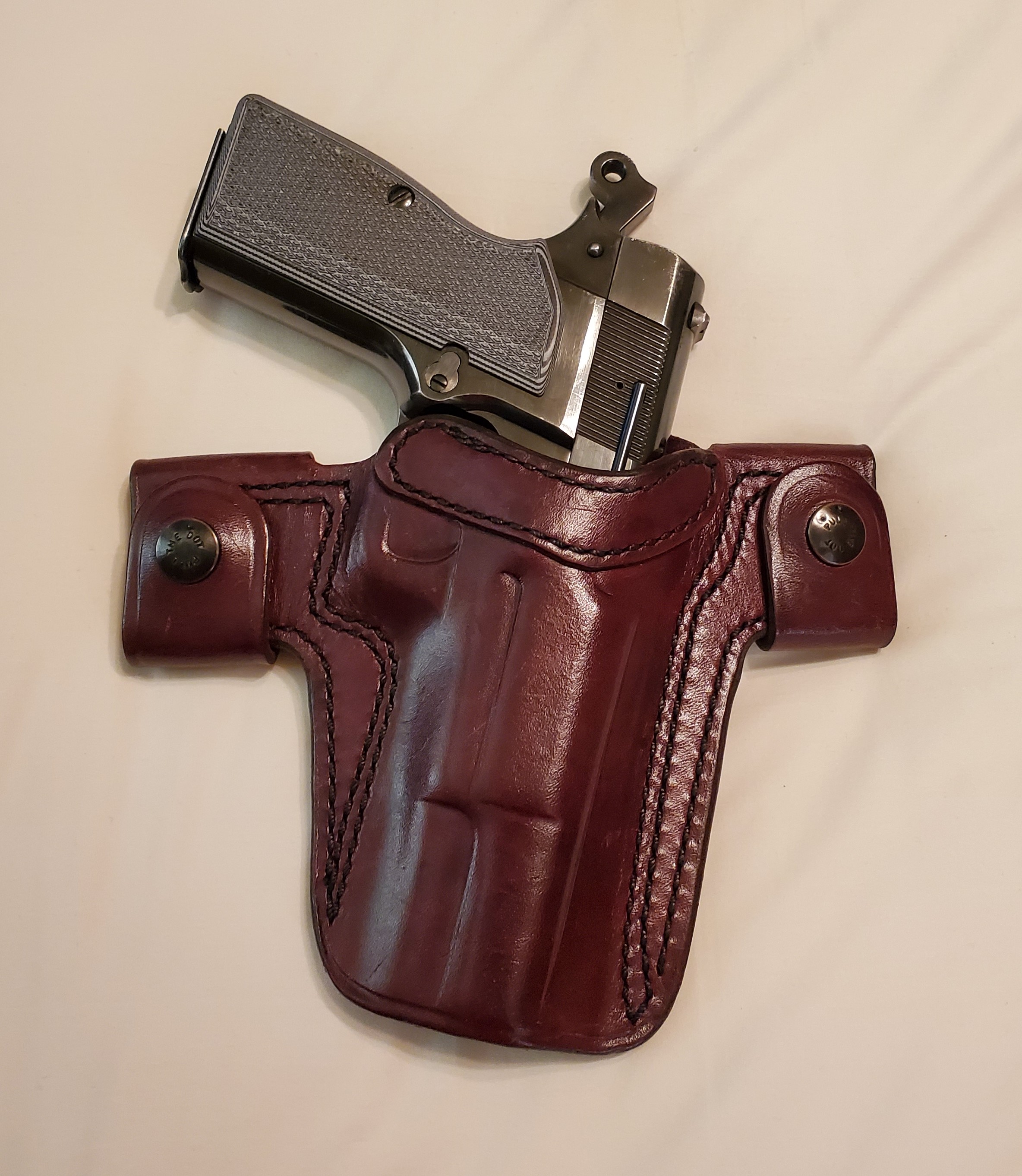 The 1911s, when carried IWB are served in the same way. Here's a custom Rafter S IWB holster made for full-sized 1911s by Della Shafer who died tragically young. I don't tote a World War II Remington Rand military contract 1911A1 which is only for illustration.