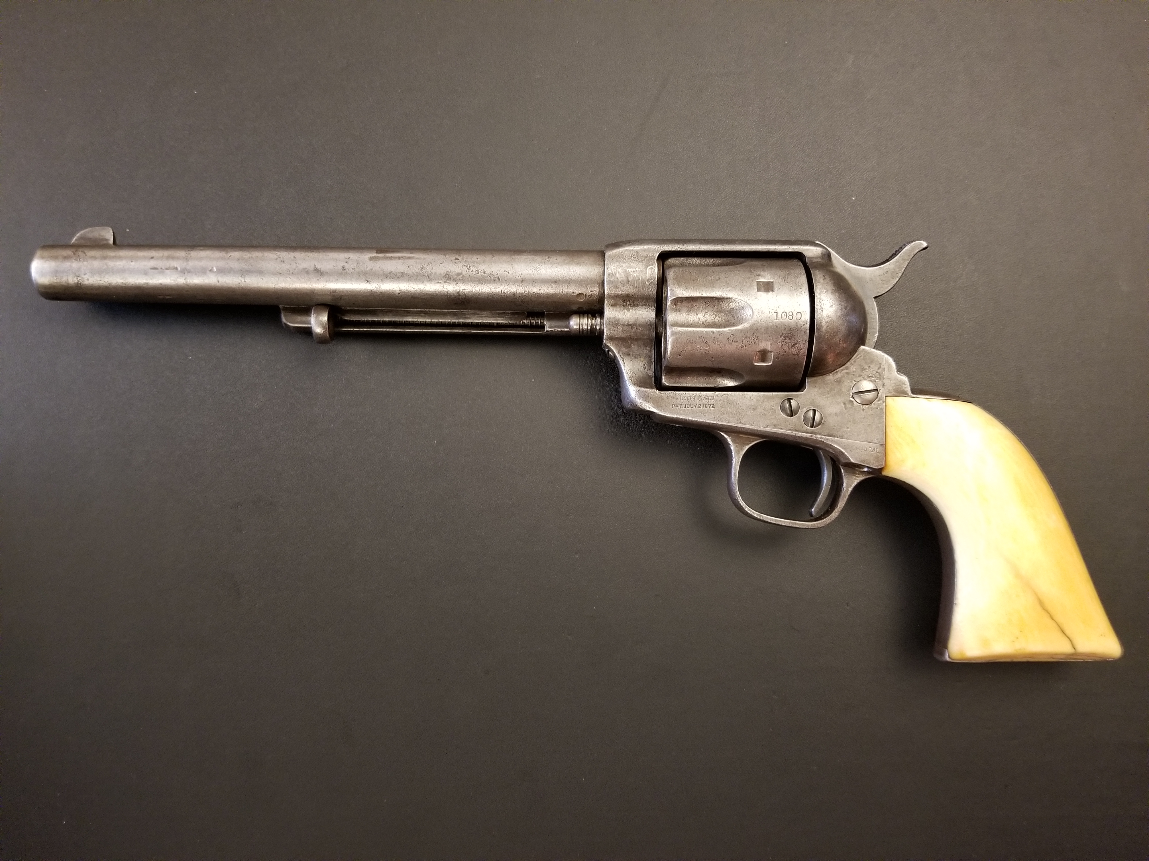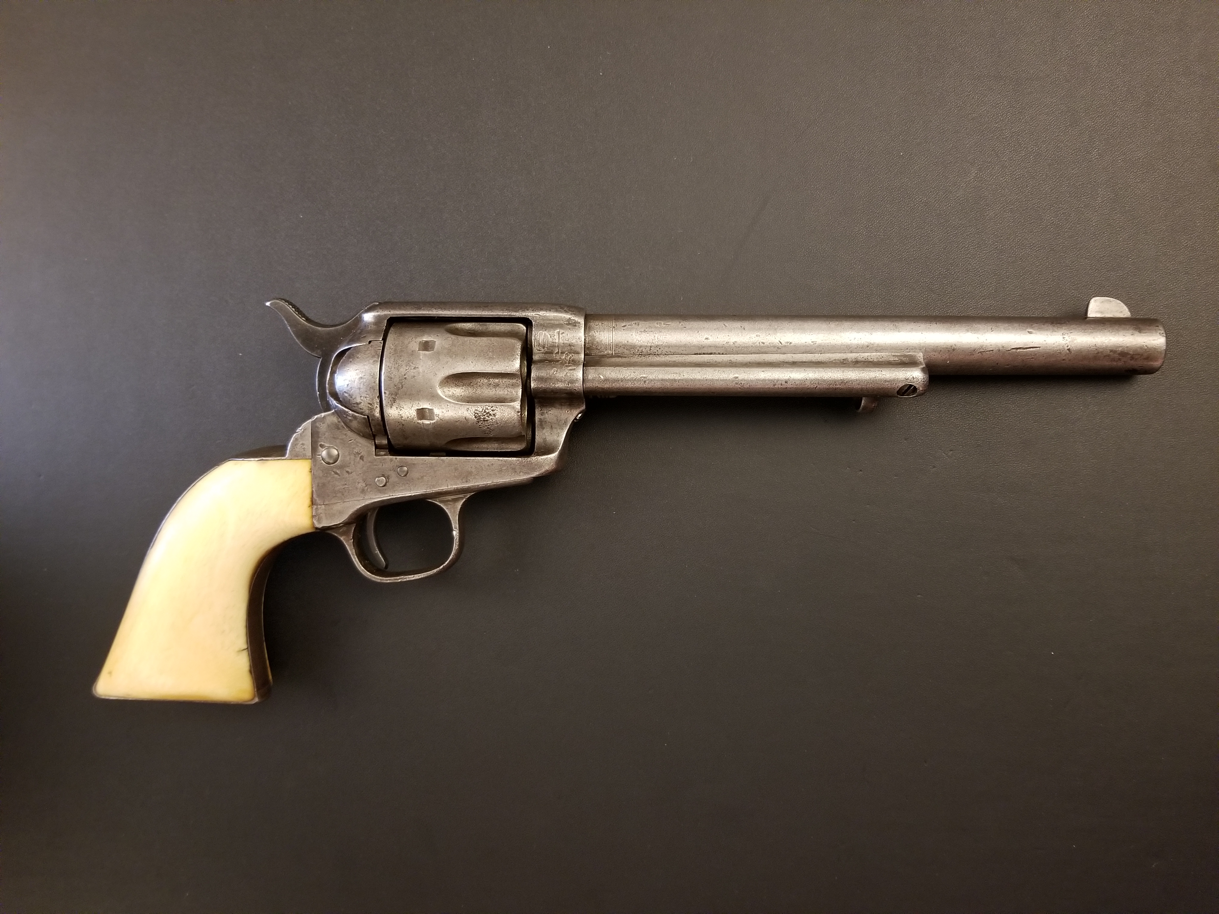 Wanted to share a new acquisition....a Colt Single Action Army(SAA) commercial from early 1874. All serial numbers match. Ivory grips are age appropriate and every bit the construction of what colt produced in that era but unfortunately colt records are thin for much of the 1870s, so it can not be confirmed officially by Colt. BUT, I have read in an expert book (Kopec)that in early 1874 commercial SAAs had a run of ivory gripped examples so I'm fairly confident that since the rest of the revolver is original, it's very likely the grips are as well, especially given that the condition of the grips matches the overall state of the gun. It was also stated in the book that later examples with ivory grips were almost exclusively reserved for engraved or custom models, so these made in 1874 are pretty special indeed.