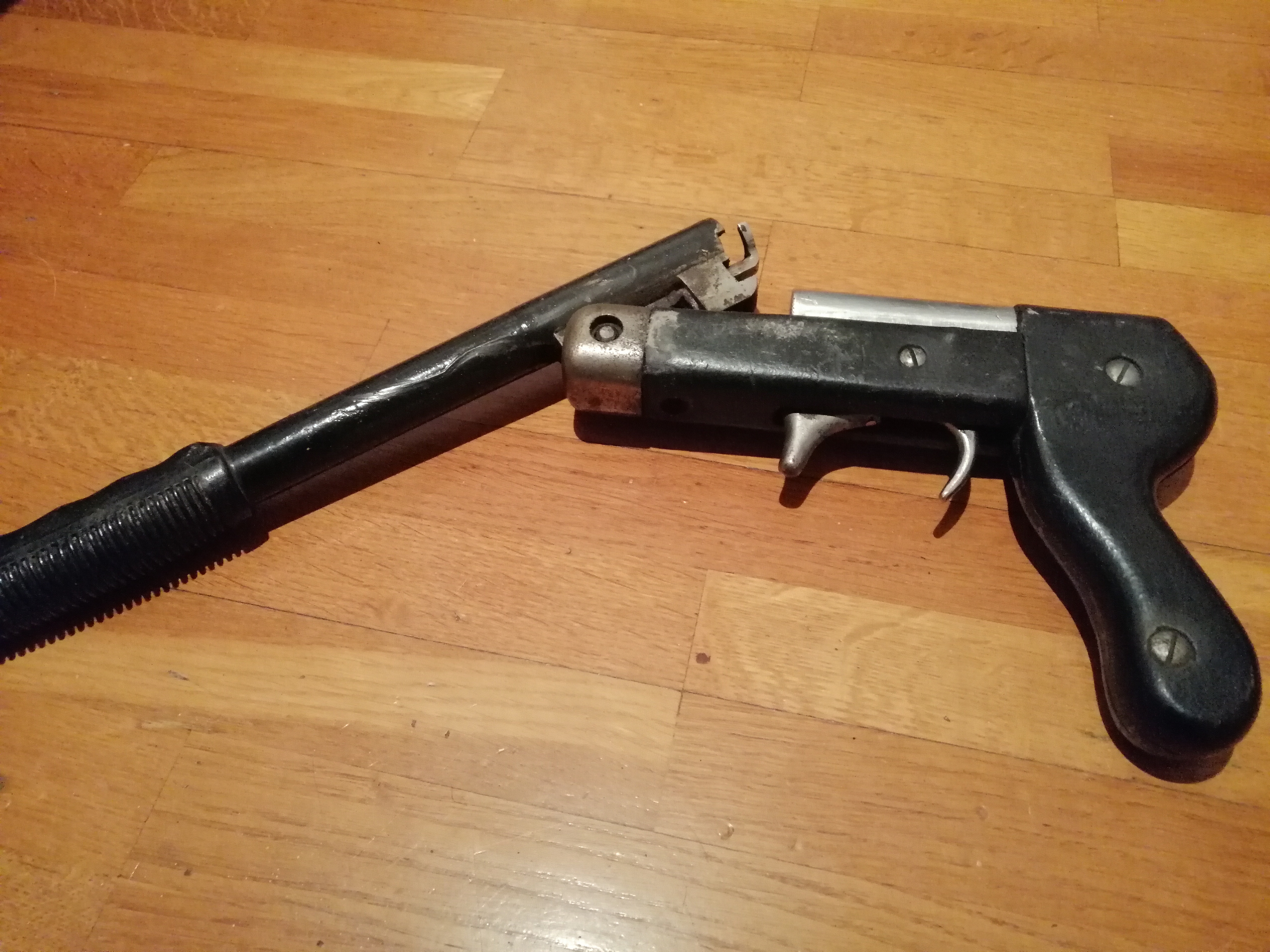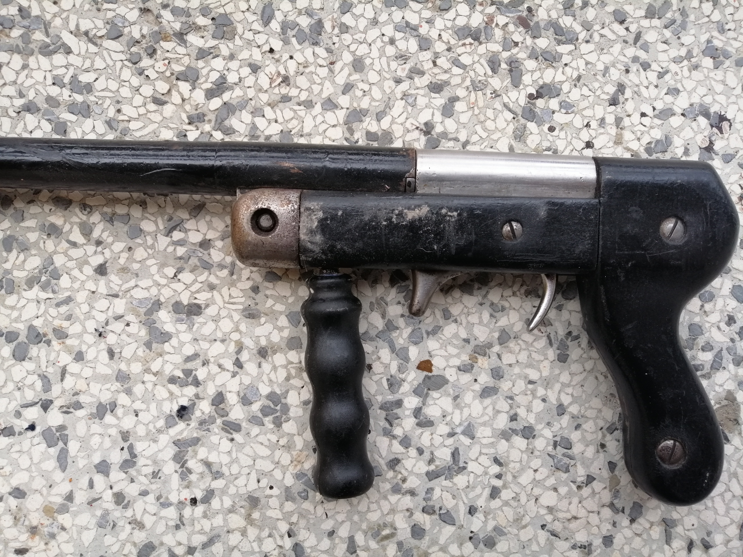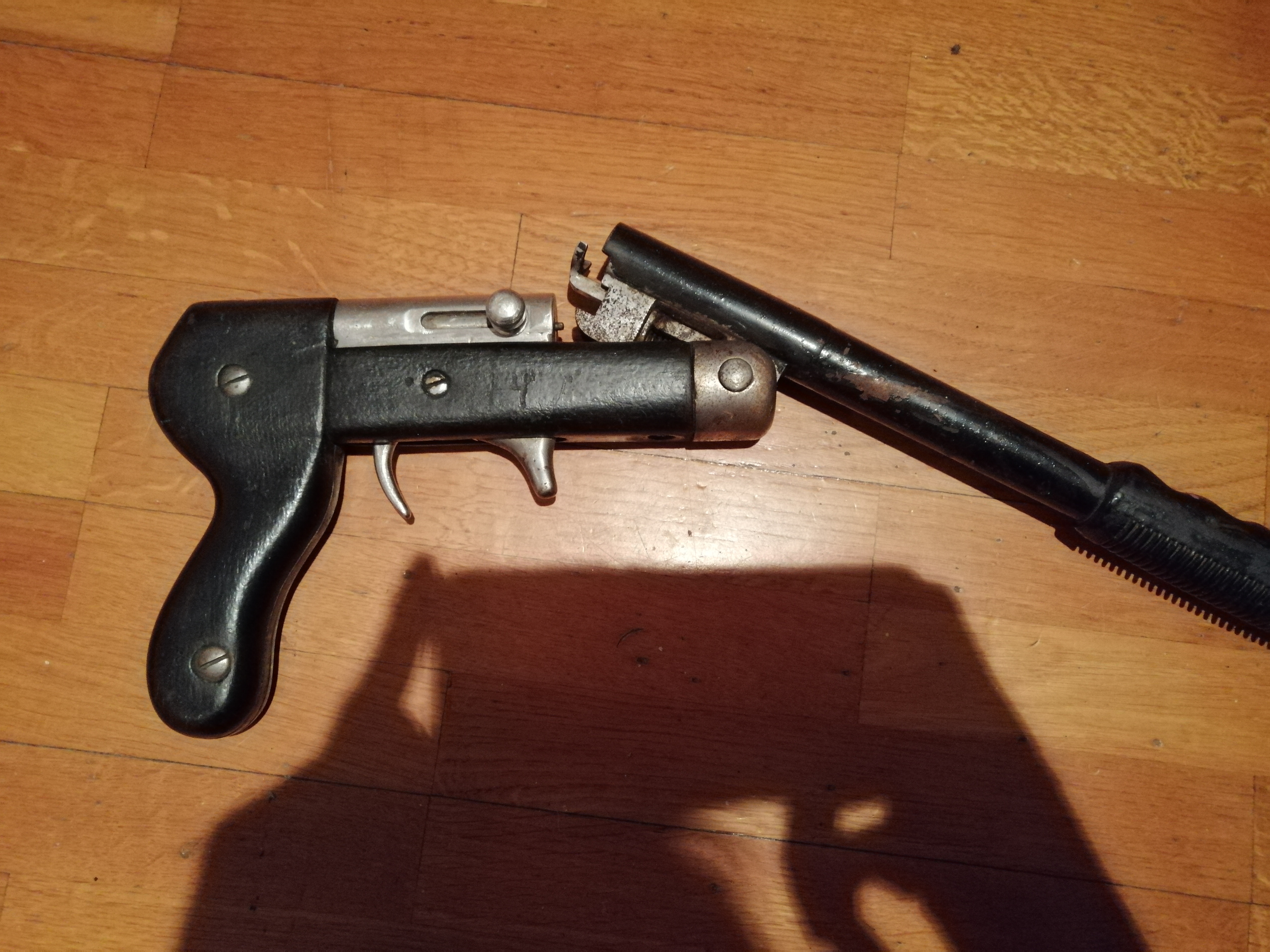 I suspect the grip is not original to this piece. It may in fact be a factory made tear gas projector that was damaged, most likely in a fire, salvaged and rebuilt by a guy handy with hand tools.
