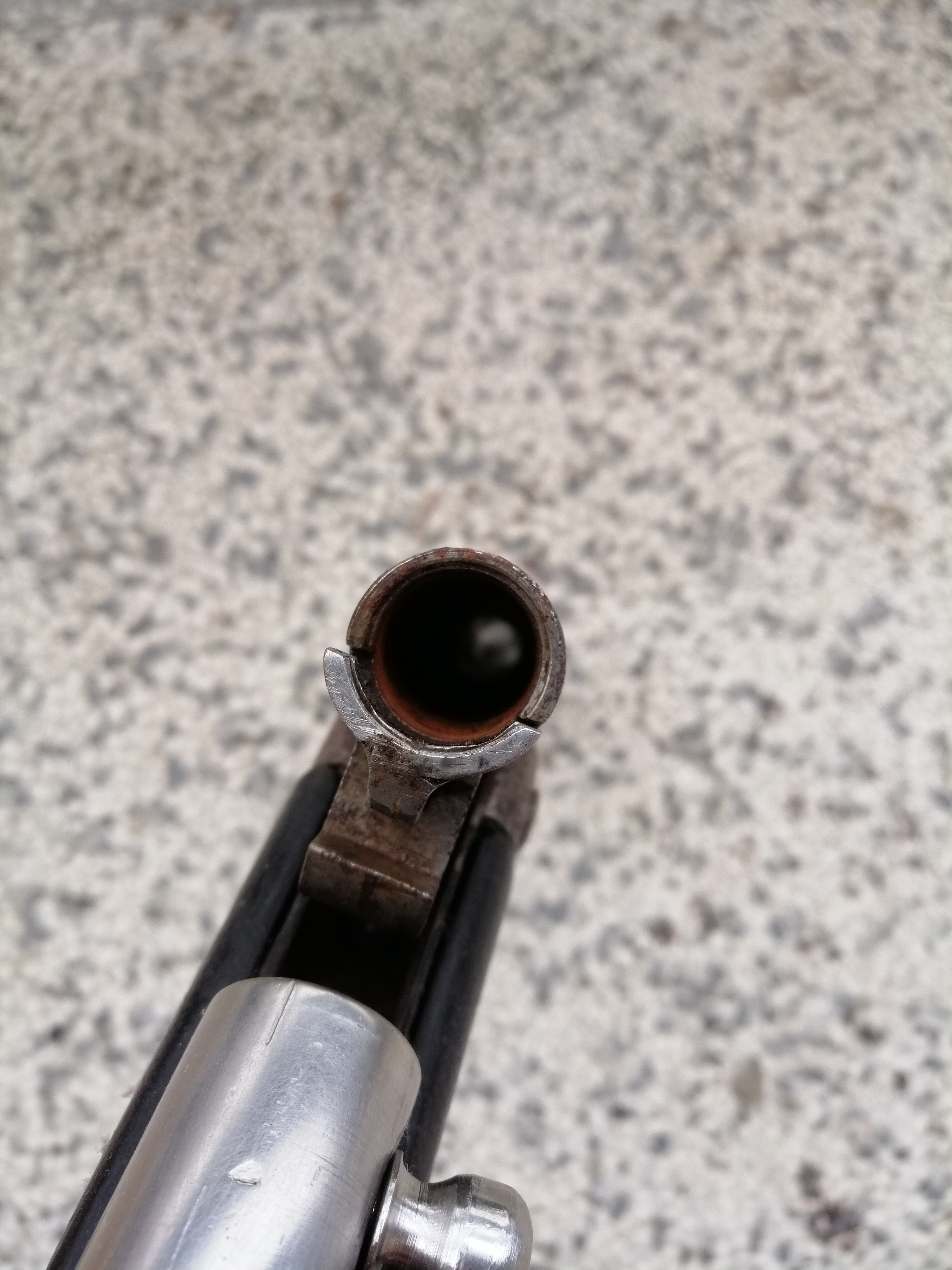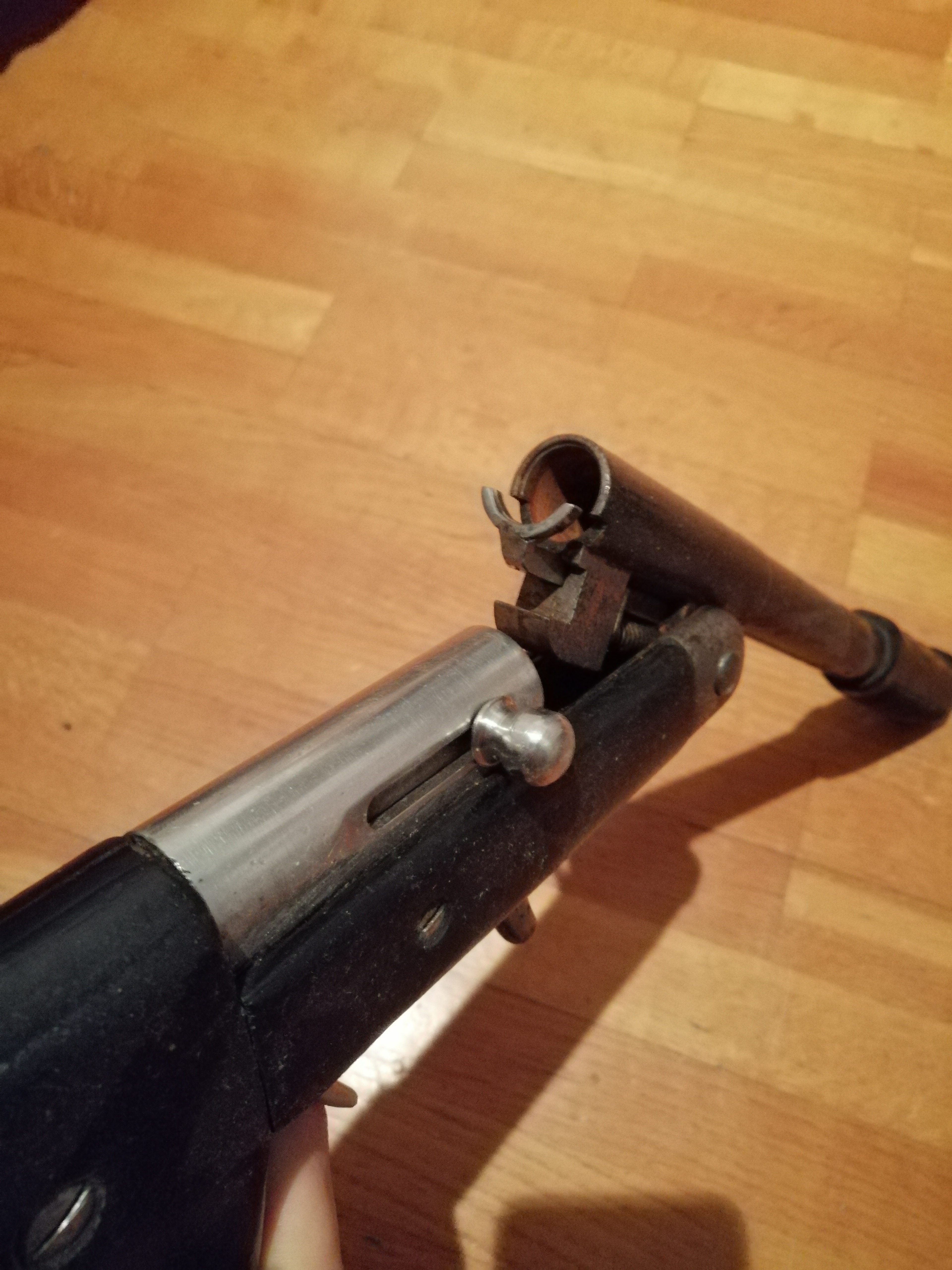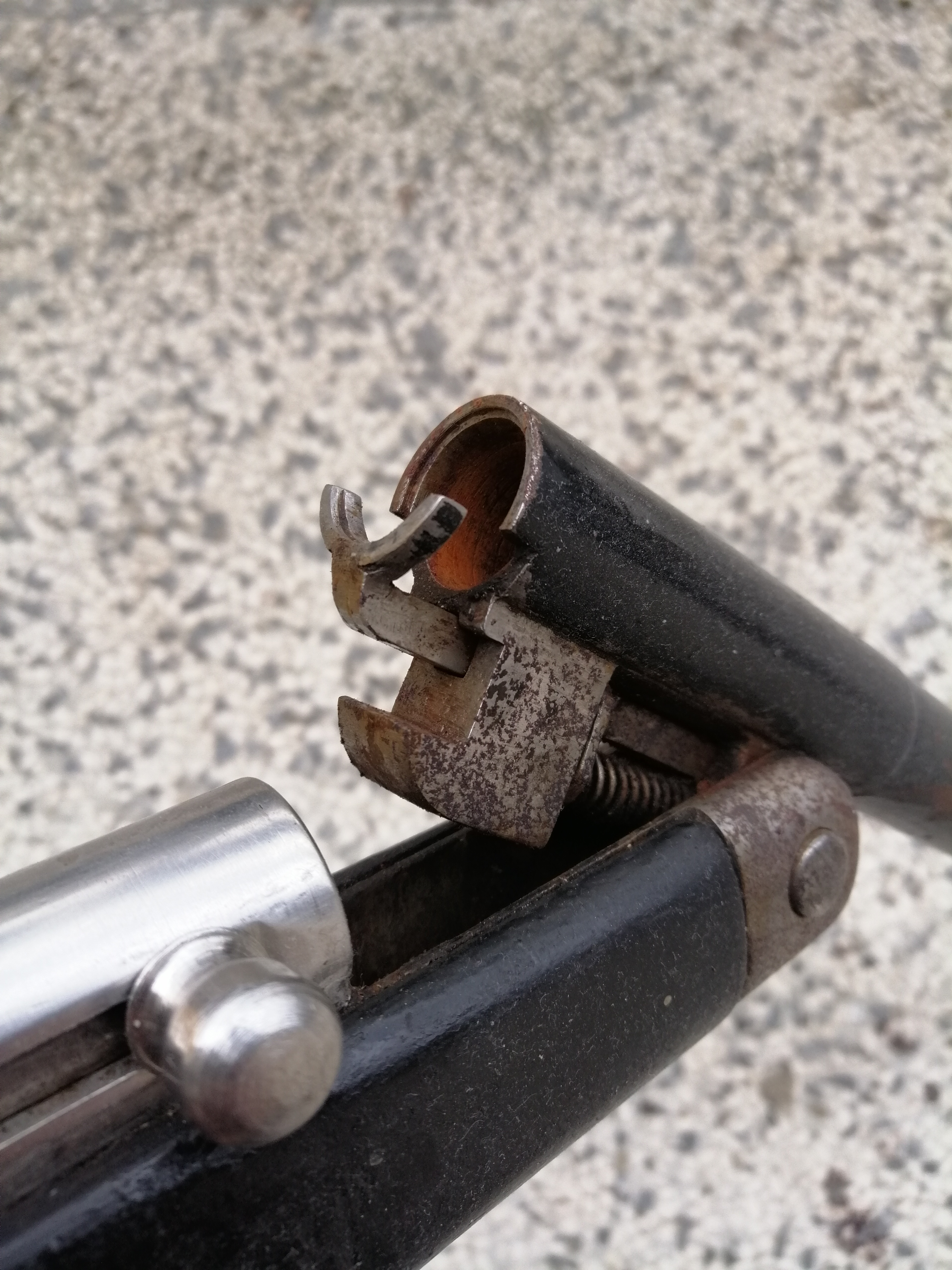 The opened breech of a Harrington & Richardson Model 176 10 gauge Magnum shotgun I've had since the mid 1970s when I bought it at 18 years old thinking I was going to mimic Elmer Keith's tales of 100 yard pass shooting of ducks with his Ithaca Magnum 10 gauge double gun on the Salmon River in Idaho. Zapata's gun's extractor appears more substantial then the H&R's extractor.