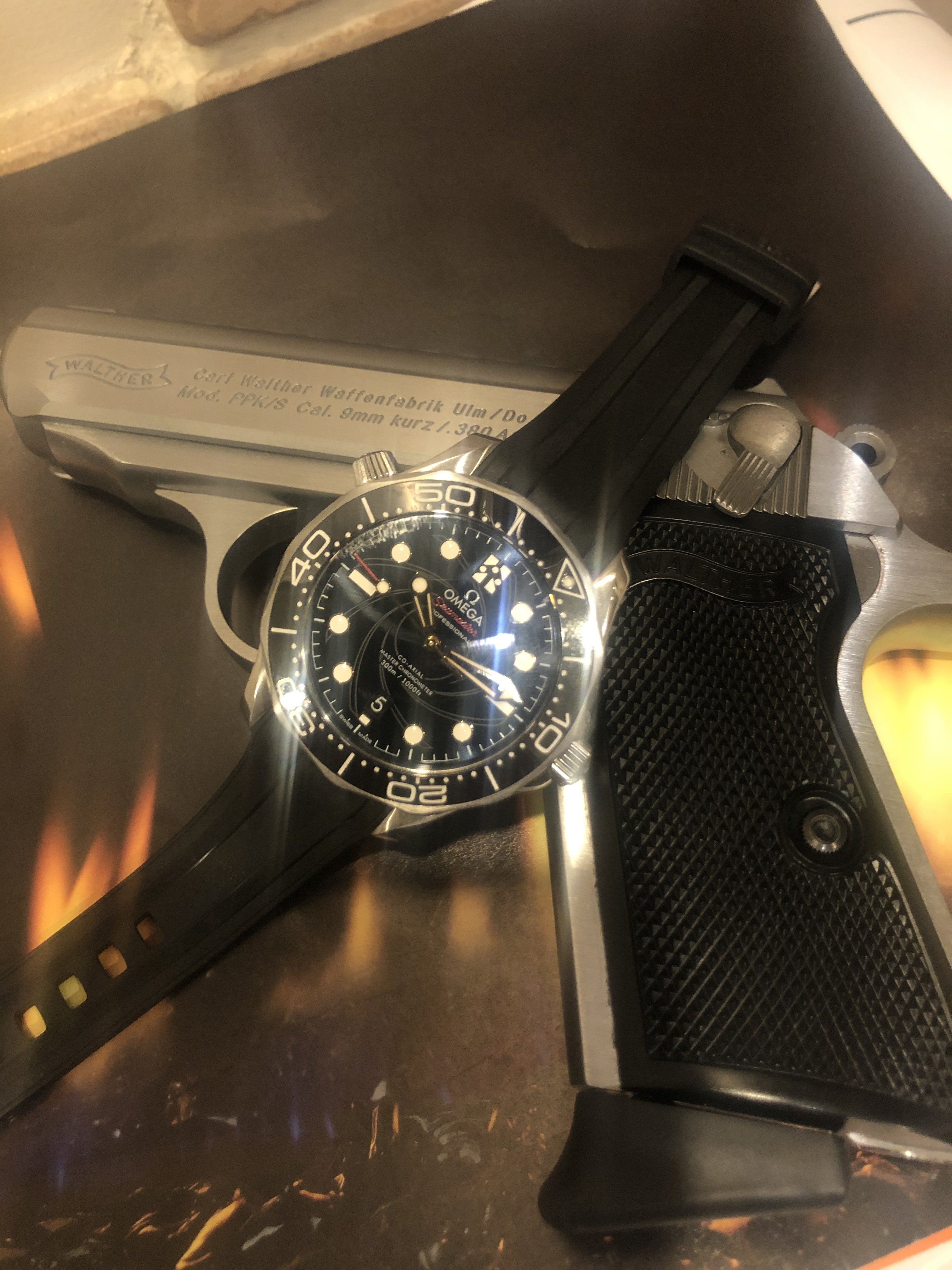So I finally got around to taking a pic of my Bond Diver 300 with my PPK. Apologies to the Bond purists. We all know James Bond would never have used a stainless PPK. Too much risk of reflection. Still looks cool though!