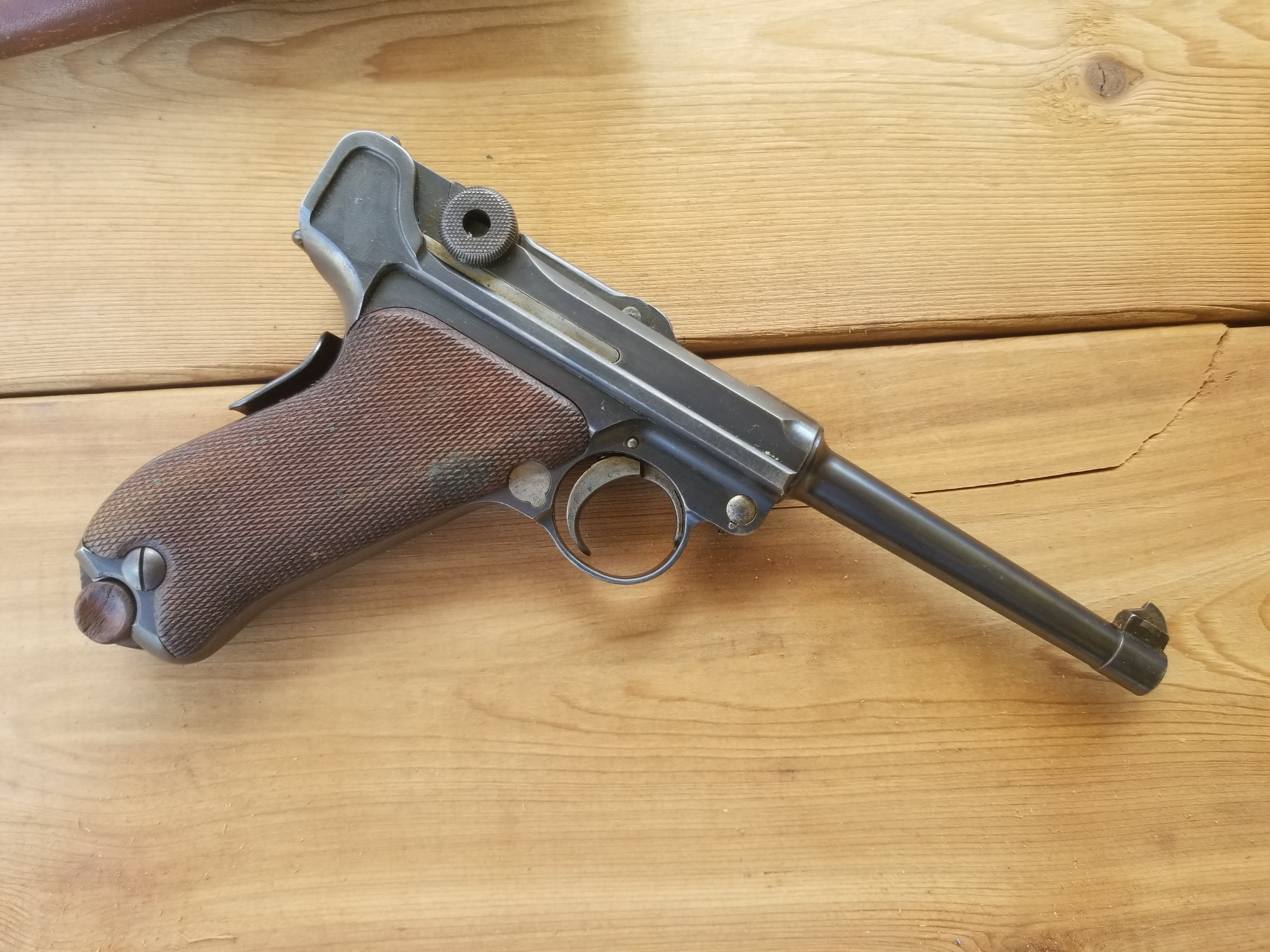 Only a VoPo Luger lives here. Picked up out of a "Shotgun News" ad for $225 back in 1986. The advertiser was selling a batch just imported from who knows where. Kind of a bottom feeder Luger, but it shoots and I got to learn how Lugers function and detail strip on it. Still my favorite way to shoot up 9mm.