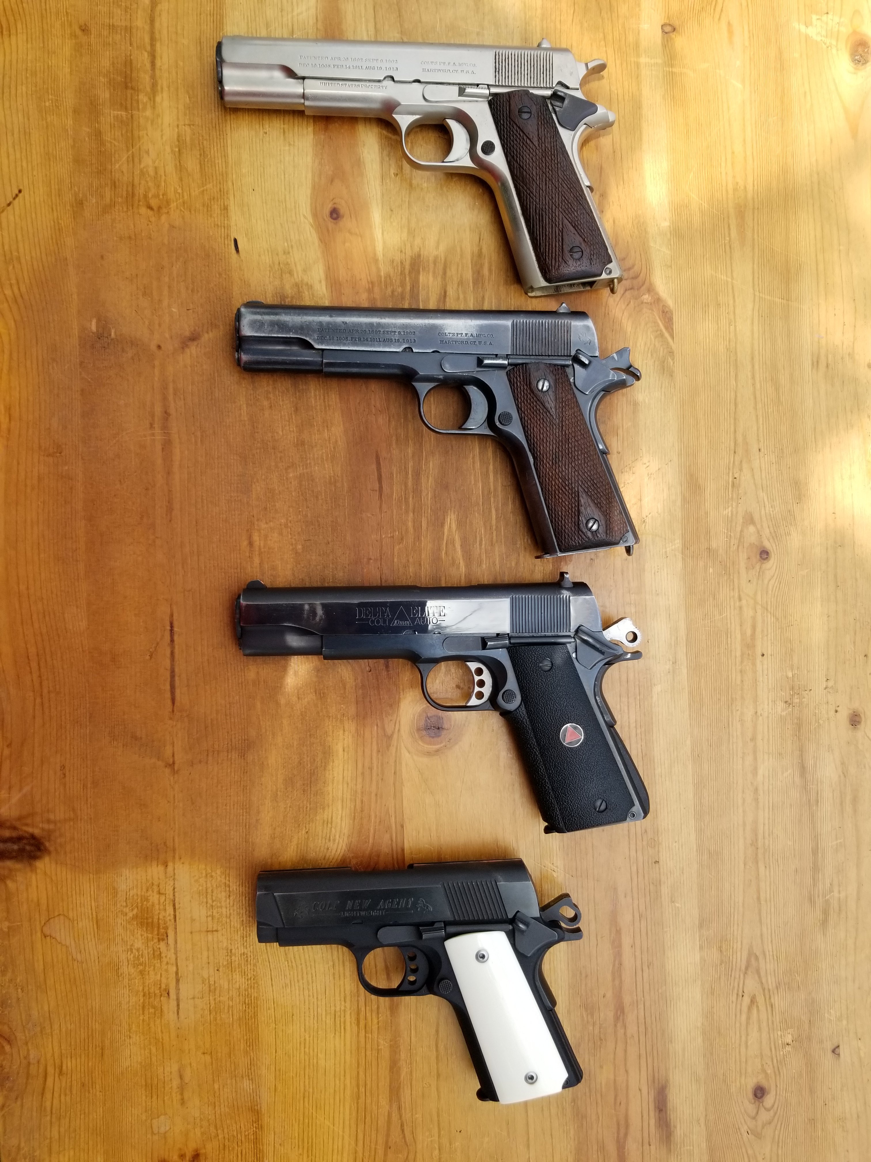 Here are mine, from top: 1915 M1911 that was carried by my granddad, he was pushing 40 but went off to war with the 45th Infantry when they went to the European theater; 1915 Commercial Model, this one is interesting because it's one of 1000 ordered by Argentina in 1915 and adopted the following year as the Modelo 1916, it has the Argentine Crest on the top of the slide and all the parts are serial numbered; 1988 Delta Elite; New Agent I bought, probably five years ago. The second photo is my 1969 GCNM that is currently with Karl Bening getting finely tuned for bullseye.