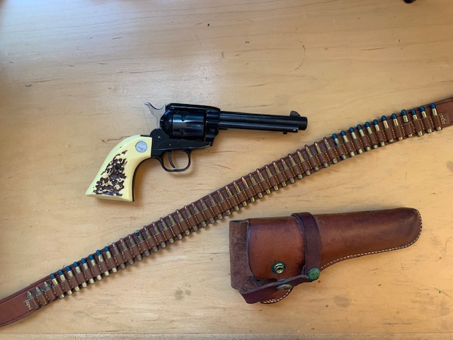 The Frontier Scout was an inexpensive gun in its time, retailing for about $50 (equivalent to about $300 today). I'm a bit surprised that they seem to be selling for $700-$800 these days, so I guess there is some "vintage" value there. Some retail packages came with cylinders for both .22 LR and .22 Magnum cartridges. My recollection is that we had a .22 LR cylinder as well, and this recollection is backed up by the presence of three .22 LR cartridges in the pistol belt pictured above. I have no idea where the .22 LR cylinder is today.