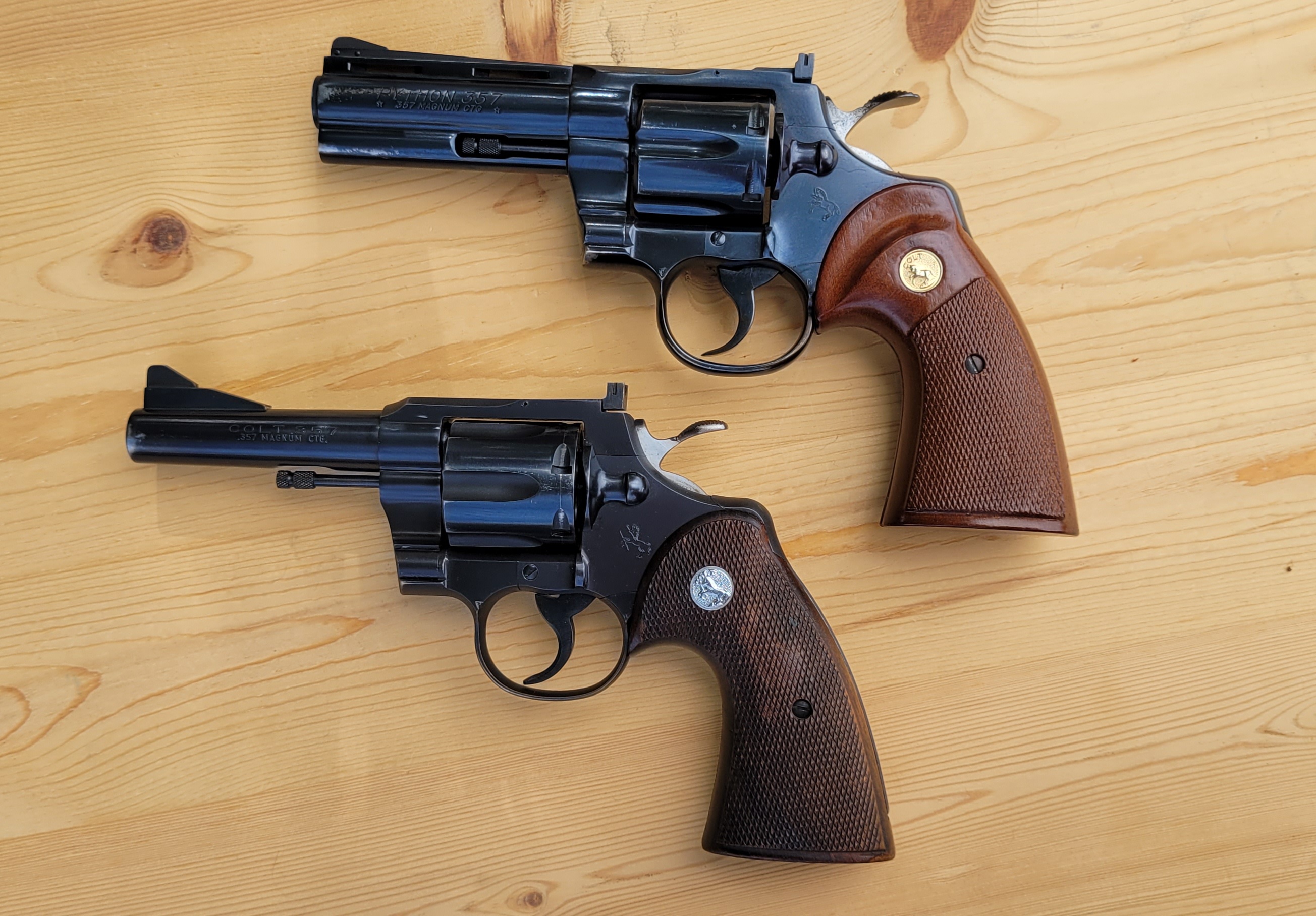 The '53 Official Police shown with its World War II bud, the Colt Commando. The Colt Commando was simply the Official Police gone off to war. Sporting a rough finish and molded plastic grips, it was intended as a substitute standard side arm and also to assist with arming guards at American defense plants and other war critical facilities. The government contract requested deletion of the particular polishing steps Colt provided on its commercial production as well as a more durable finish applied. No checkered walnut stocks were wanted, but inexpensive and utilitarian plastic would do. Revolver production down and dirty reflects the rush of the times.