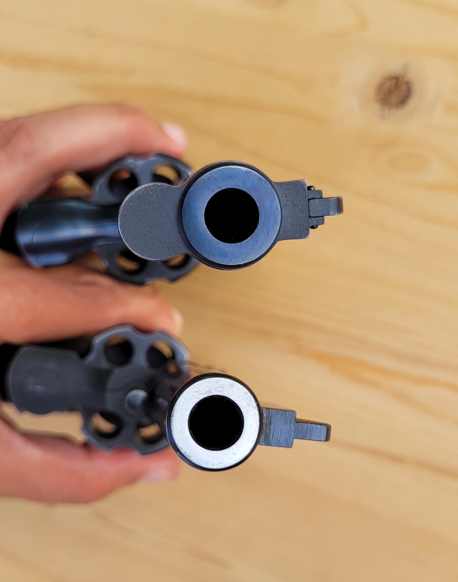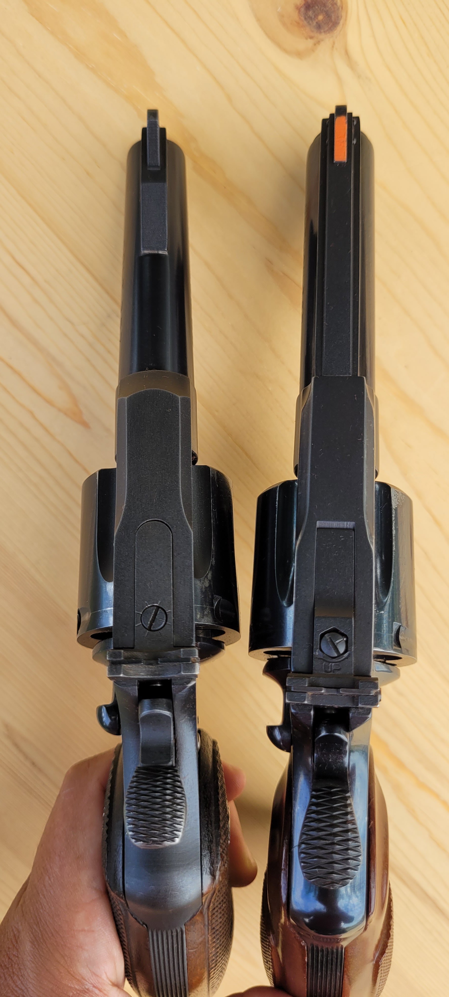 Only the first year of production 3 5 7s had the Colt Accro rear sight with the rounded front sight base and came with the muzzle highly polished and left bright. Subsequent years of 3 5 7 production found the muzzle left blued after the finish process and the rear sight base's front was squared off.