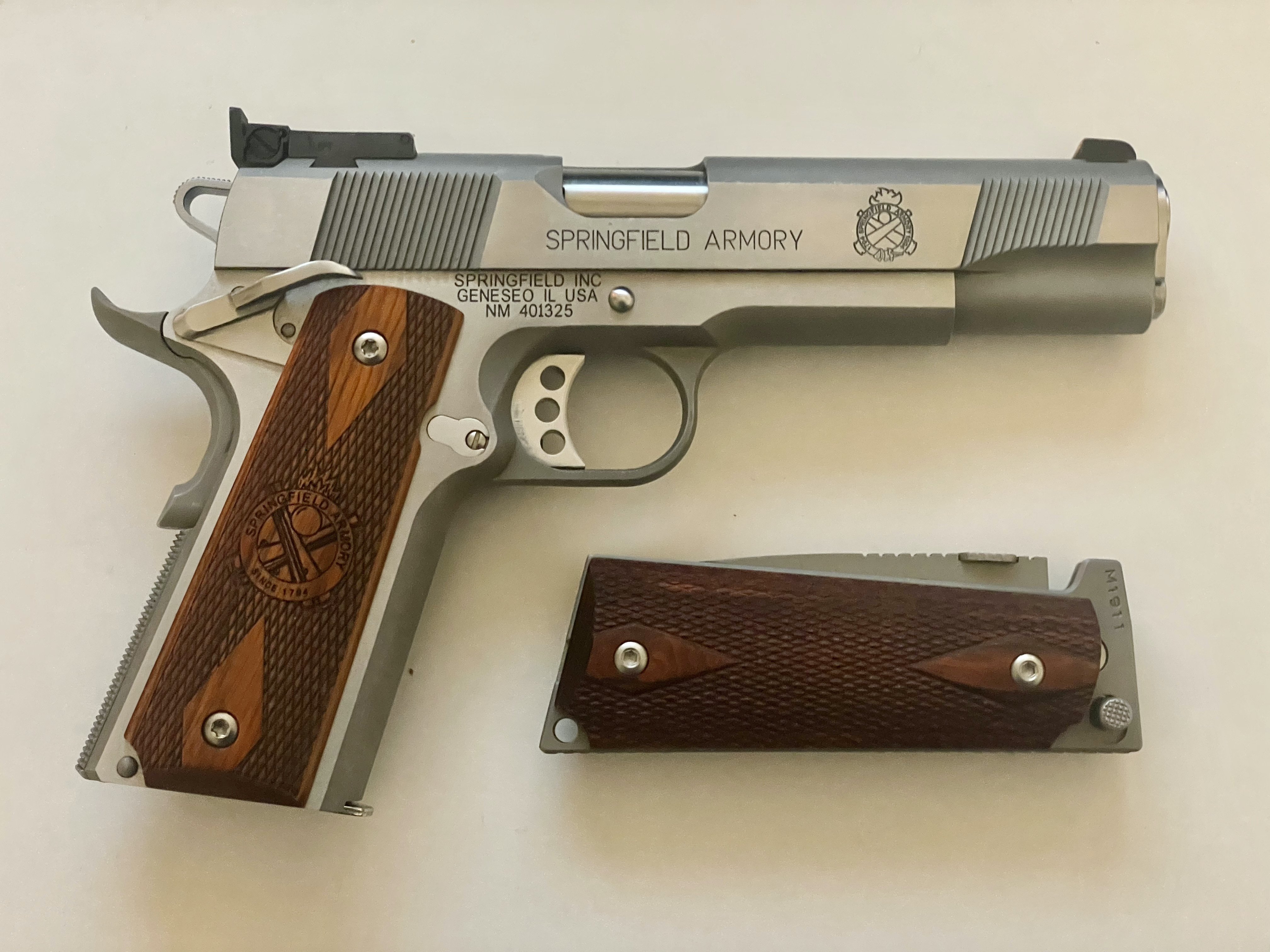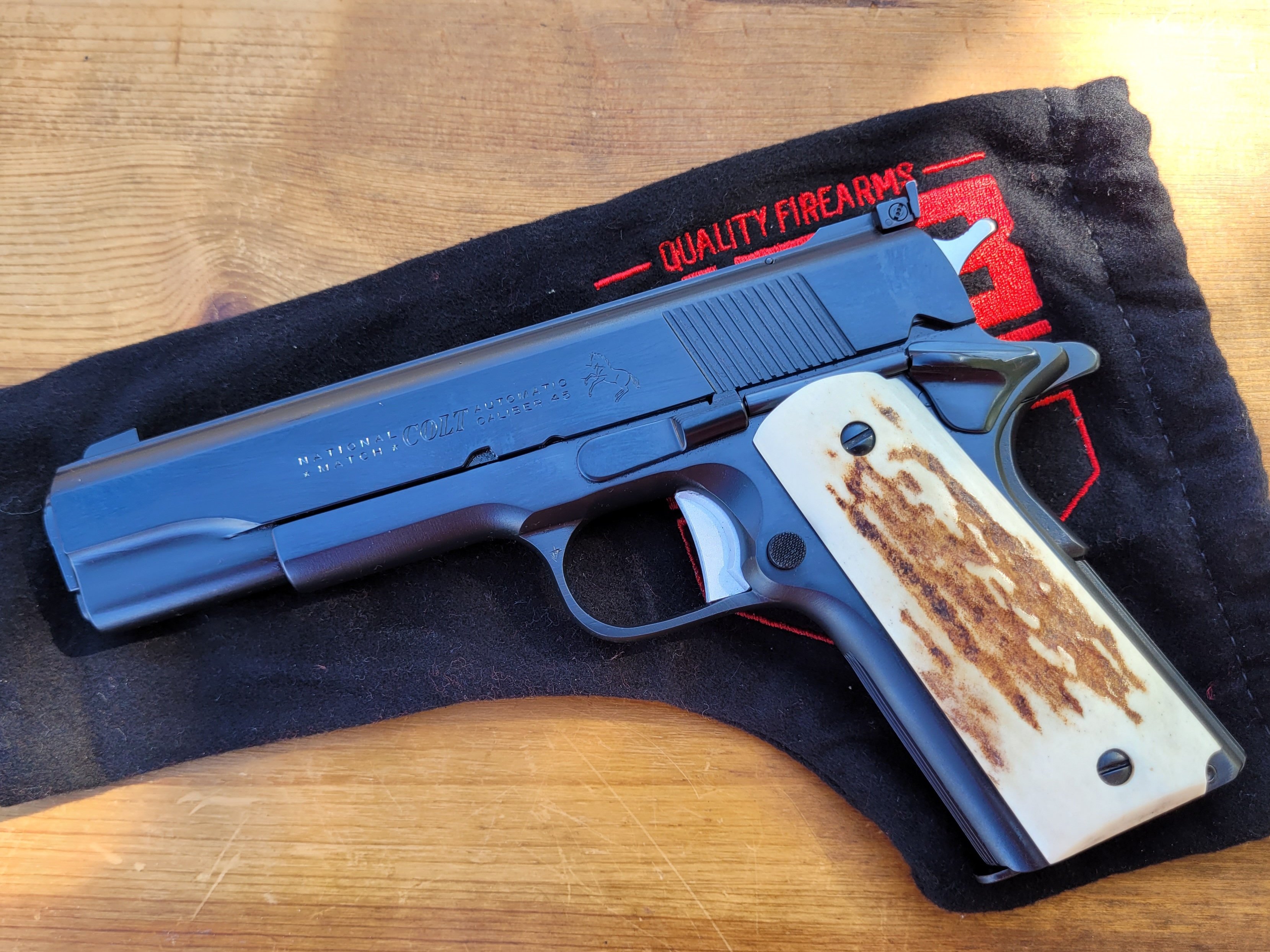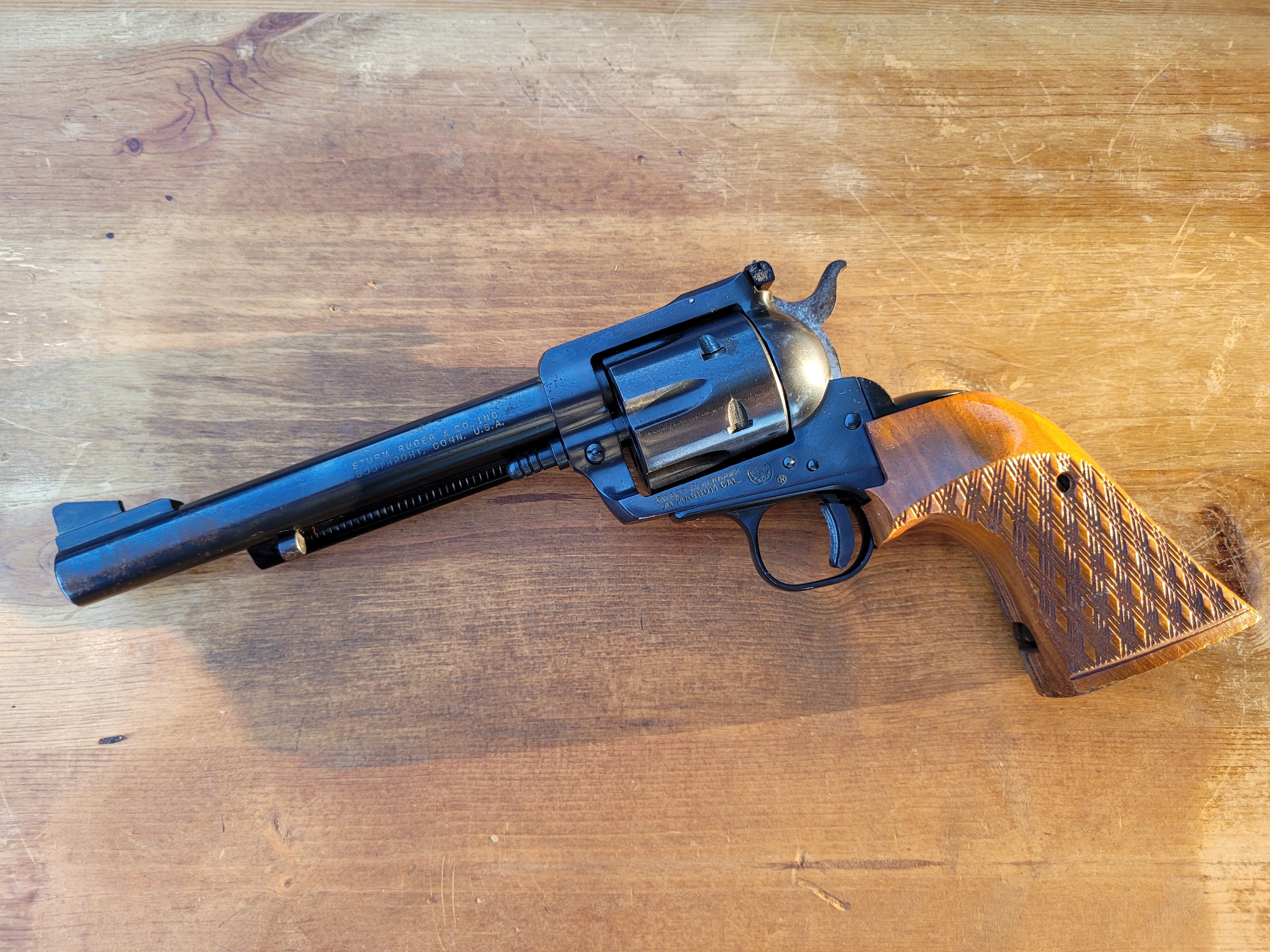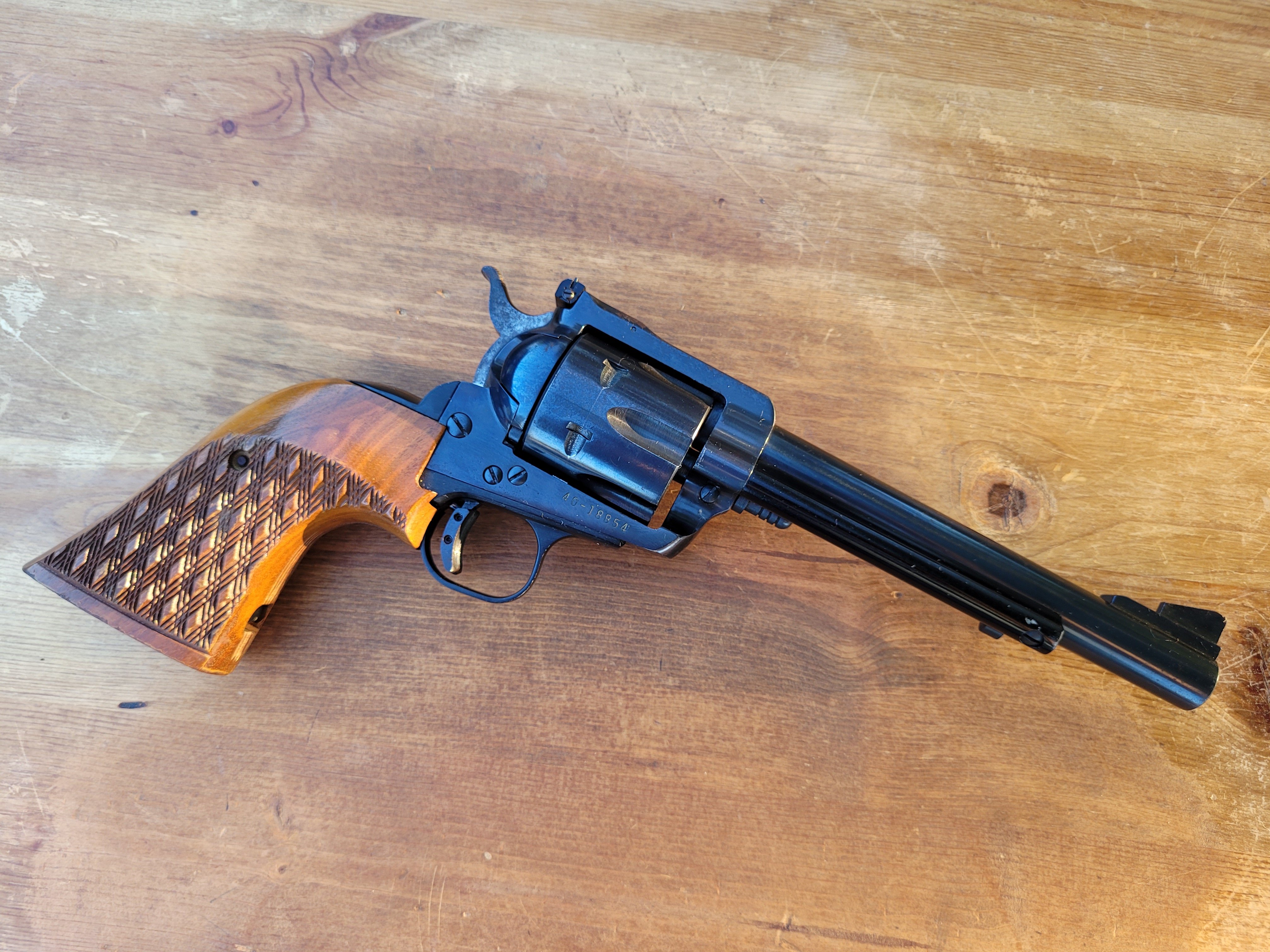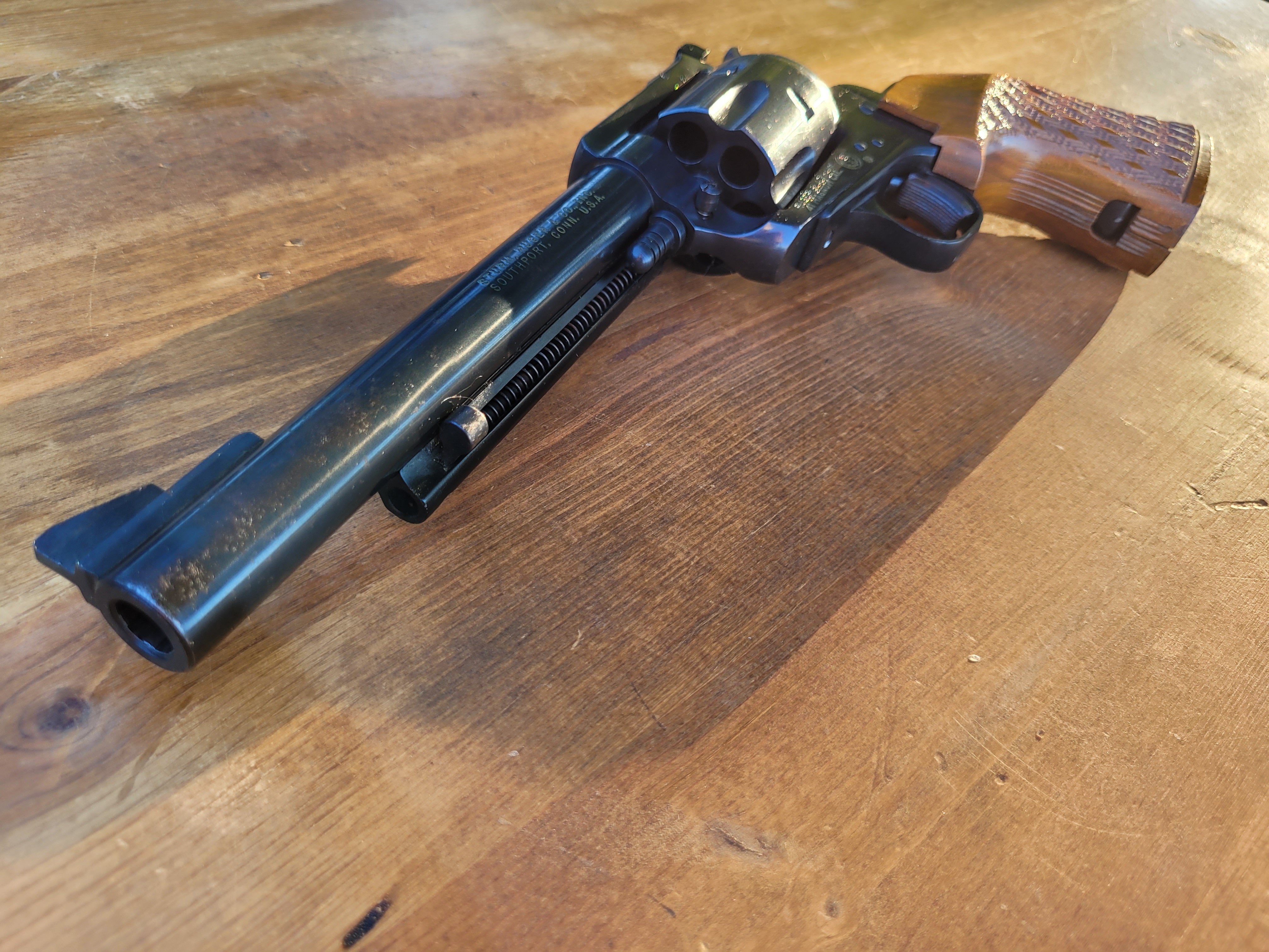 In thanks for my help she gave me her dad's Ruger Blackhawk and rig he had bought back in the 70s. The serial number dates it to 1972 and is in. 41 Mag. There was a rust along the left side of the barrel, the cylinder, and on the frame in a couple of places. I used the old copper penny trick to remove most of it and then used fine copper wool to finish cleaning it up. This is just a shooter so I'm not concerned with refinishing it. It came with this vintage pair of Herrett stocks and they feel good in the hand.