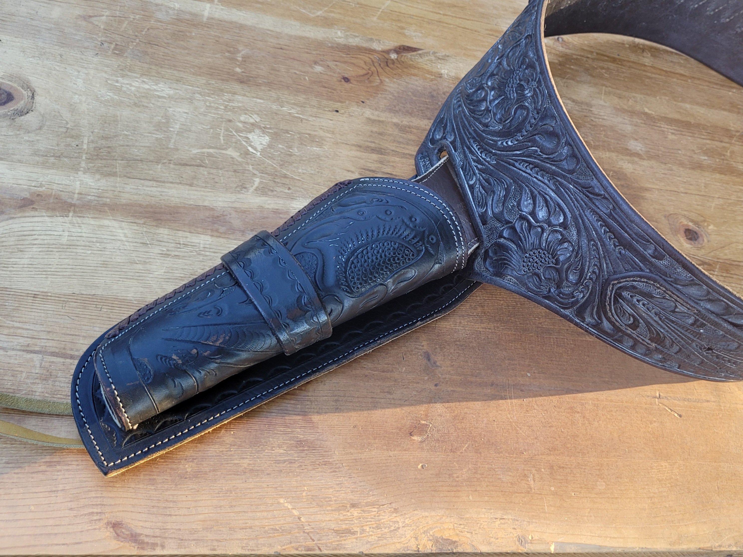 The gun belt is the one that was with it but it had a plain Jane holster on it. I paired one of my dad's old holsters with it and I feel the two go well together. The holster cleaned up pretty easily with some saddle soap and some Lexol.