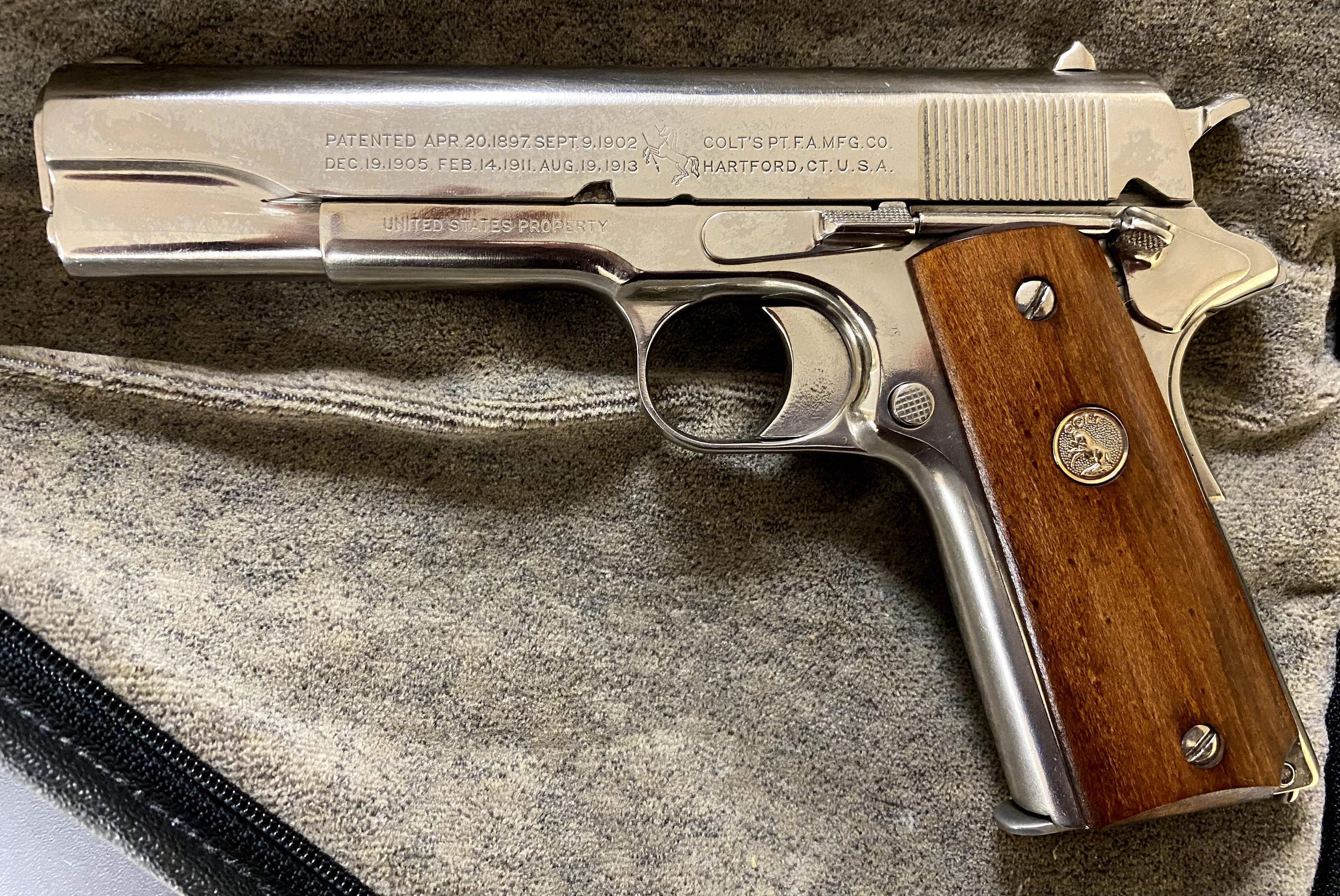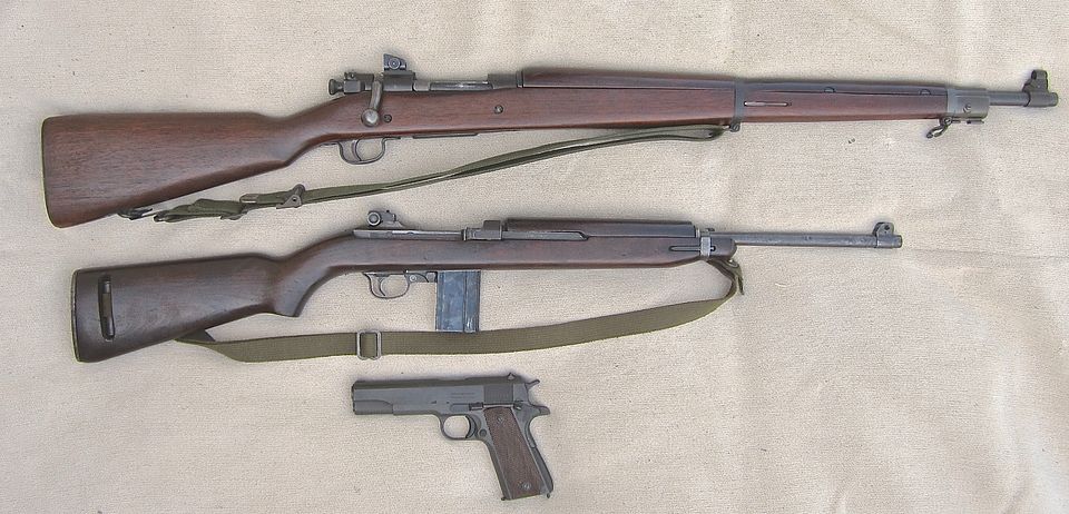 Shown here with two other World War II "typewriter company" contract arms, an October 1943 produced M1 Carbine produced by Underwood and a January of 1944 produced Model 1911A1 pistol manufactured by Remington Rand.
