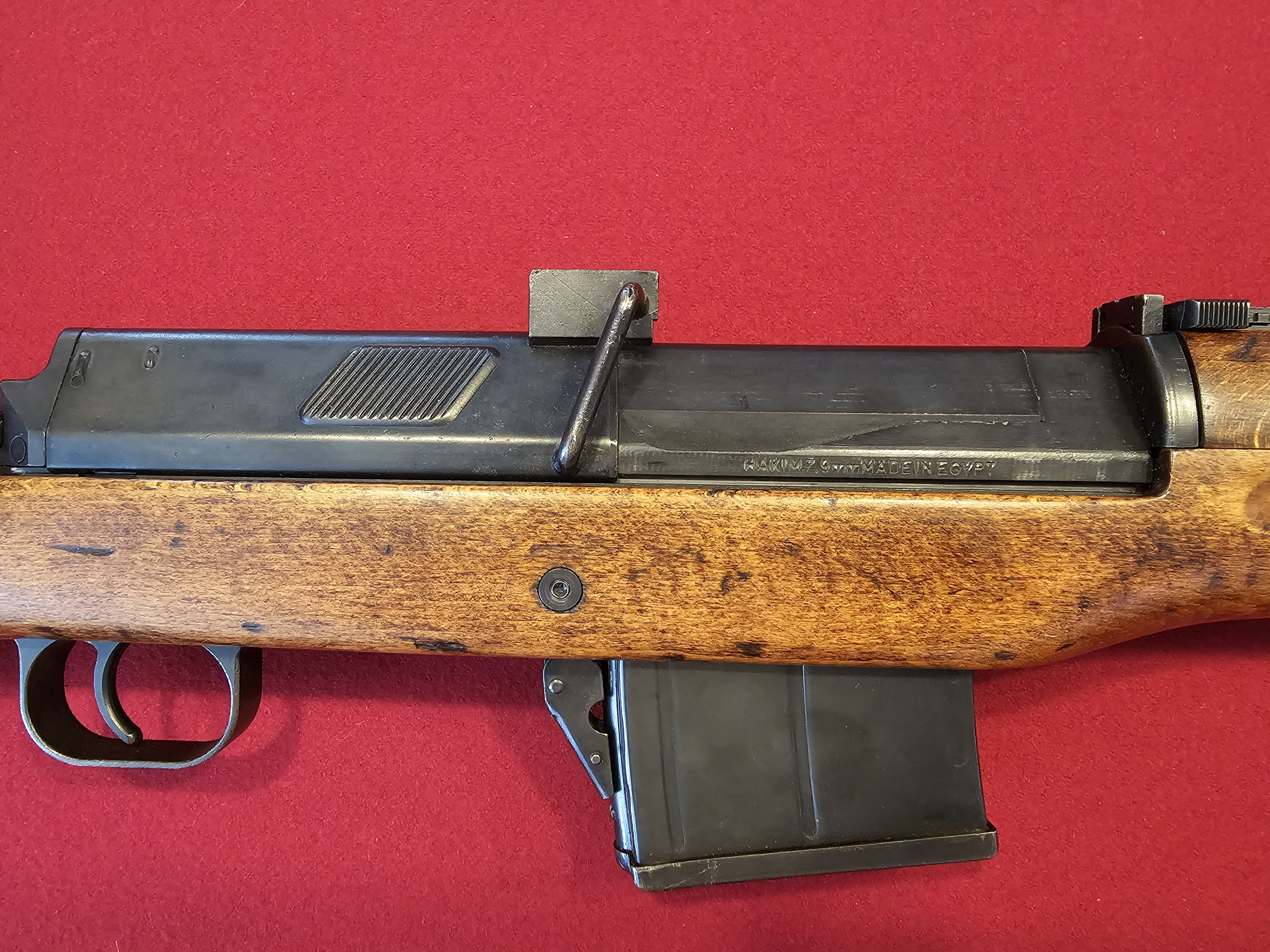On an occasion the load was a bit too mild. My brother-in-law snapped this photo of my plight in between gales of laughter. A copper washed, truncated cone bullet intended for the .45 ACP behind a very mild charge of Red Dot powder stopped just short of exiting the barrel. Almost, but not quite nearly ...