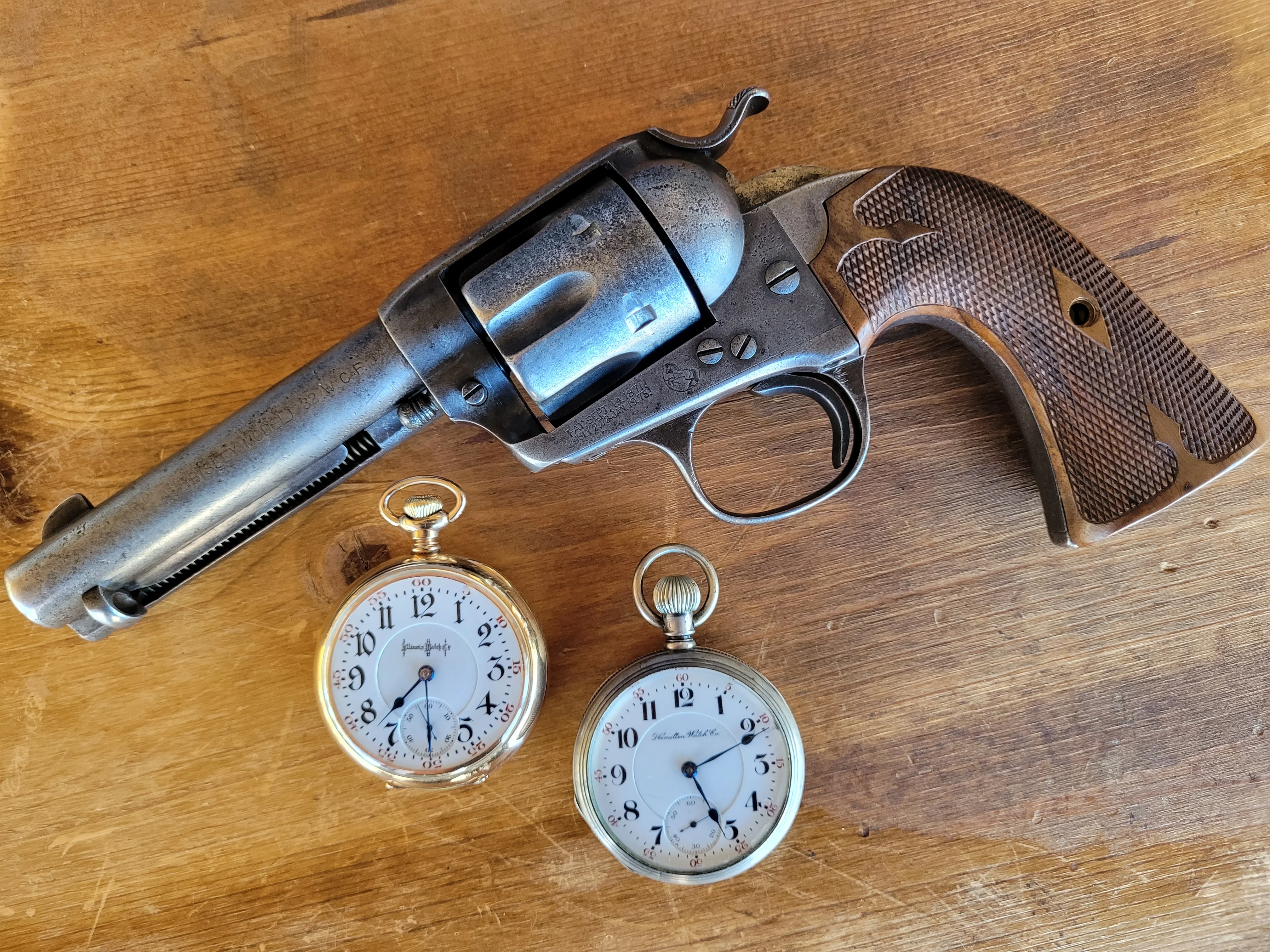 A 1903 Hamilton 940 (coin silver case), a 1904 Illinois Bunn Special (25 year GF Case), and a 1905 Colt Bisley.
