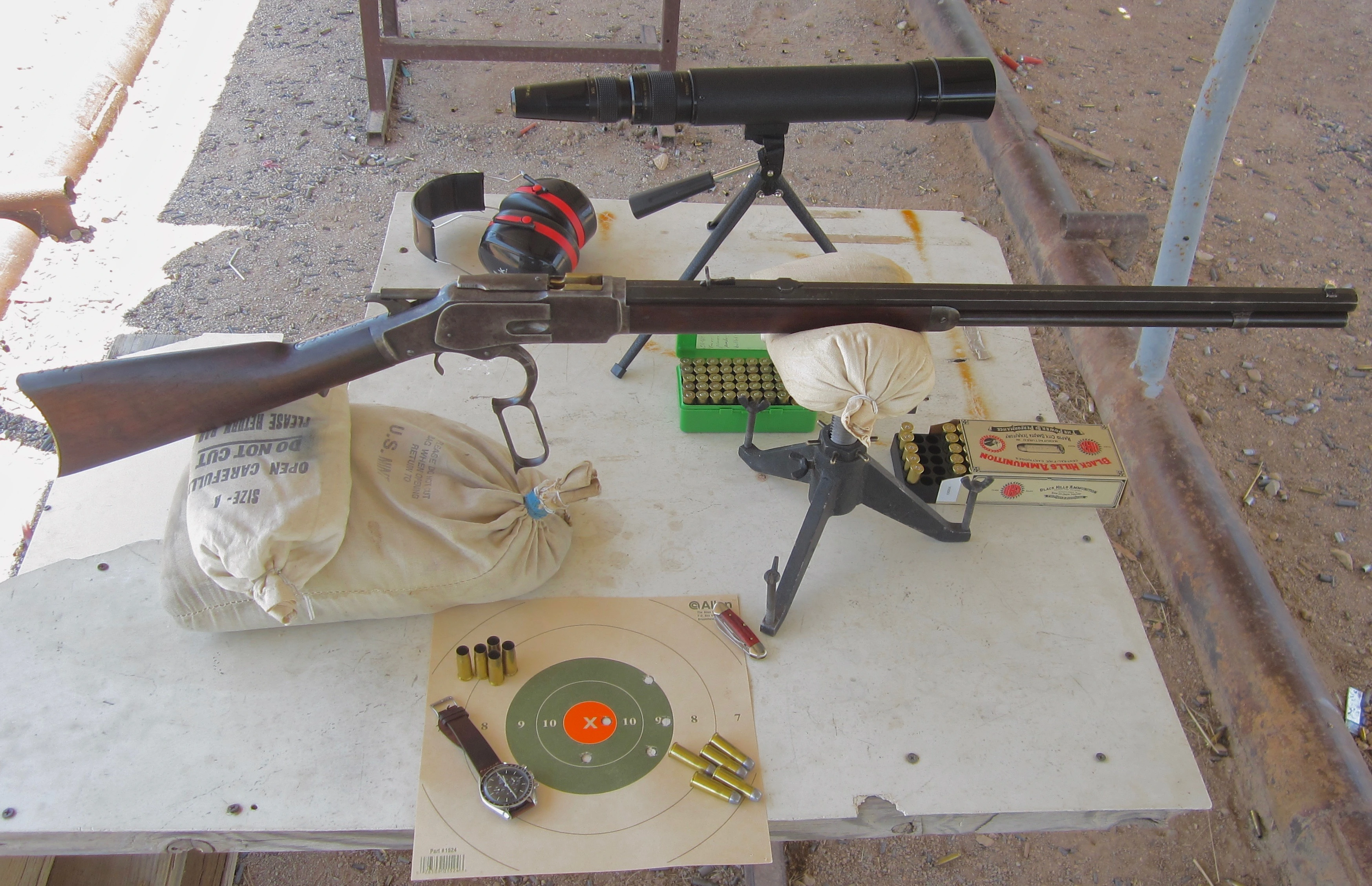 A Speedmaster paper weight on a windy day helping to hold down the best 100 yard 5-shot group shot off a bench rest with an original Winchester Model 1873 chambered for .38 WCF (.38-40).