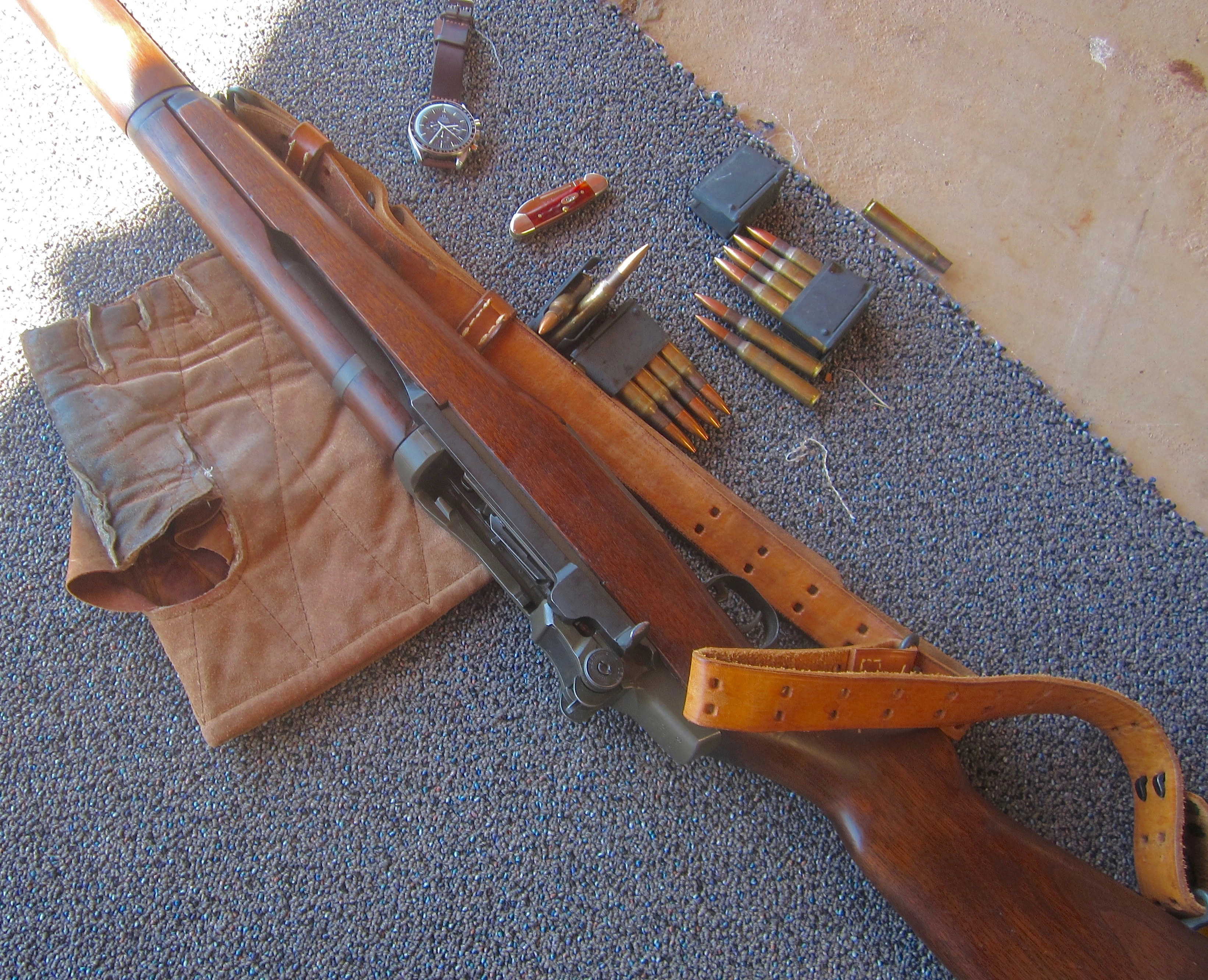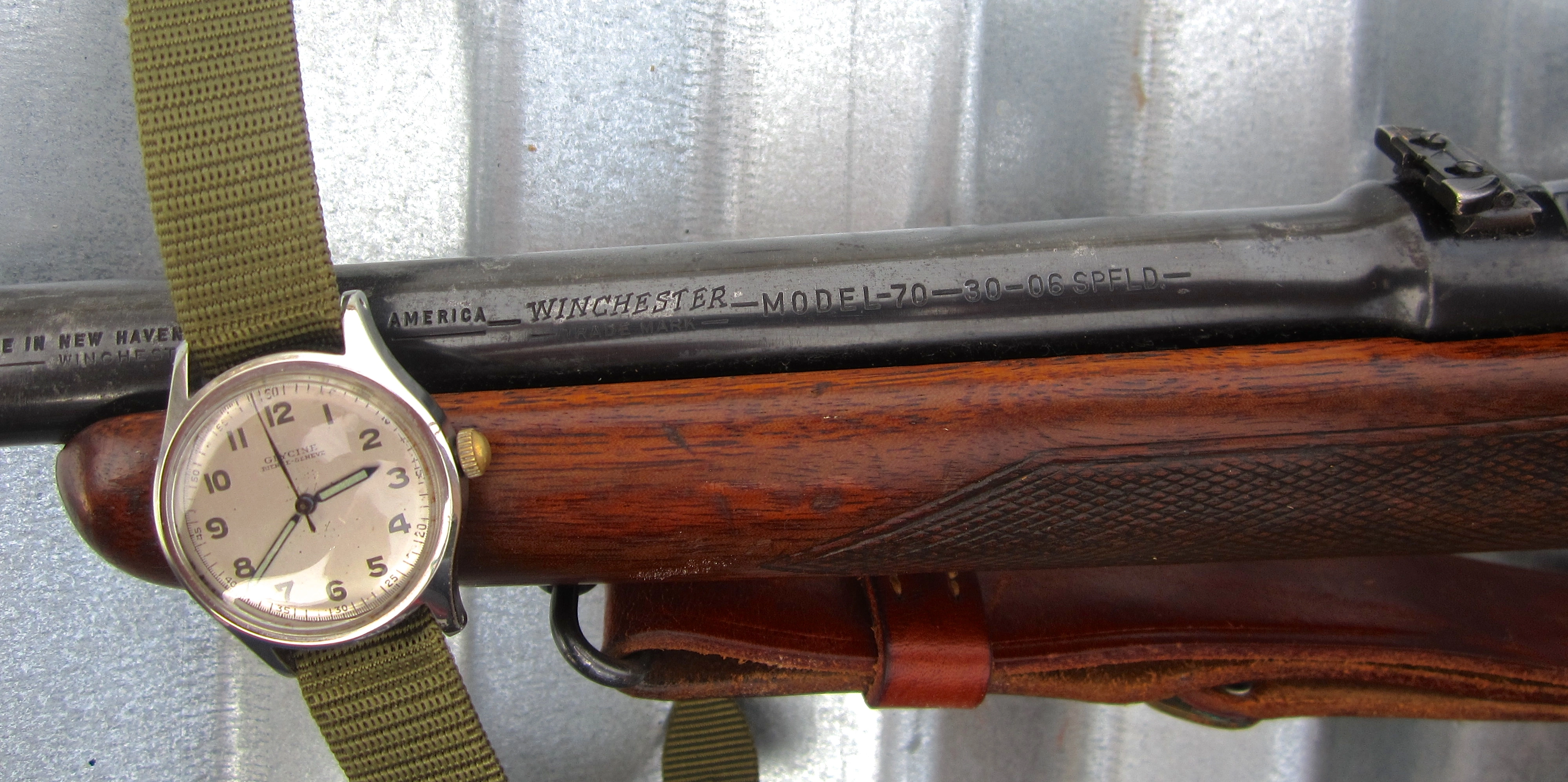 Favorite big game rifle, a 1953 vintage Winchester Model 70 .30-06 and the long time huntin', fishin, hikin', workin', beater Glycine watch.
