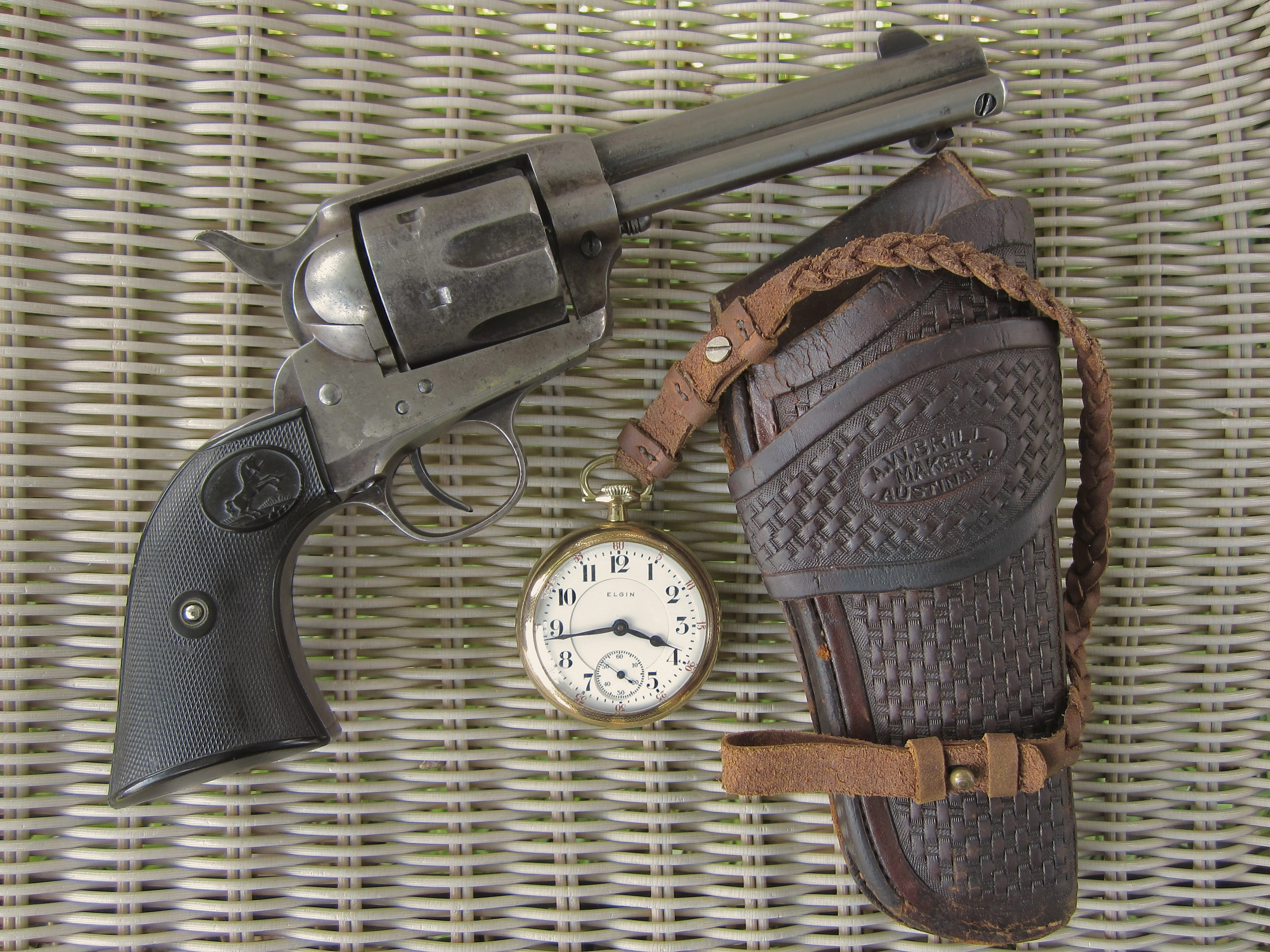 A 1905 Colt Single Action Army .38 WCF (.38-40) and a 1905 Elgin Father Time with an early period Brill holster, correct for a Colt Single Action Army with 4 3/4-inch barrel.