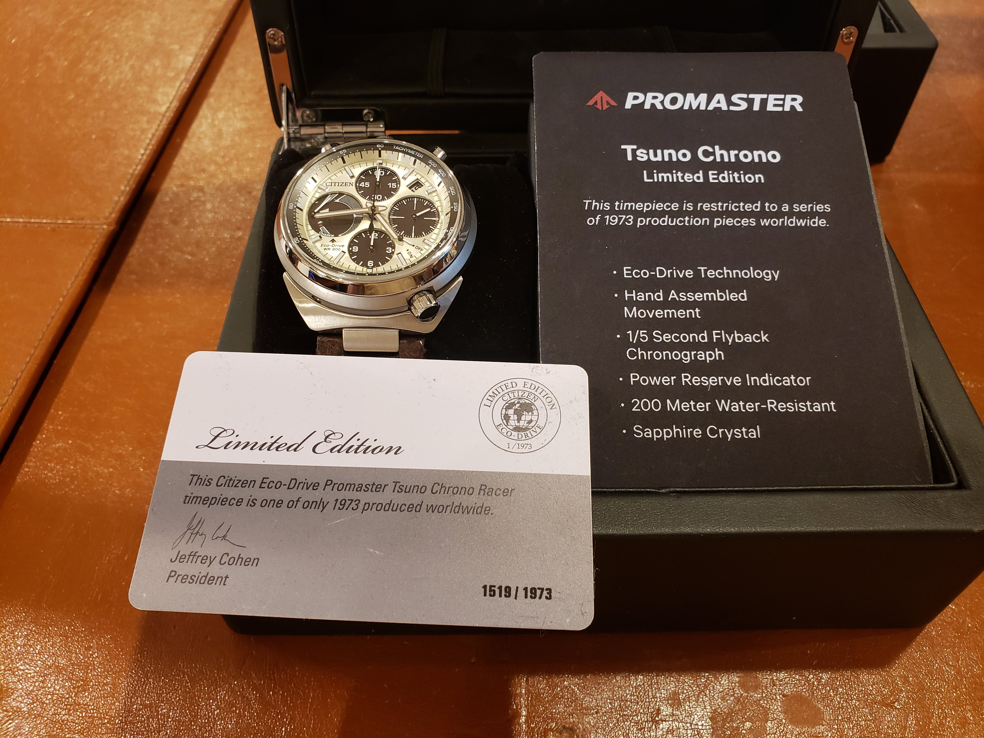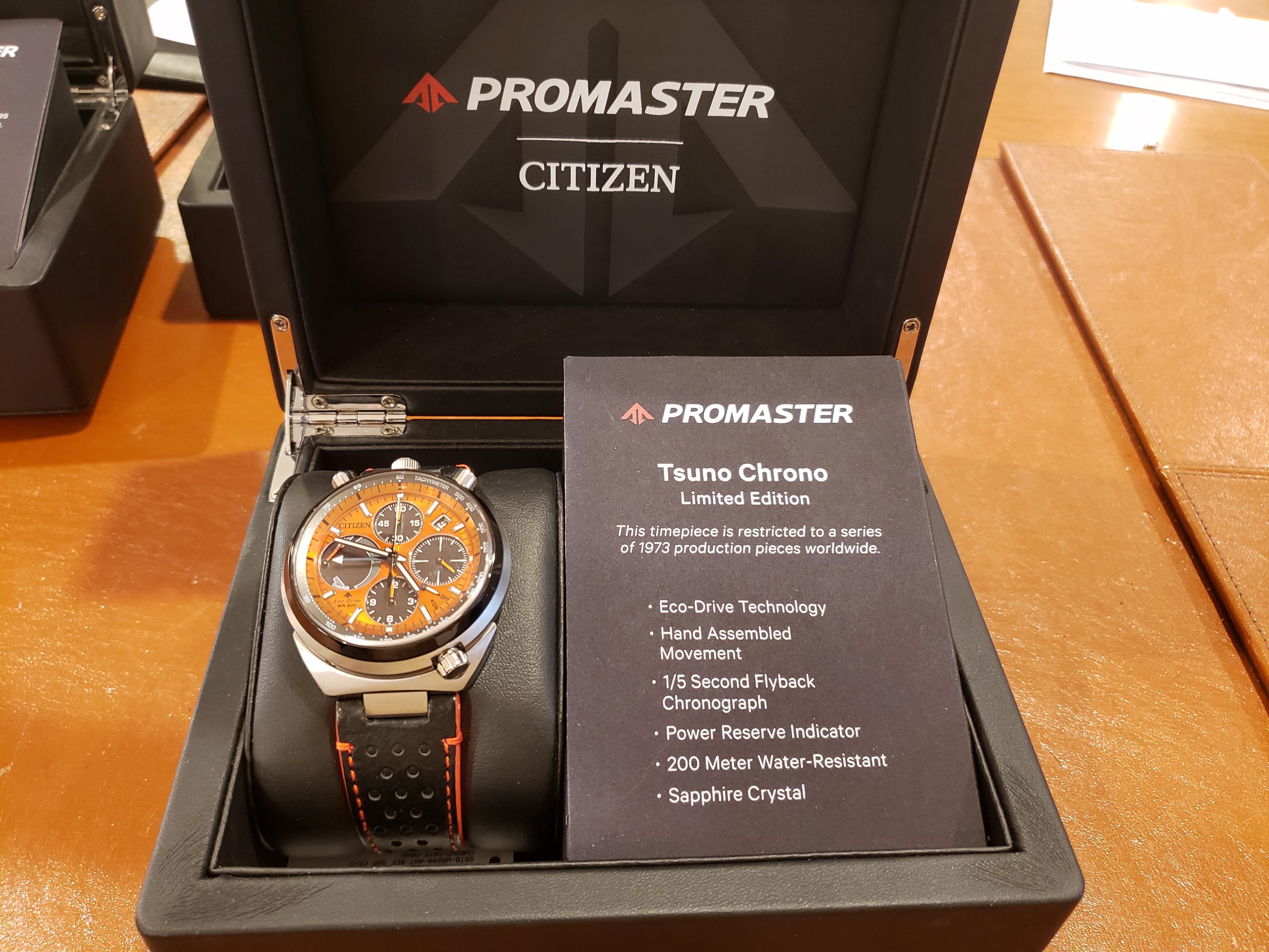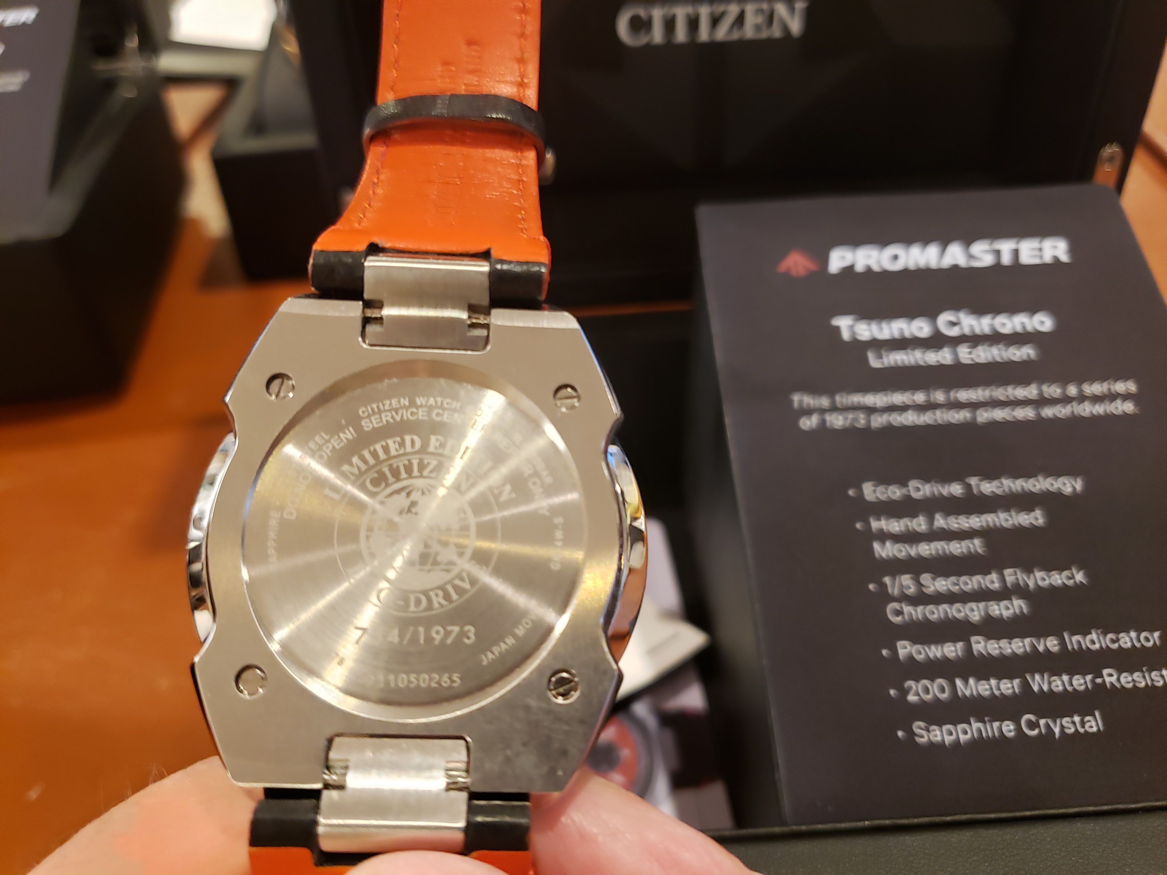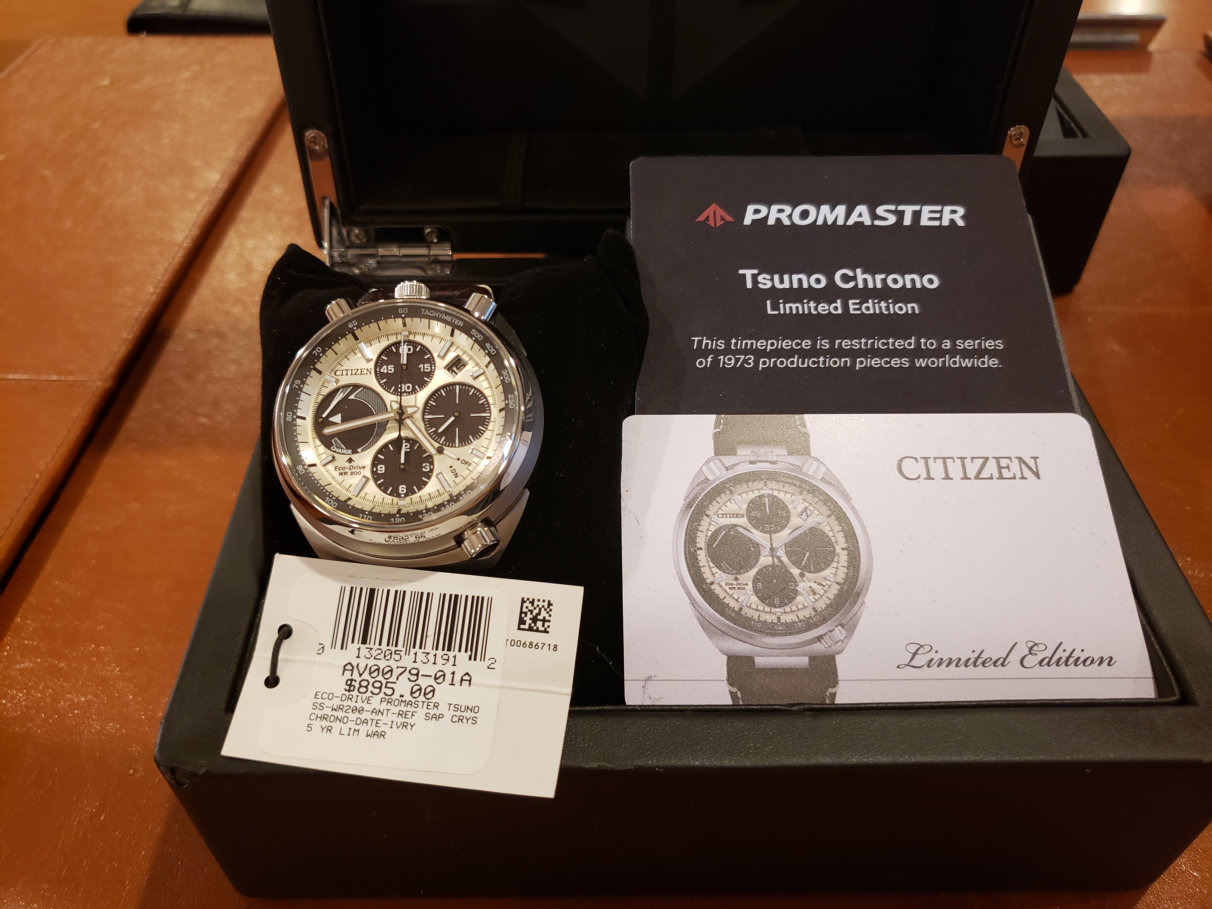 All three are LNIB, worn fewer than 6 times around the house. No nicks, dents or scratches. Display boxes with informational plaques, original hang tags and authenticity cards also included. I believe I also have the original shipping boxes. Full disclosure: the box holding the Ivory face dial was purchased used on Ebay. The watch was shipped to me new by the dealer in a standard Citizen Promaster plastic clamshell case which will be included. All three watches were purchased new by me.
