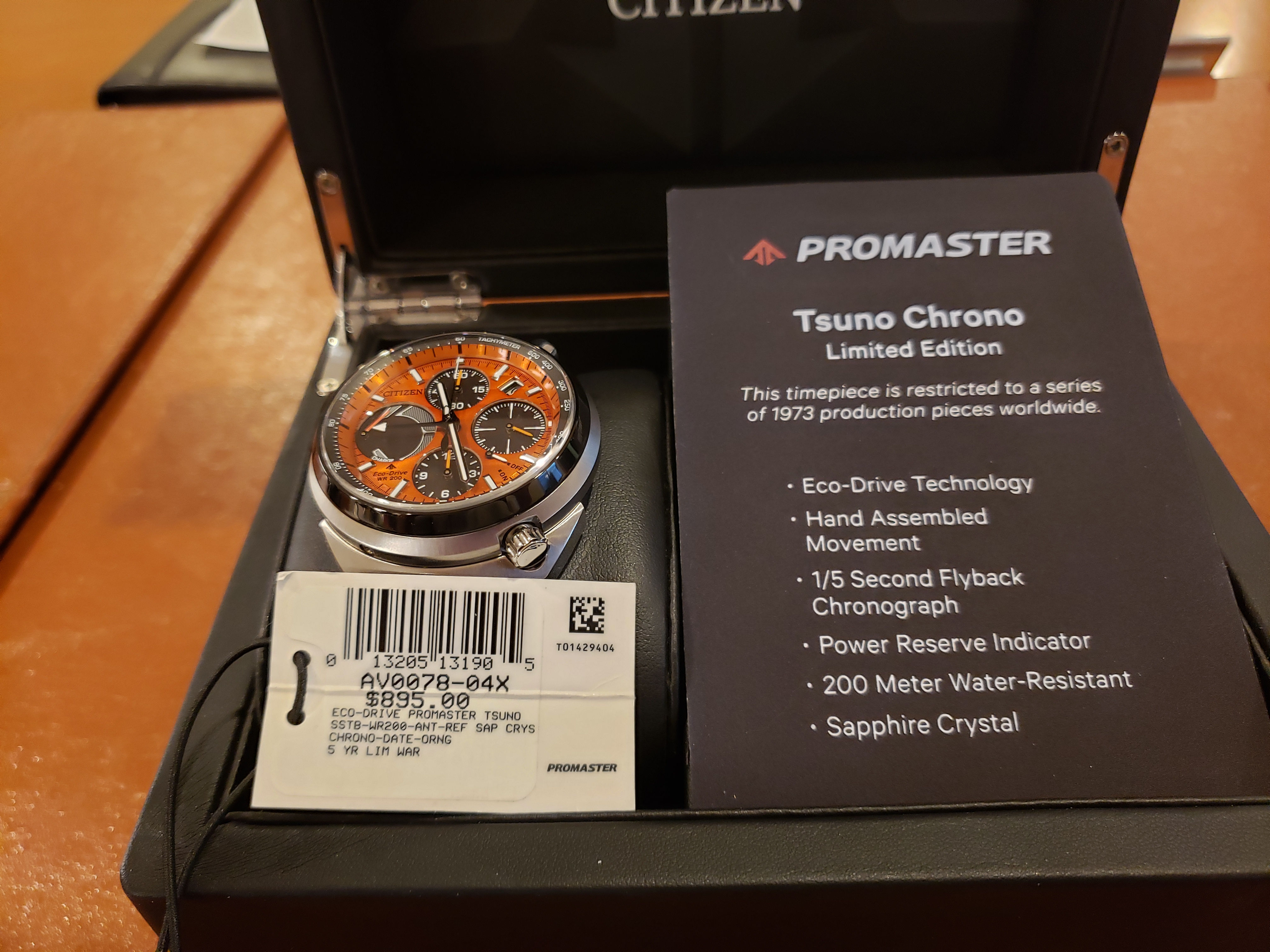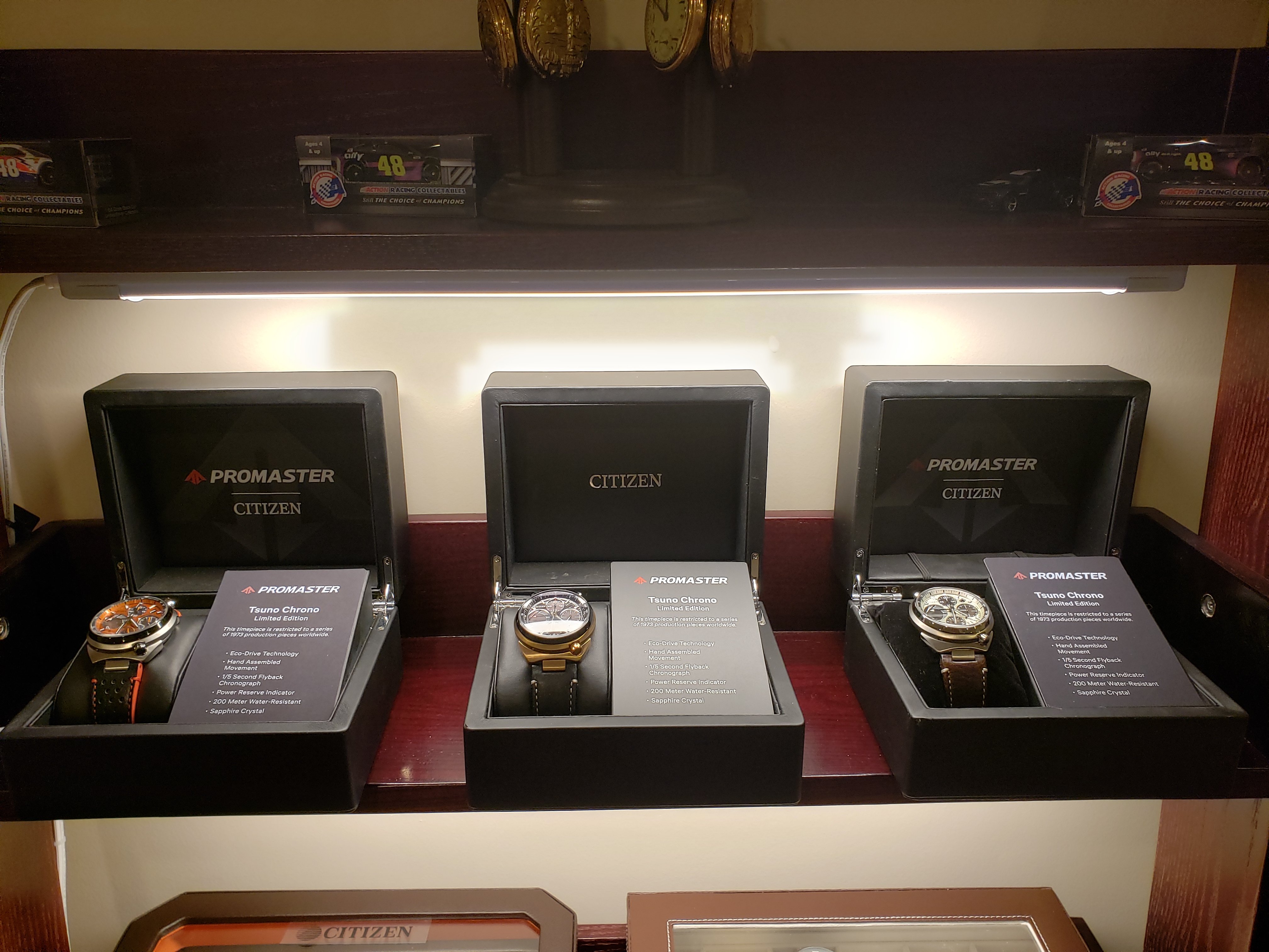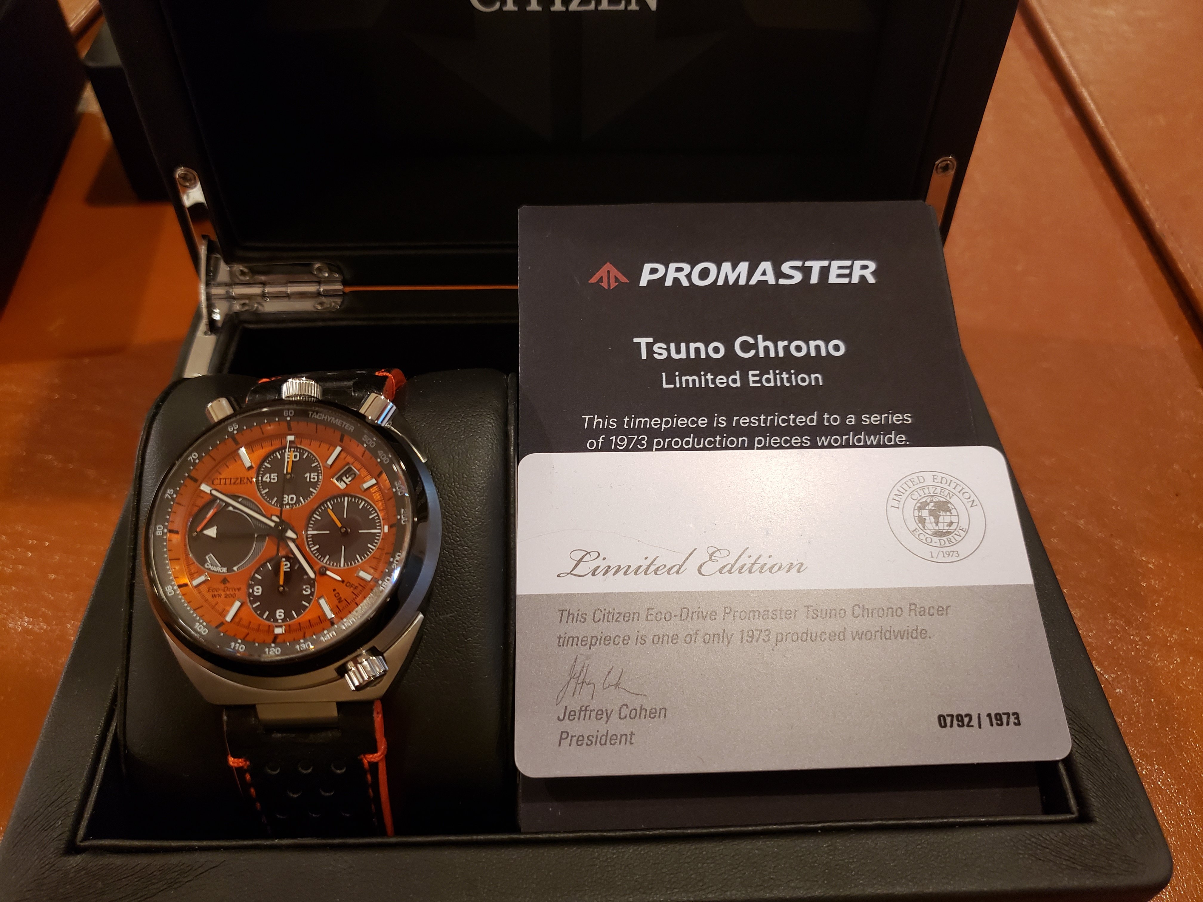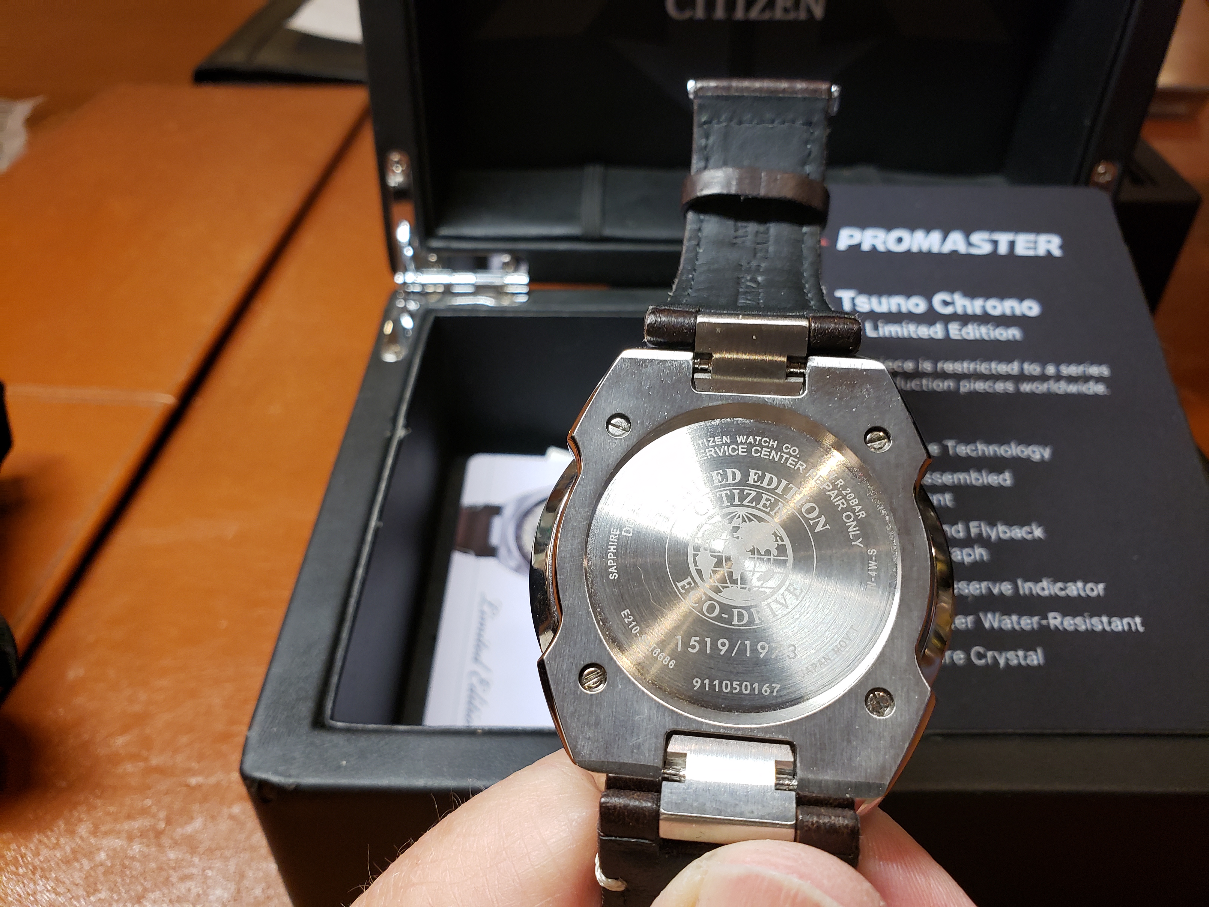 All three are LNIB, worn fewer than 6 times around the house. No nicks, dents or scratches. Display boxes with informational plaques, original hang tags and authenticity cards also included. I believe I also have the original shipping boxes. Full disclosure: the box holding the Ivory face dial was purchased used on Ebay. The watch was shipped to me new by the dealer in a standard Citizen Promaster plastic clamshell case which will be included. All three watches were purchased new by me.