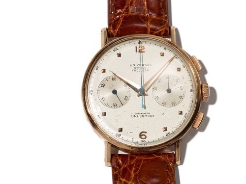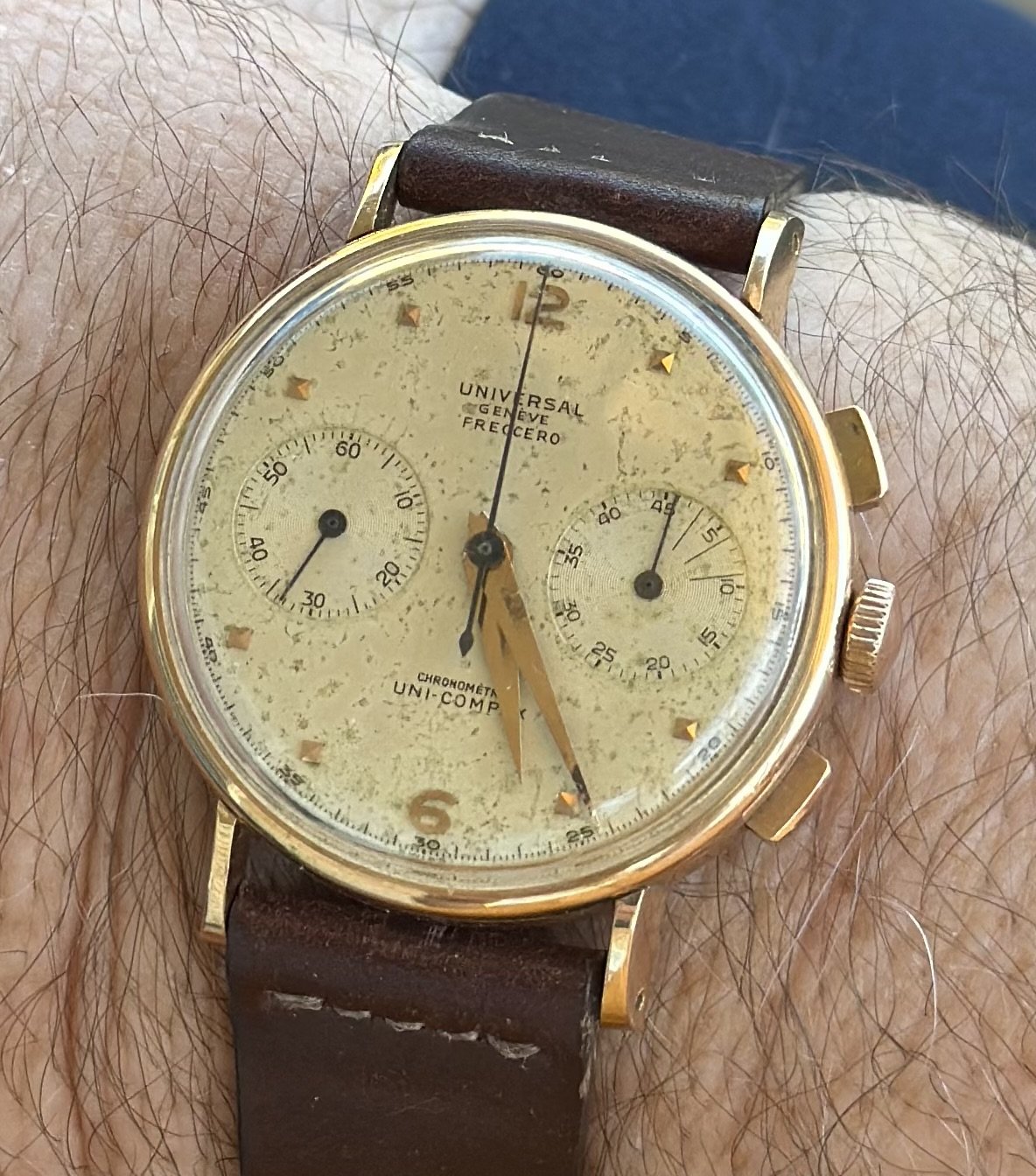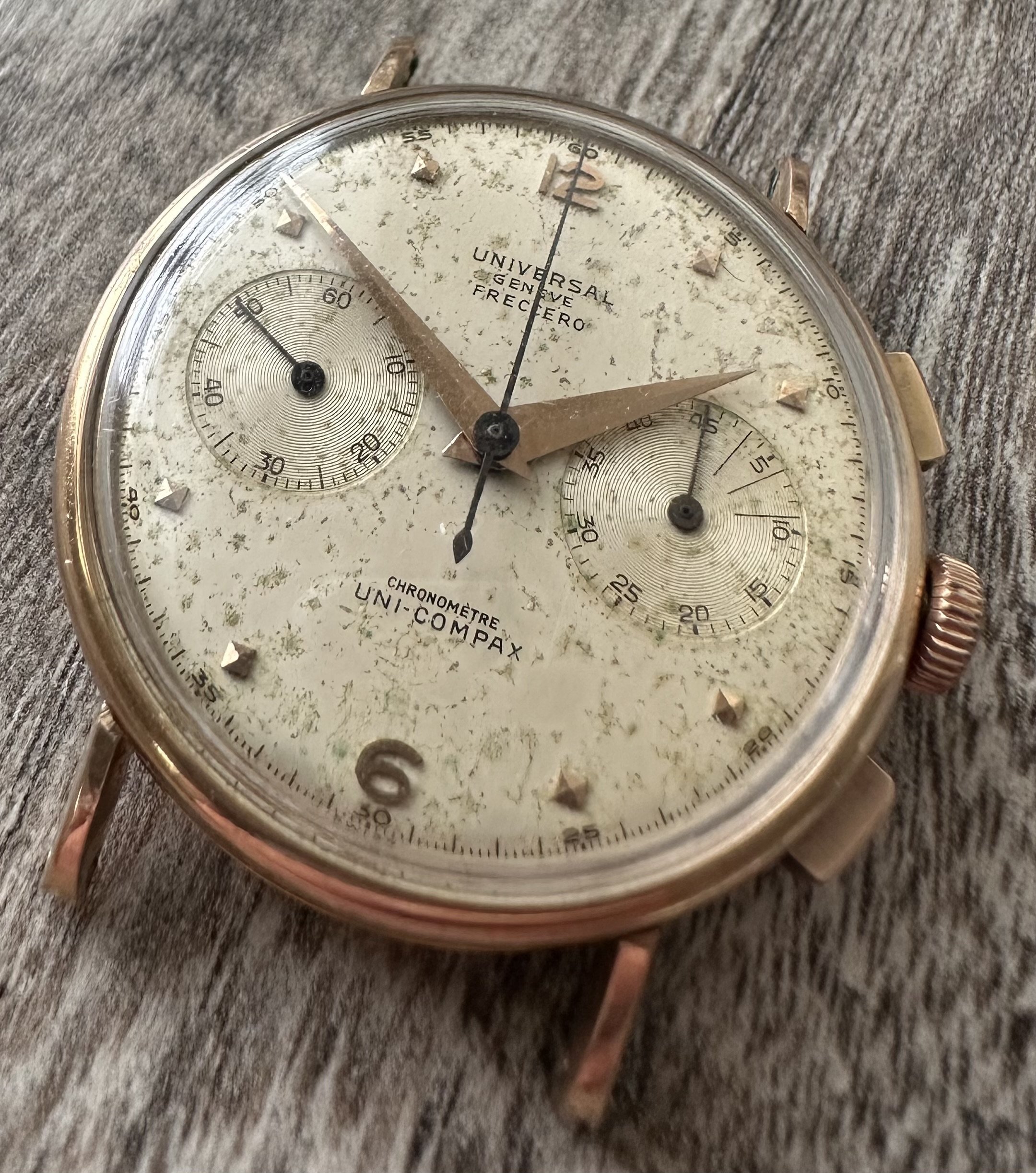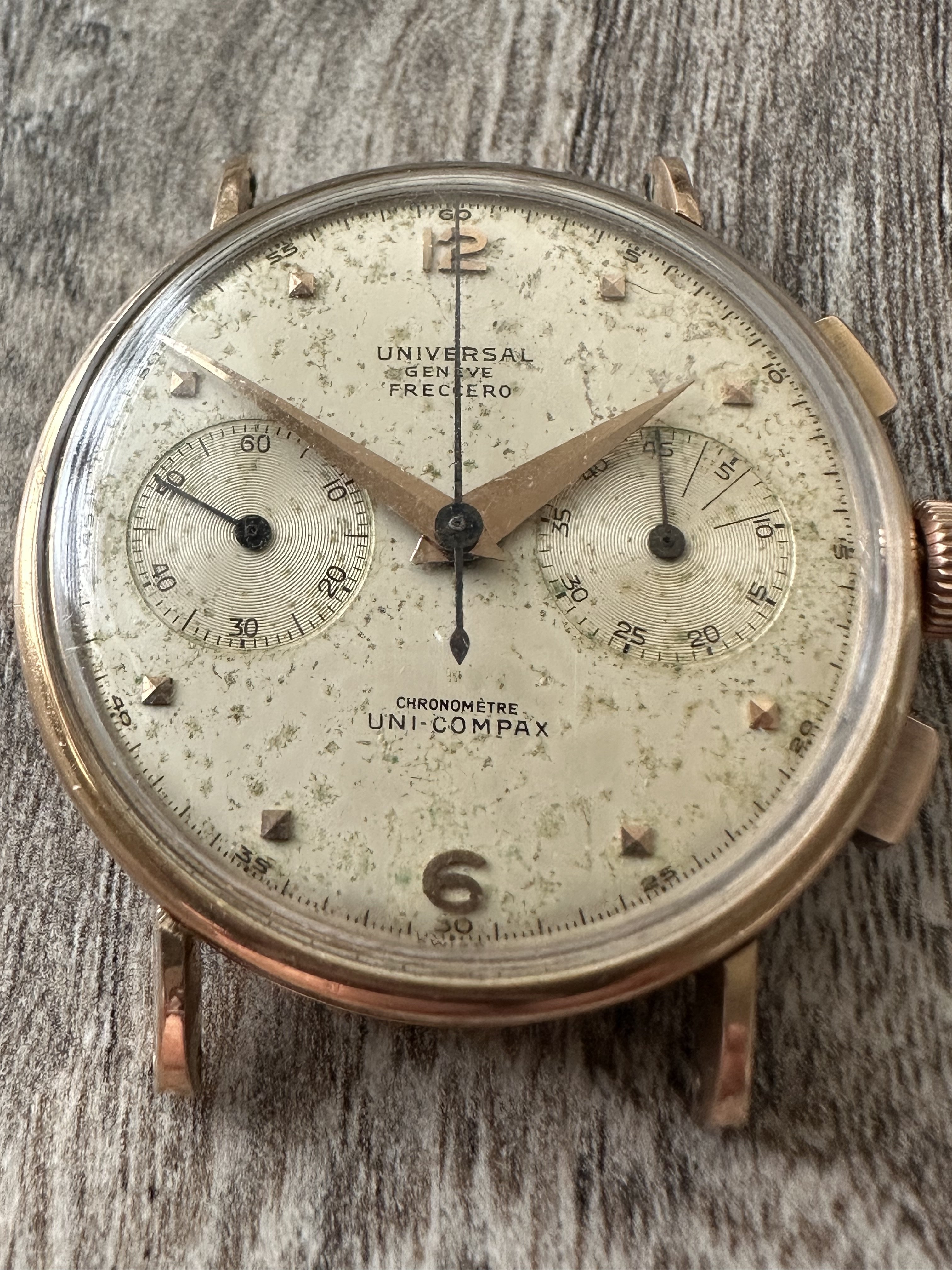 ·Offered for your consideration is my 1950 Universal Geneve ref. 12568 Uni Compax chronograph retailed by Freccero of Montevideo, Uraguay. I purchased this watch from an auction a few months past mostly as I was intrigued by the presentation on the caseback. There are some that will notice Chronometre printed on the dial and no, this is not a chronometre rated movement. LouS, WatchFred and I have discussed this, with LouS provided me with a photo of another Freccero ordered UG ref 12568 within 10 units of this one which is identical. LouS, WatchFred and I all believe this was just a marketing gimmick by Freccero and there is no proof any manufacturer made a chronometer rated chronograph during this period. Now that I have had my fun with it, I am ready to pass it on to someone who is more the UG collector than I am.