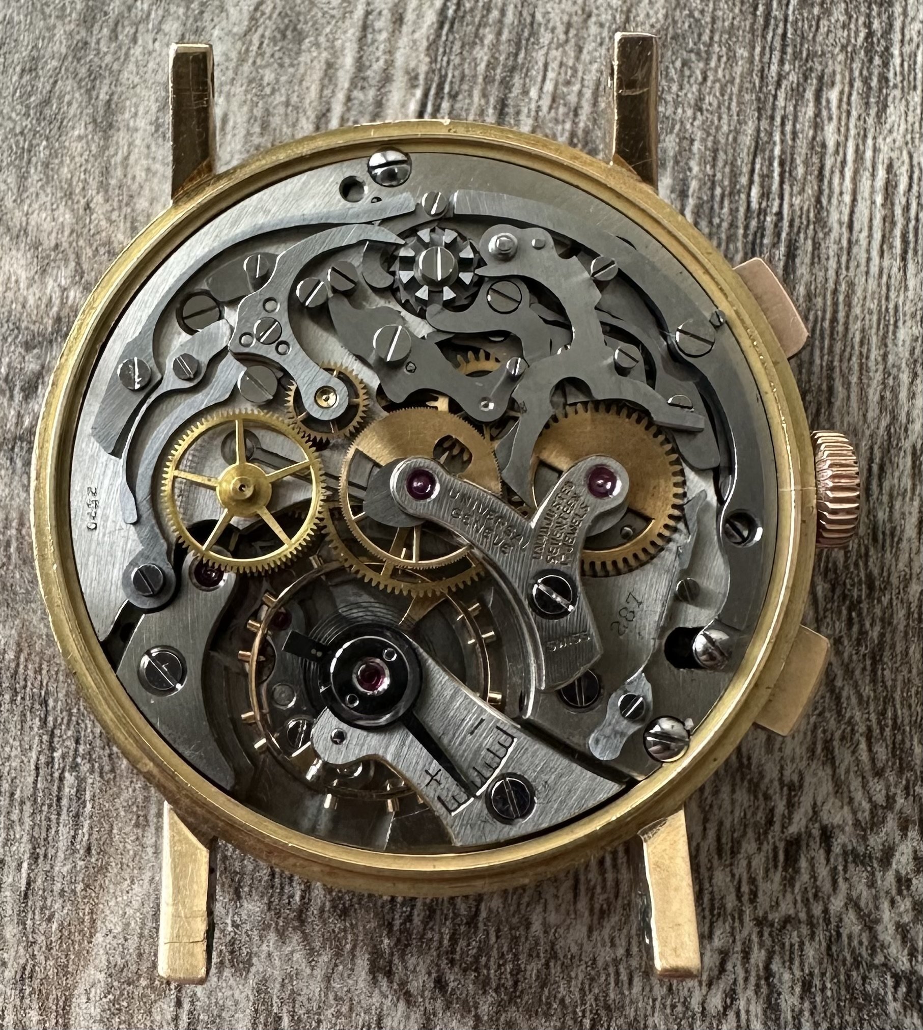 This chronograph has an 18k gold case in beautiful condition and measures 43mm x 39mm w/crown. The dial, hands and crown are original to the watch with the dial having an even patina that is common for watches from high humidity areas but the movement is pristine with no signs of moisture intrusion. Watch keeps great time and chronograph starts, stops and resets as it should. There is a one second advance of the sweep hand when the chronograph starts but a service will remedy this issue easily and recommend servicing as I have not done it and no record of when or if performed in the past.