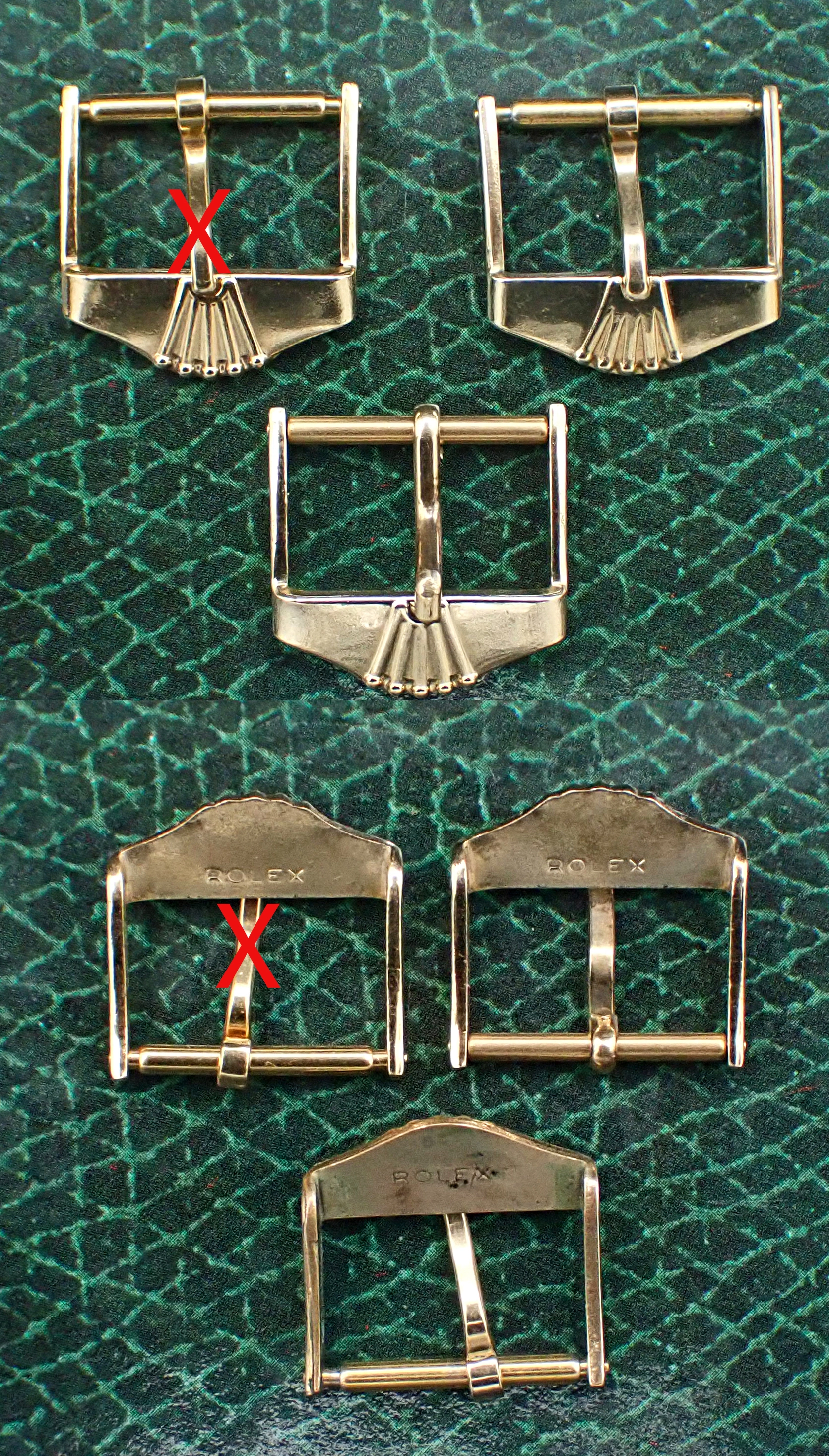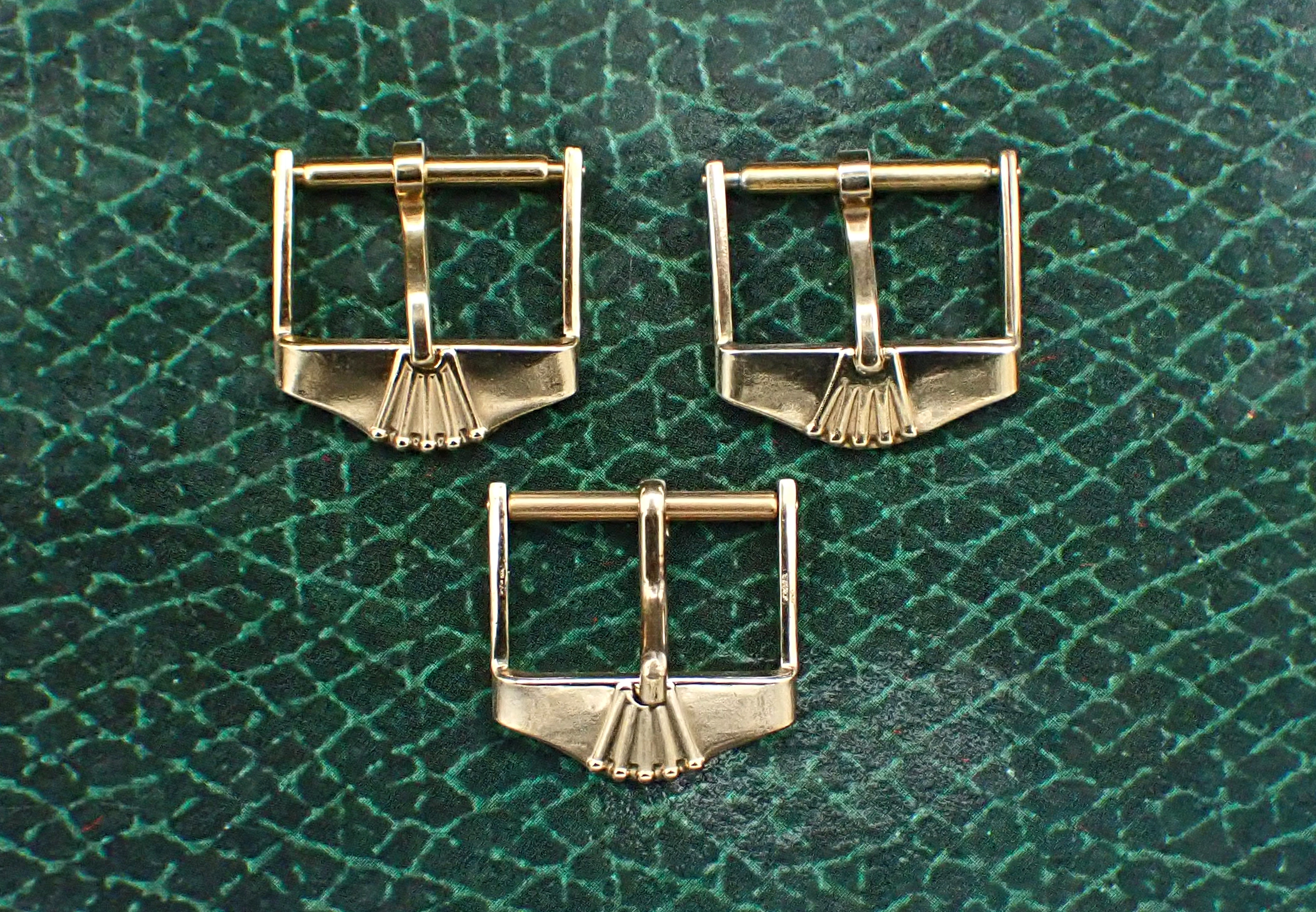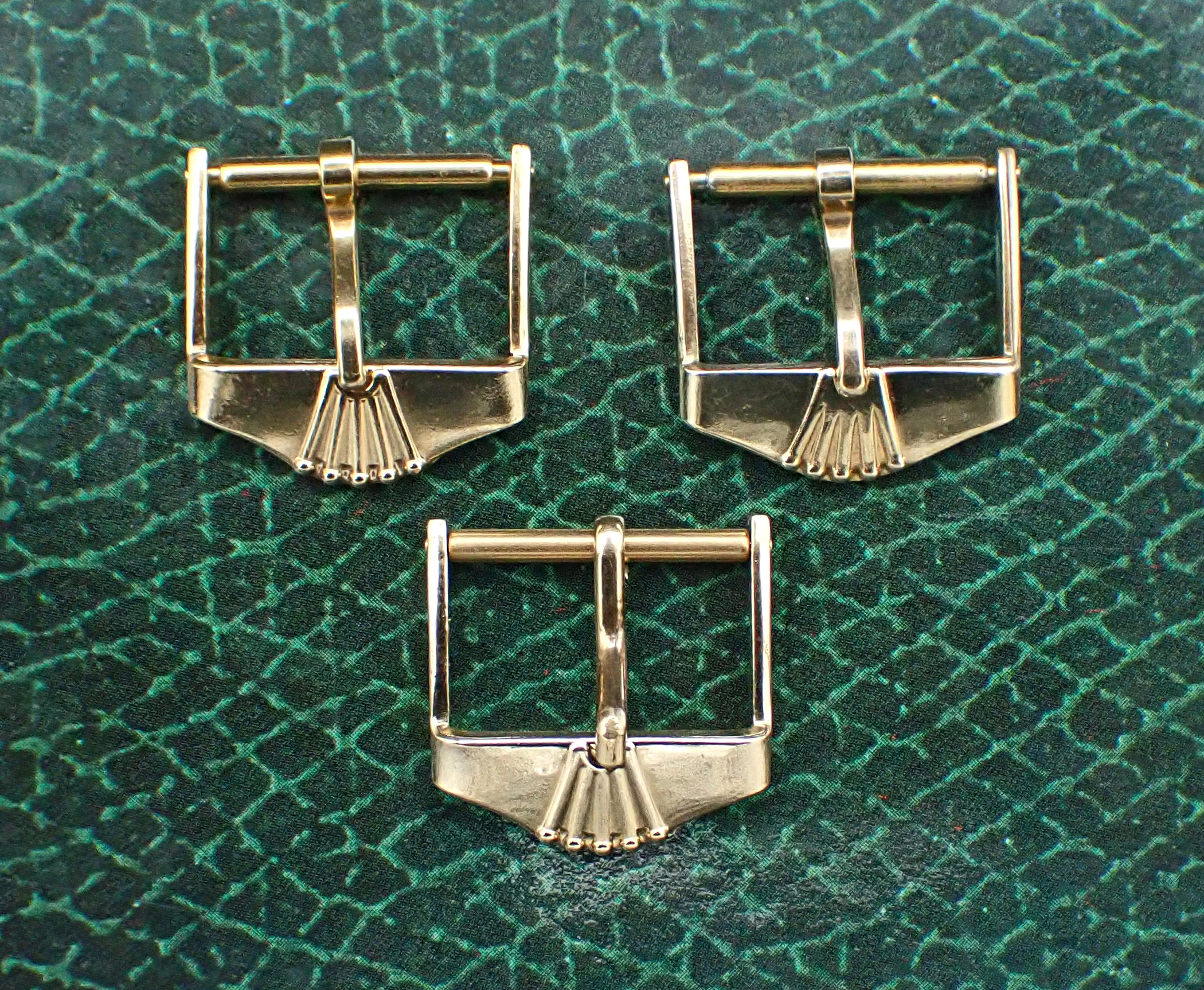 ·On offer here I have three genuine vintage circa 1950s Rolex Big Crown Buckles, aka "Shovel", in Yellow Gold Filled and 16mm width for a variety of classic Rolex models in gold. These were made for the American market by Rolex USA and have a very unique oversized, highly stylized Rolex Coronet where the tang meets the buckle. These buckles are in Excellent overall vintage condition, with only normal signs of wear and age and no major defects.