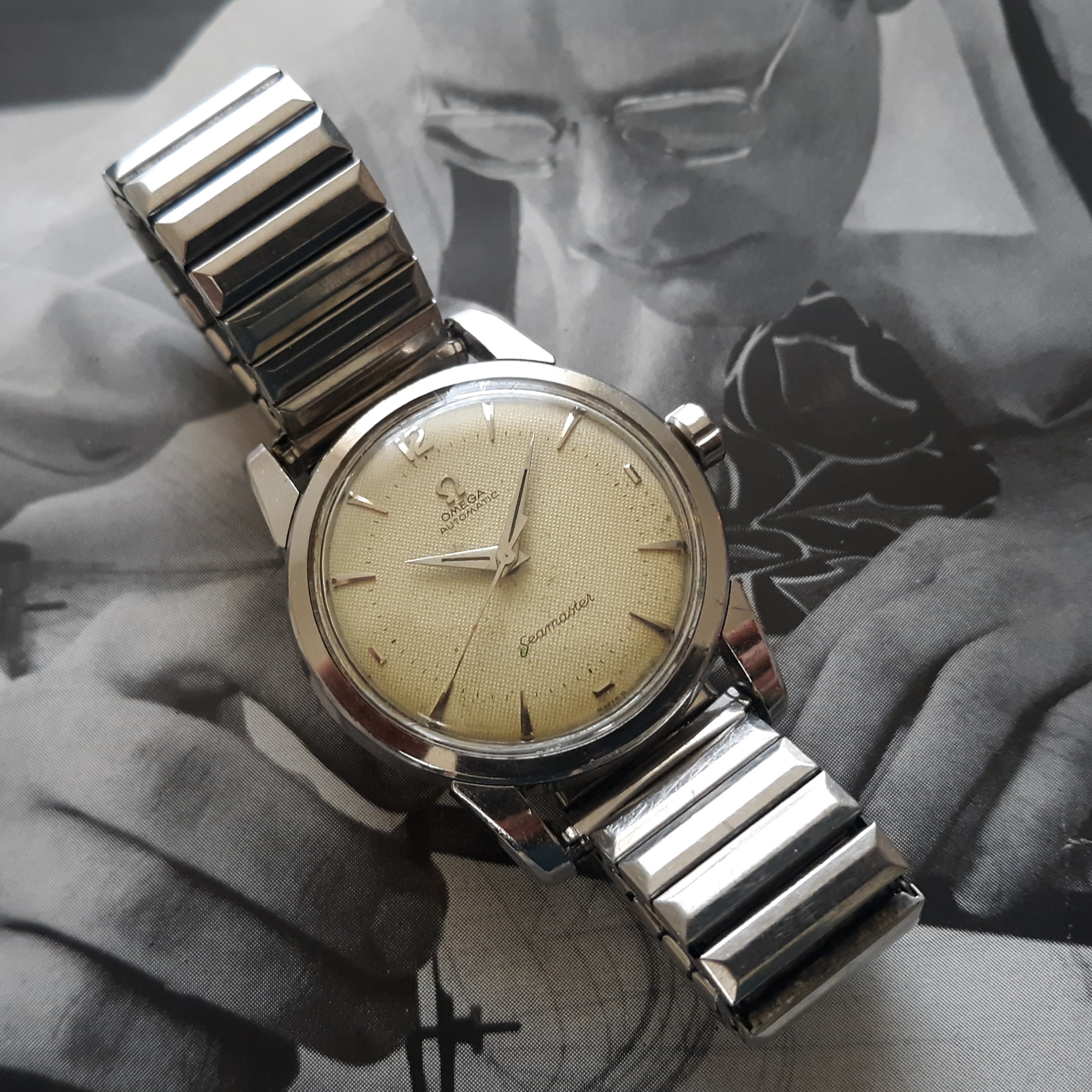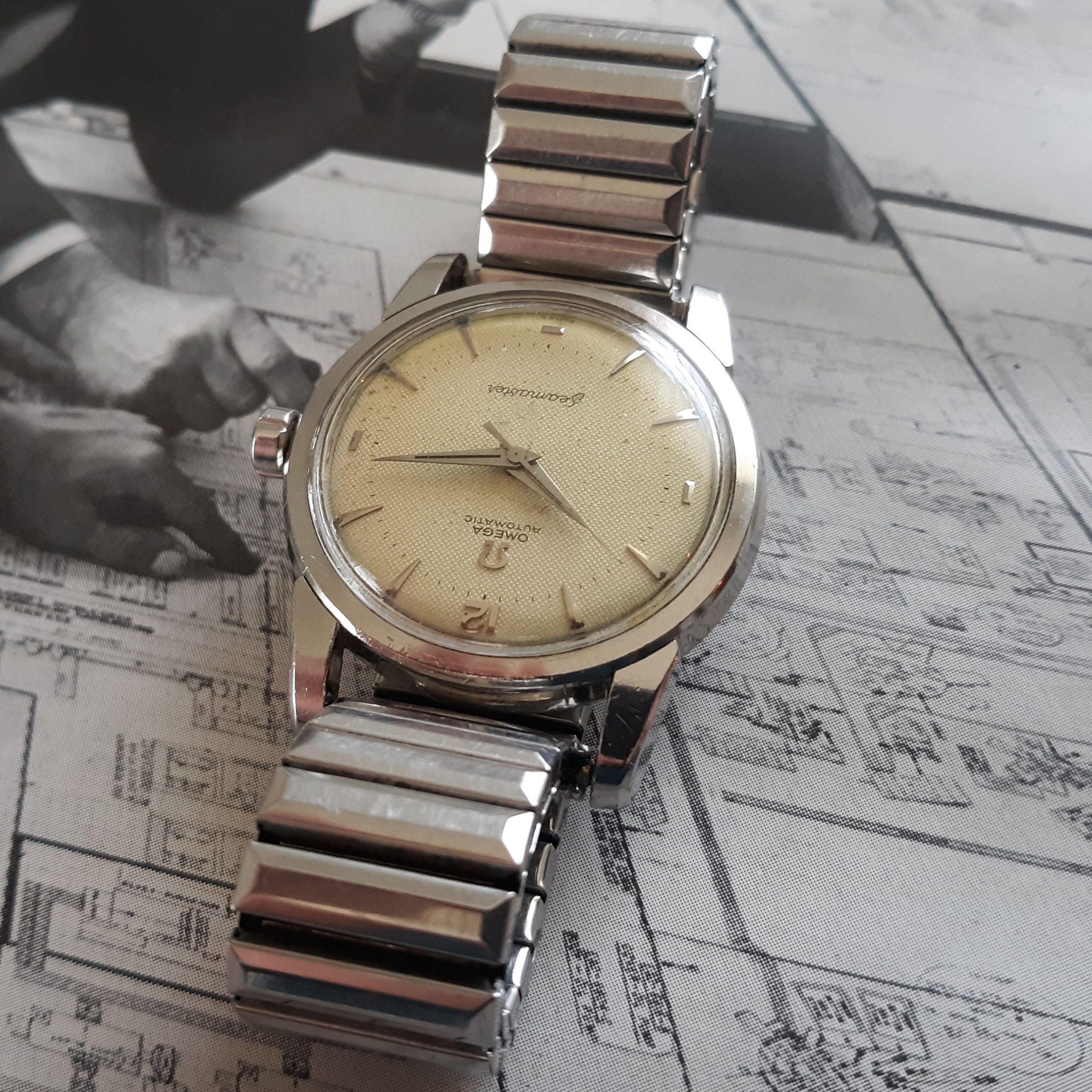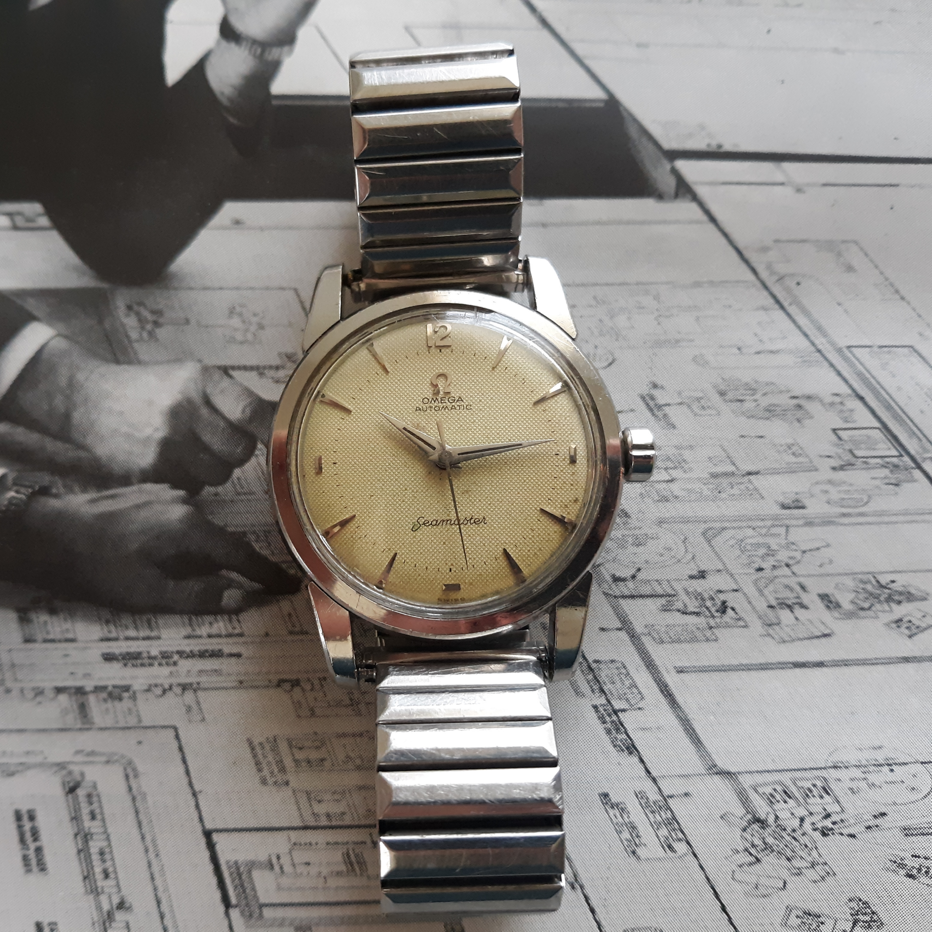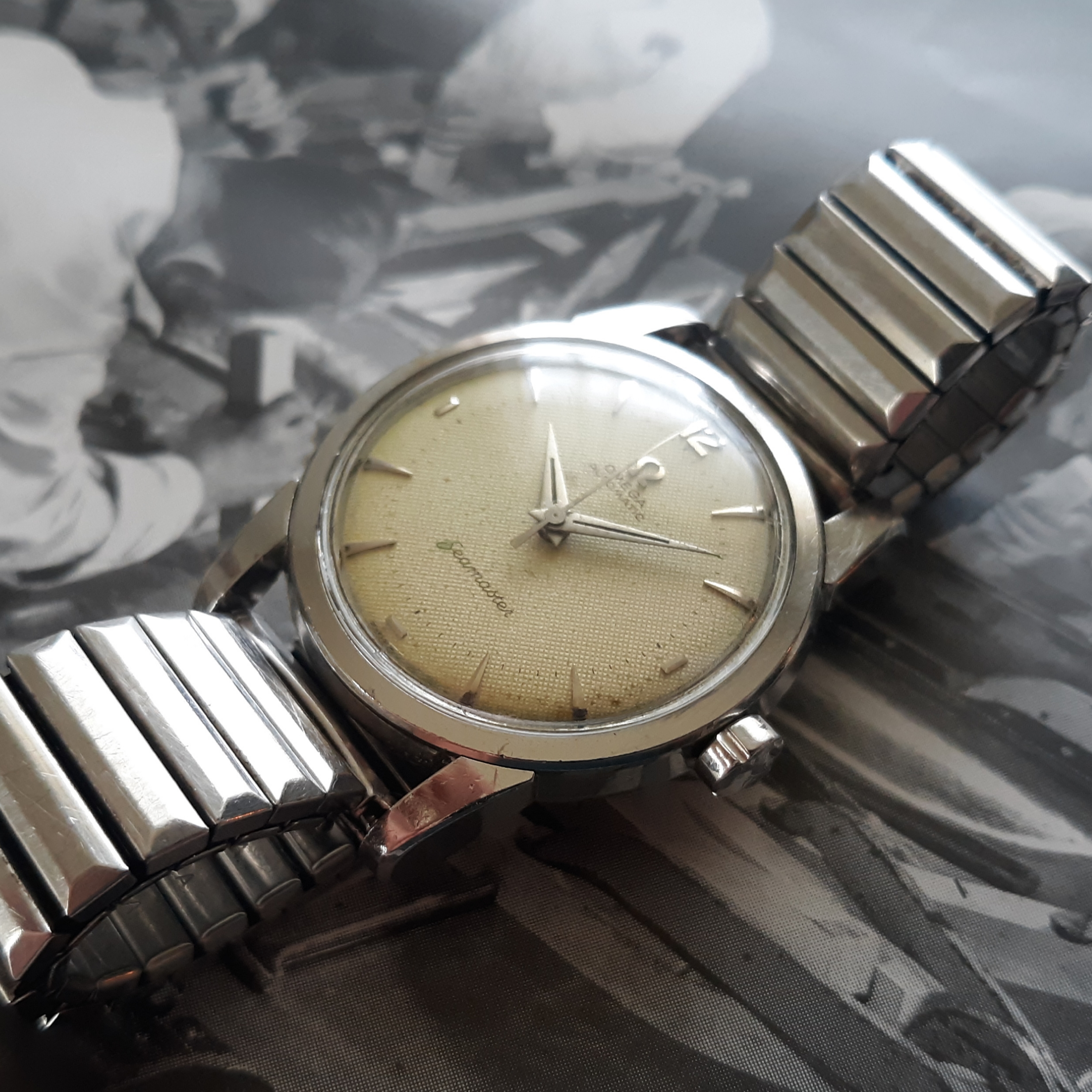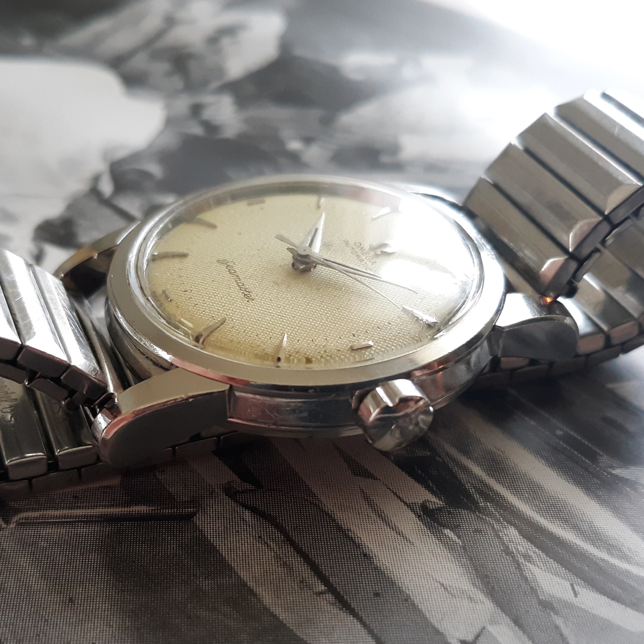 ·Here we have a 1955 Seamaster in solid steel, reference 2846-1. The watch appears all original, minus the steel Speidel band. The white textured dial shows some patina and has silver raised markers. The 34mm case has a snap on case, which snaps very firmly into place. The caliber 500 was serviced mid last year, and keeps great time. Lug width is 18mm. Two minor quirks: the crown is slightly crooked (not too bad though), and the rotor raddles slightly (but it doesn't appear to be rubbing against anything). You probably know the watch, but PM me with any inquiries. I'm asking $525 or best offer, plus shipping. Returns only accepted if grossly misrepresented.