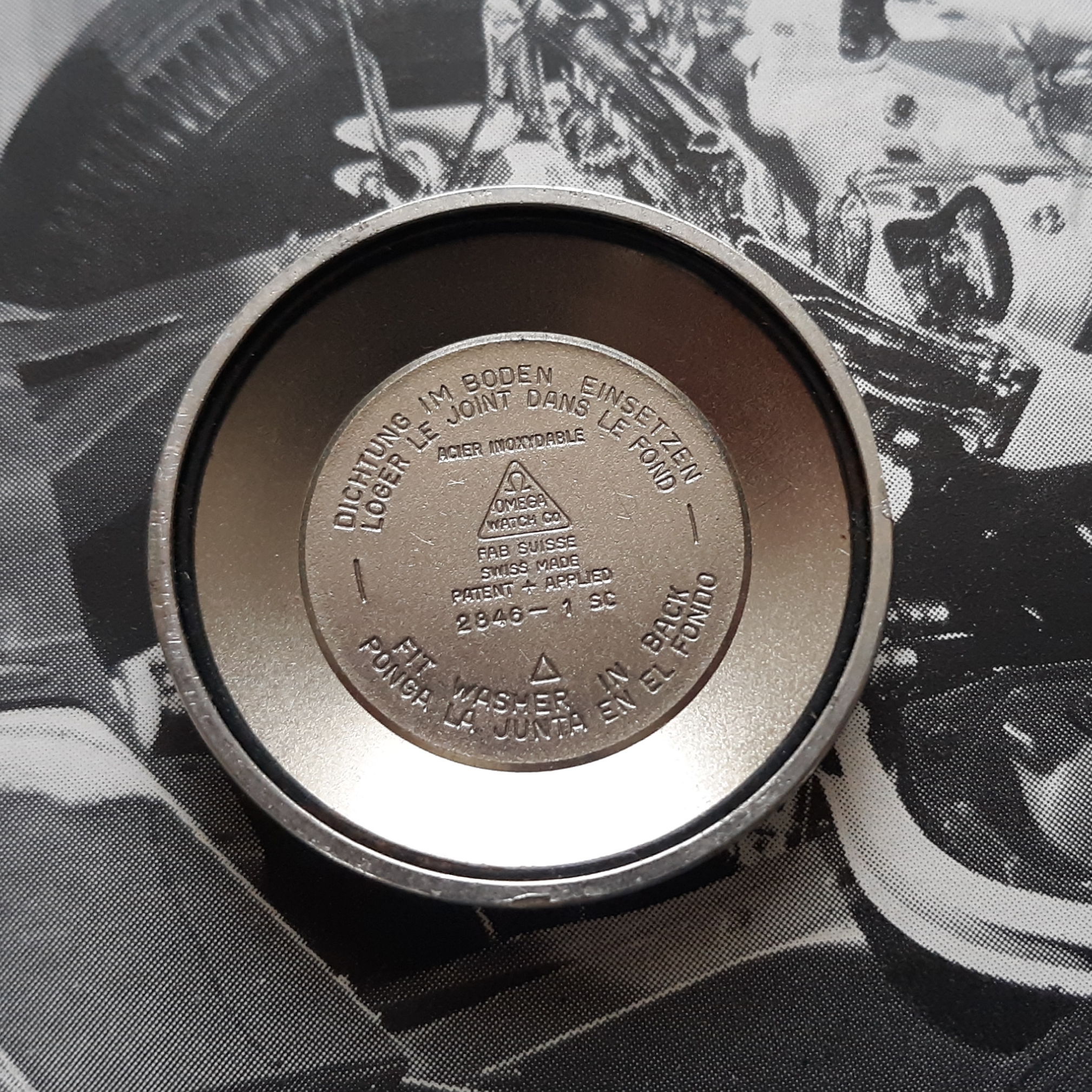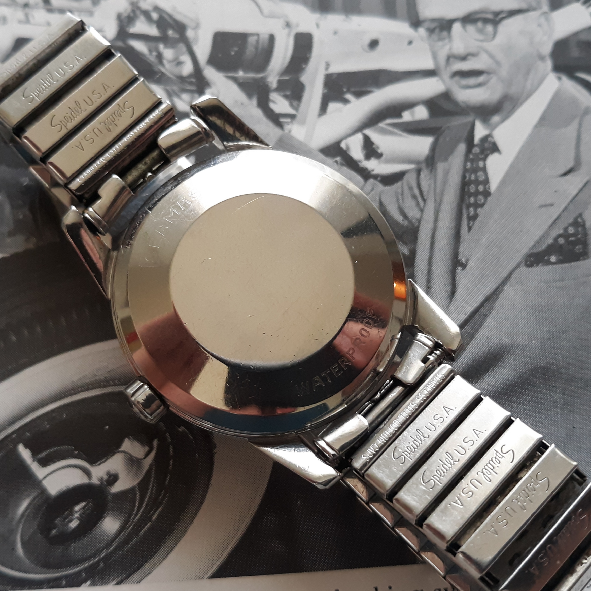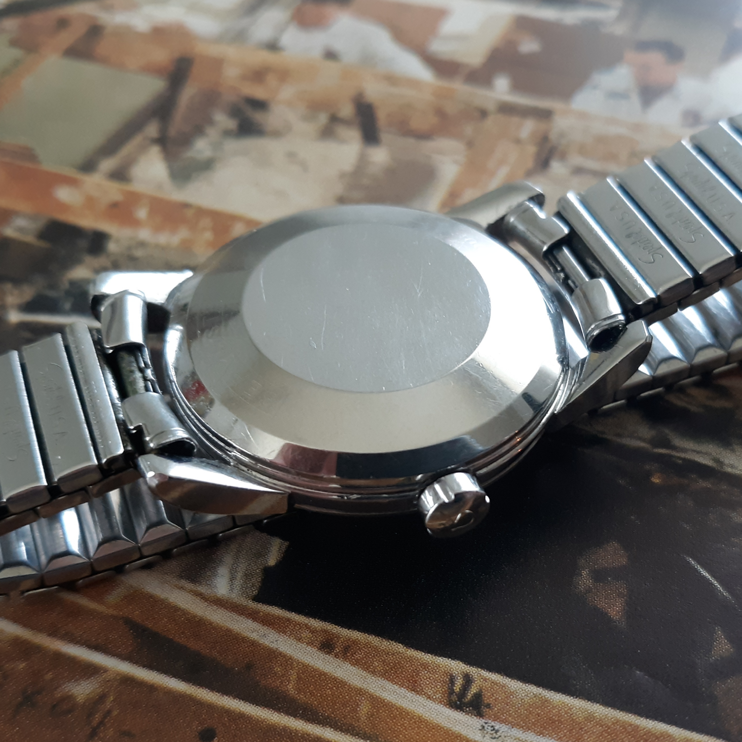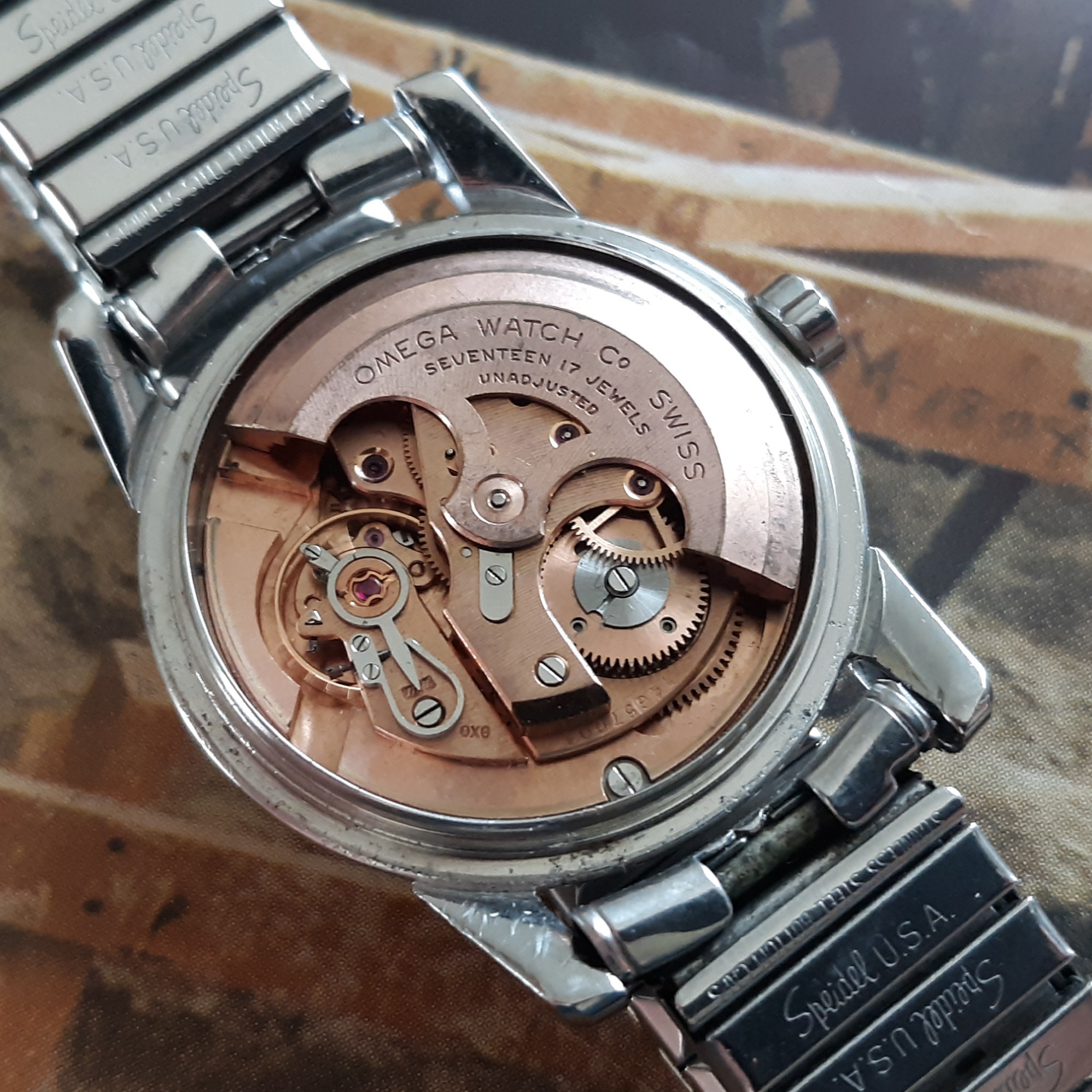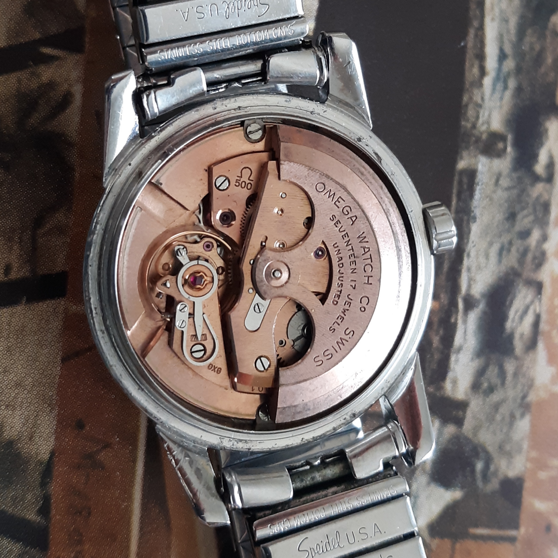 ·Here we have a 1955 Seamaster in solid steel, reference 2846-1. The watch appears all original, minus the steel Speidel band. The white textured dial shows some patina and has silver raised markers. The 34mm case has a snap on case, which snaps very firmly into place. The caliber 500 was serviced mid last year, and keeps great time. Lug width is 18mm. Two minor quirks: the crown is slightly crooked (not too bad though), and the rotor raddles slightly (but it doesn't appear to be rubbing against anything). You probably know the watch, but PM me with any inquiries. I'm asking $525 or best offer, plus shipping. Returns only accepted if grossly misrepresented.