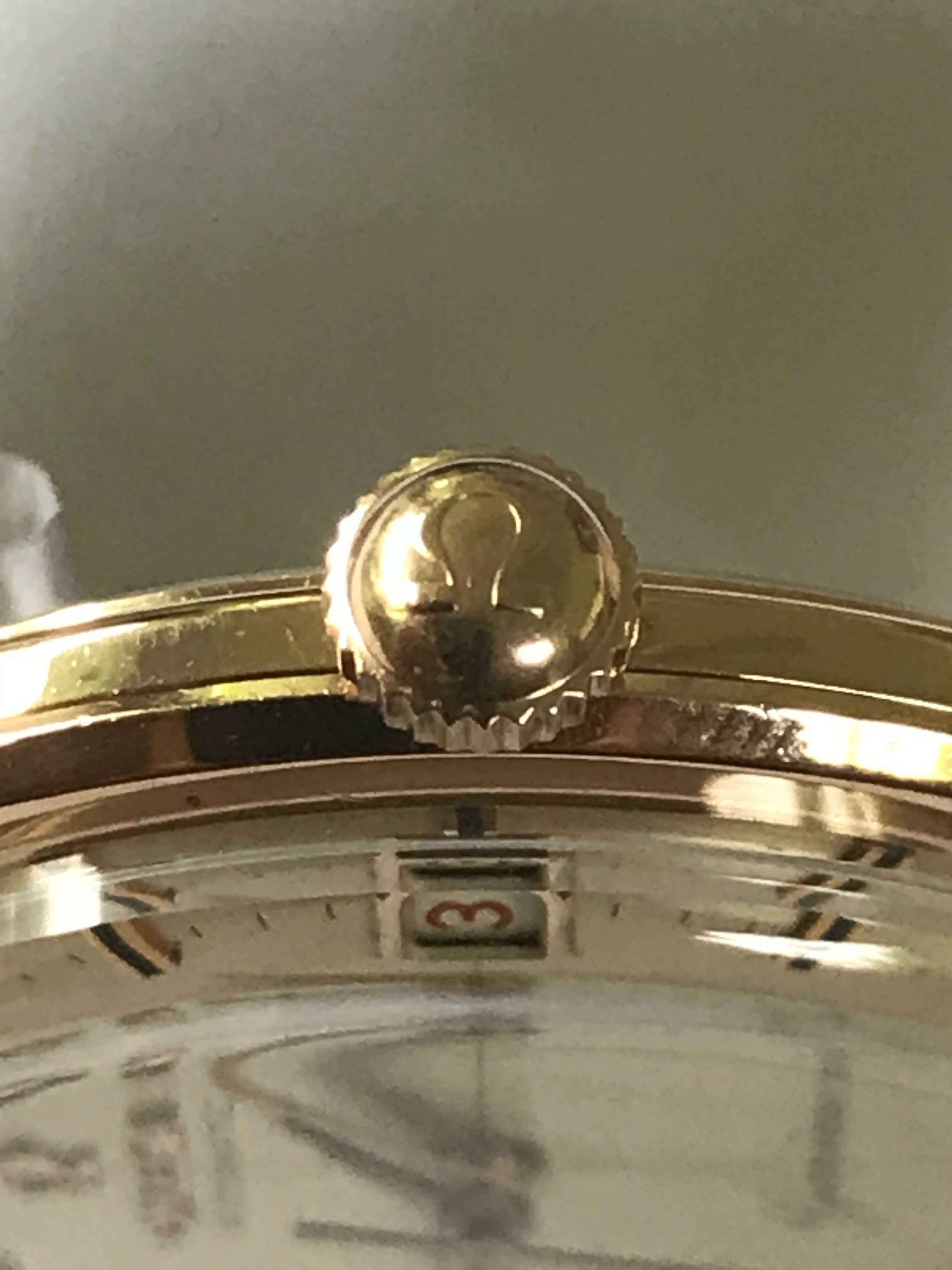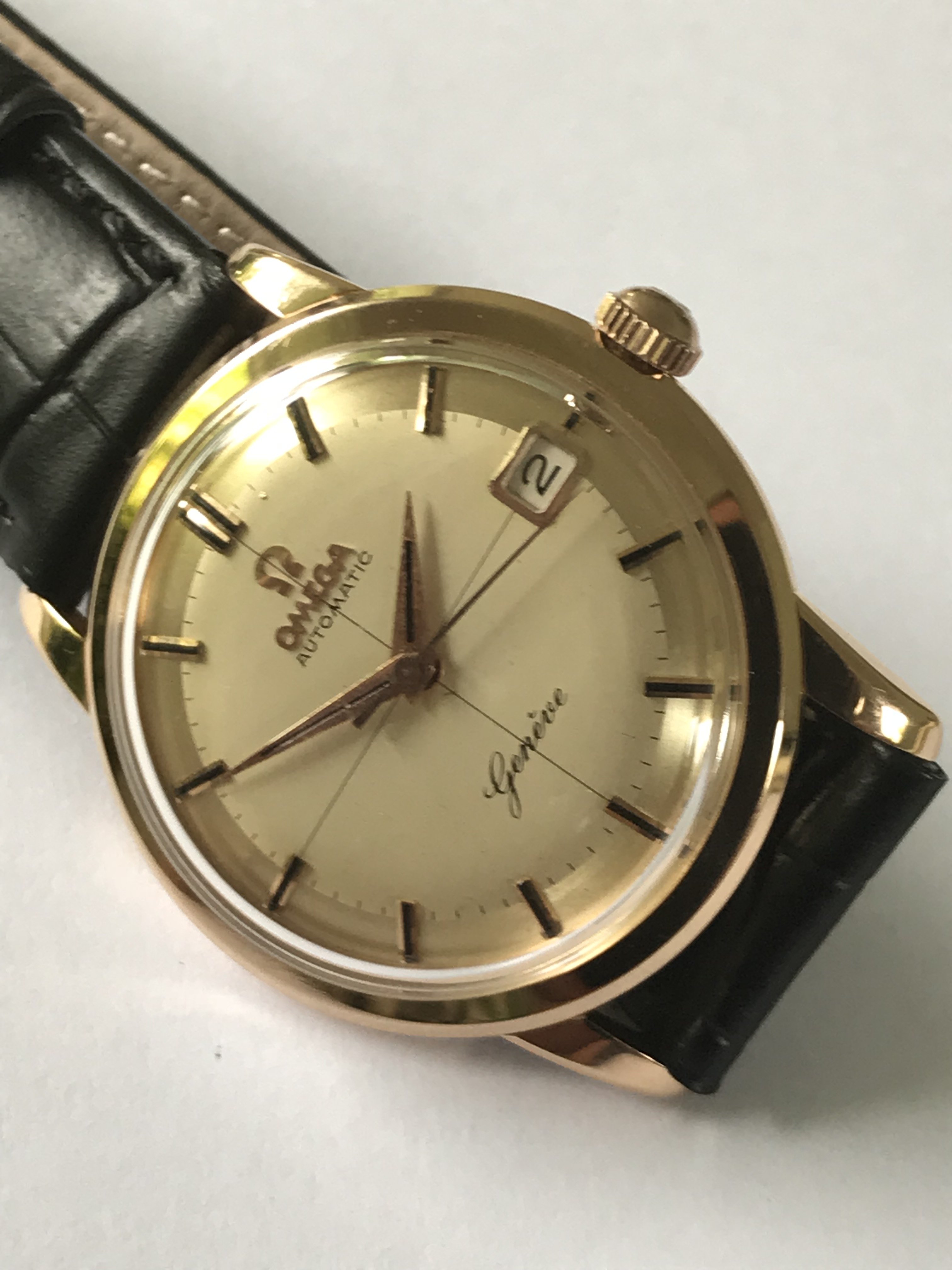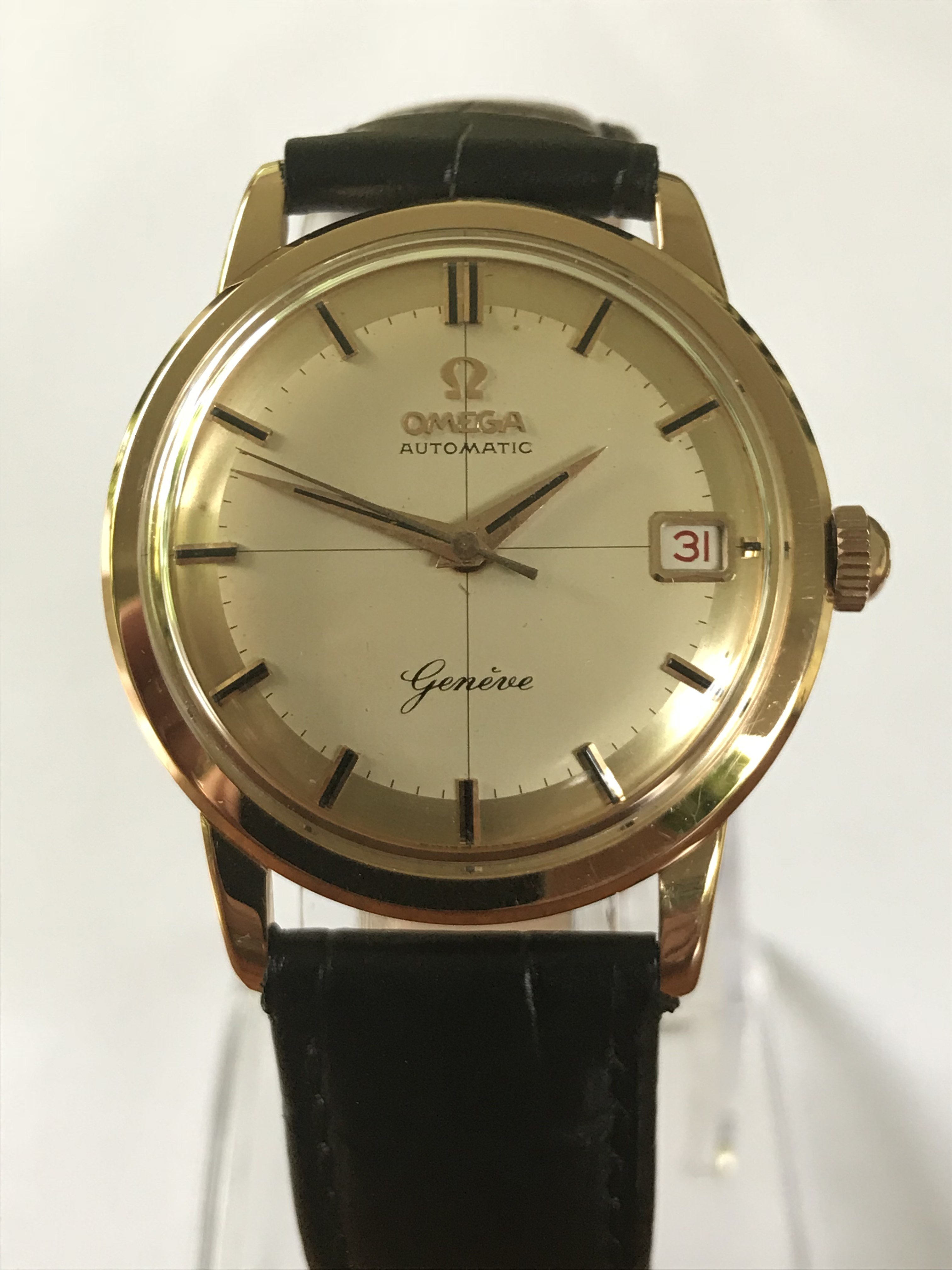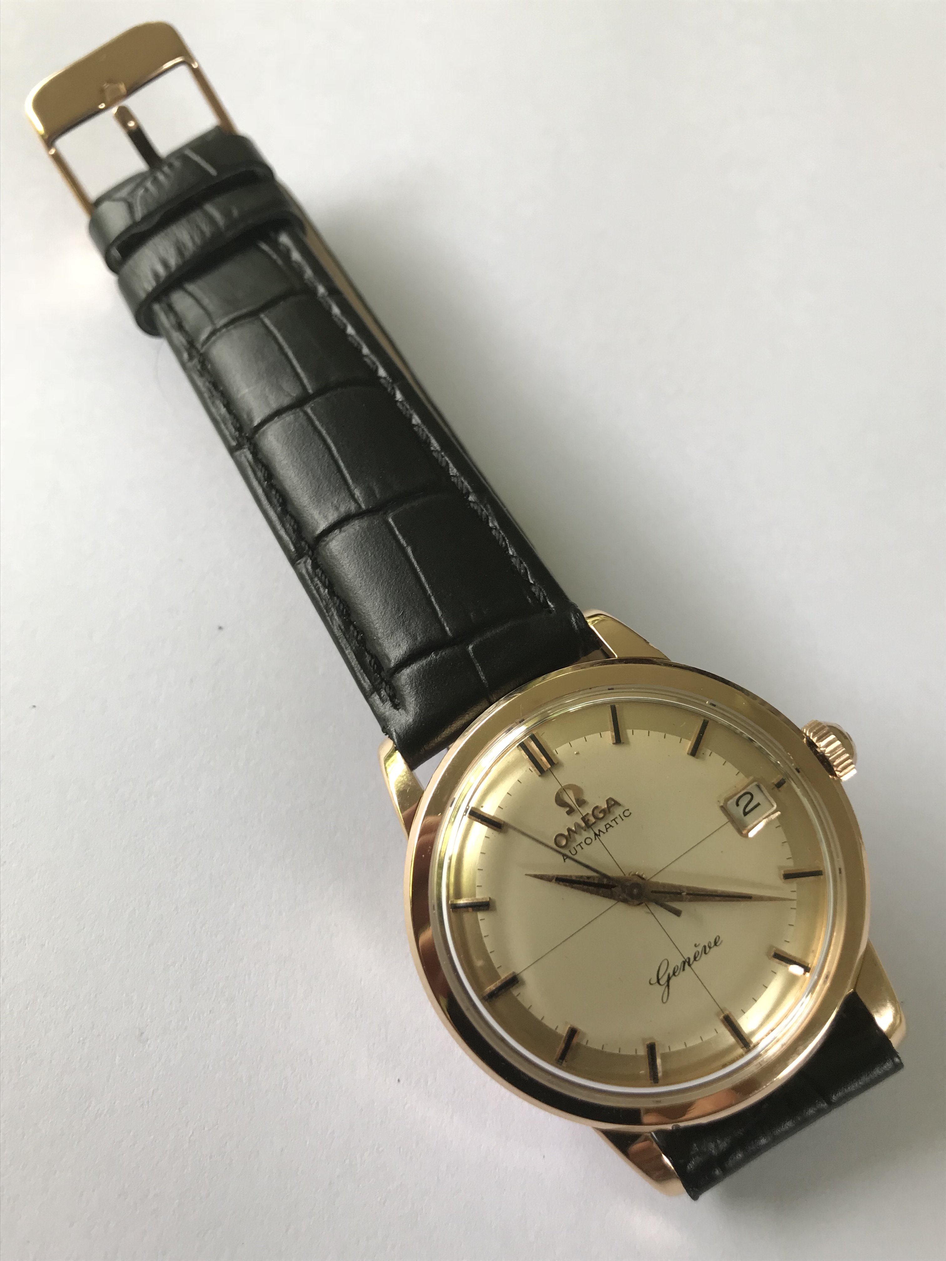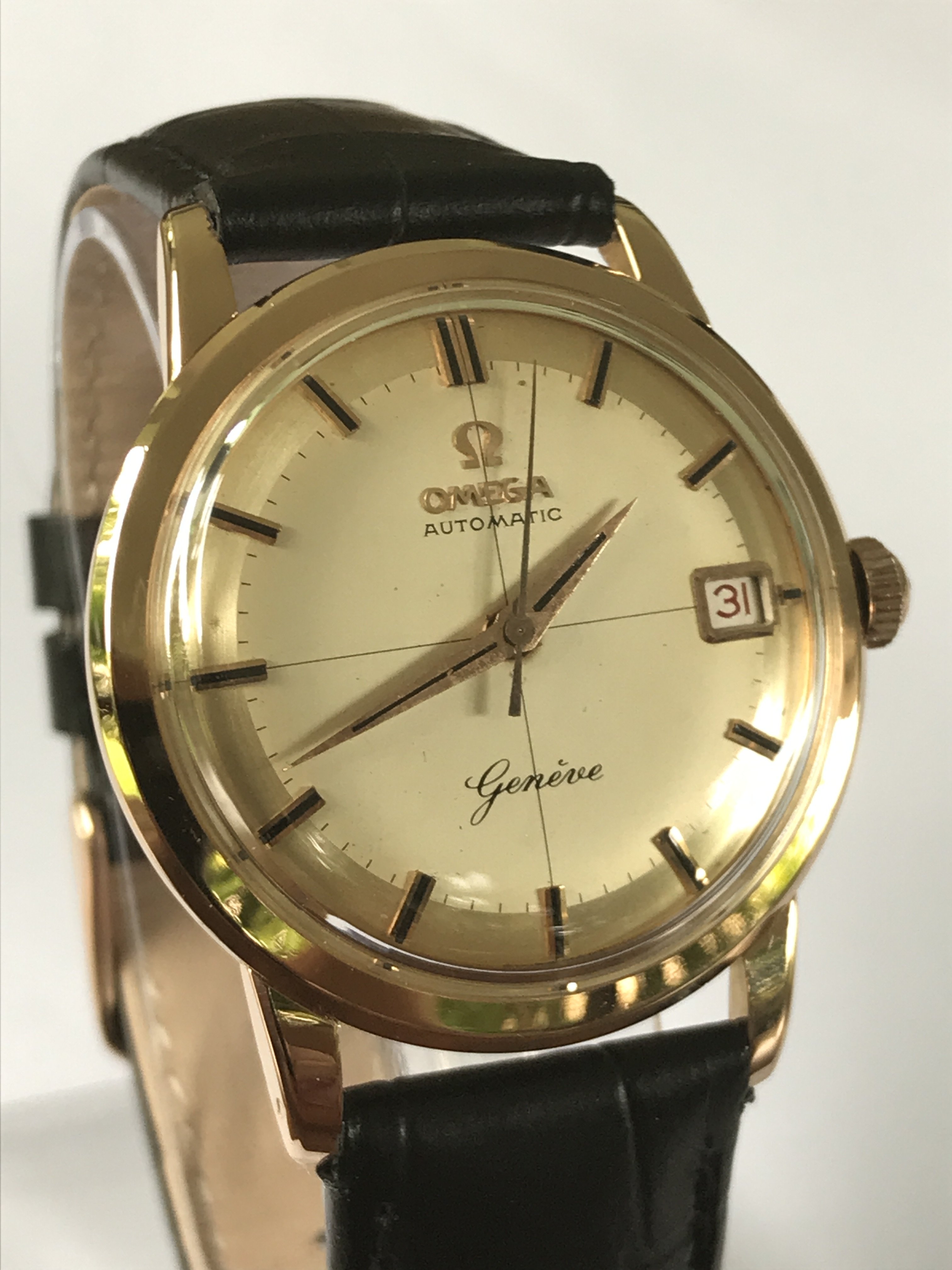 ·1960 Omega Genève Automatic watch in solid 18k rose gold with crosshair dial in very good condition for sale. The watch been recently serviced and runs perfectly on time. Sold with Omega box.