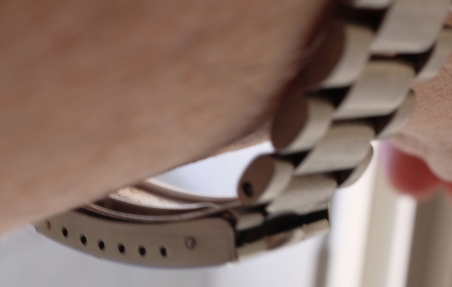 The dial is an amazing chocolate color (I refuse to use the "t" word), and flawless to my eye. Hands are original and markers have a great patina. Bracelet is a pre-1981 1171/735 (trapezoidal logo), and would easily fit an 8" wrist (see photo on my 7.25" wrist).