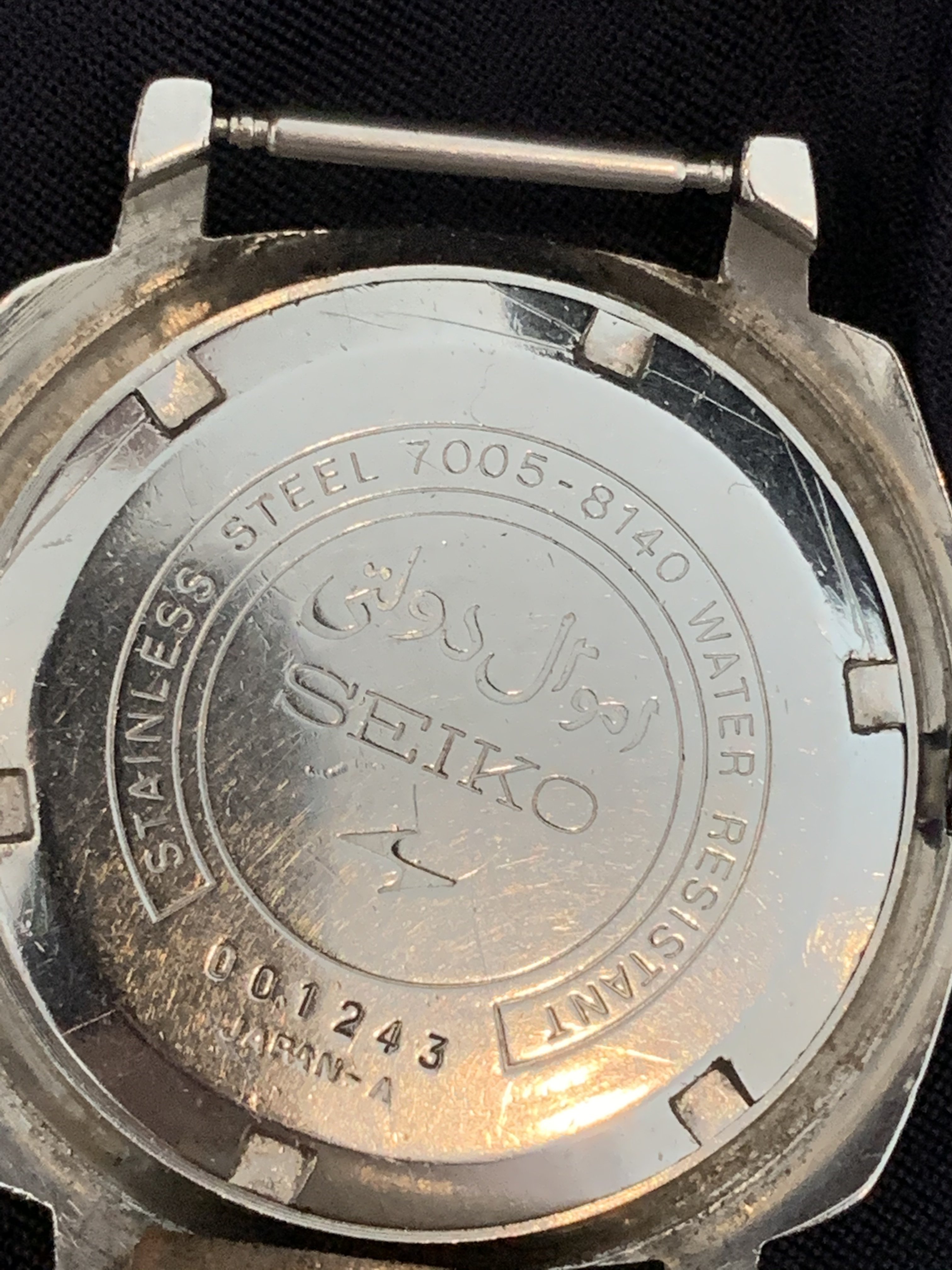 The SEIKO lettering on the 8140 has been moved to the left side of the dial near the 9 o'clock position. In the center the dial is imprinted with the Iranian royal crest and Farsi script which reads "Arteshe Shahanshahiye Iran", meaning “Iran's Royal Army”. The caseback is engraved, "Amvale Dolati" which means ”State Property”.