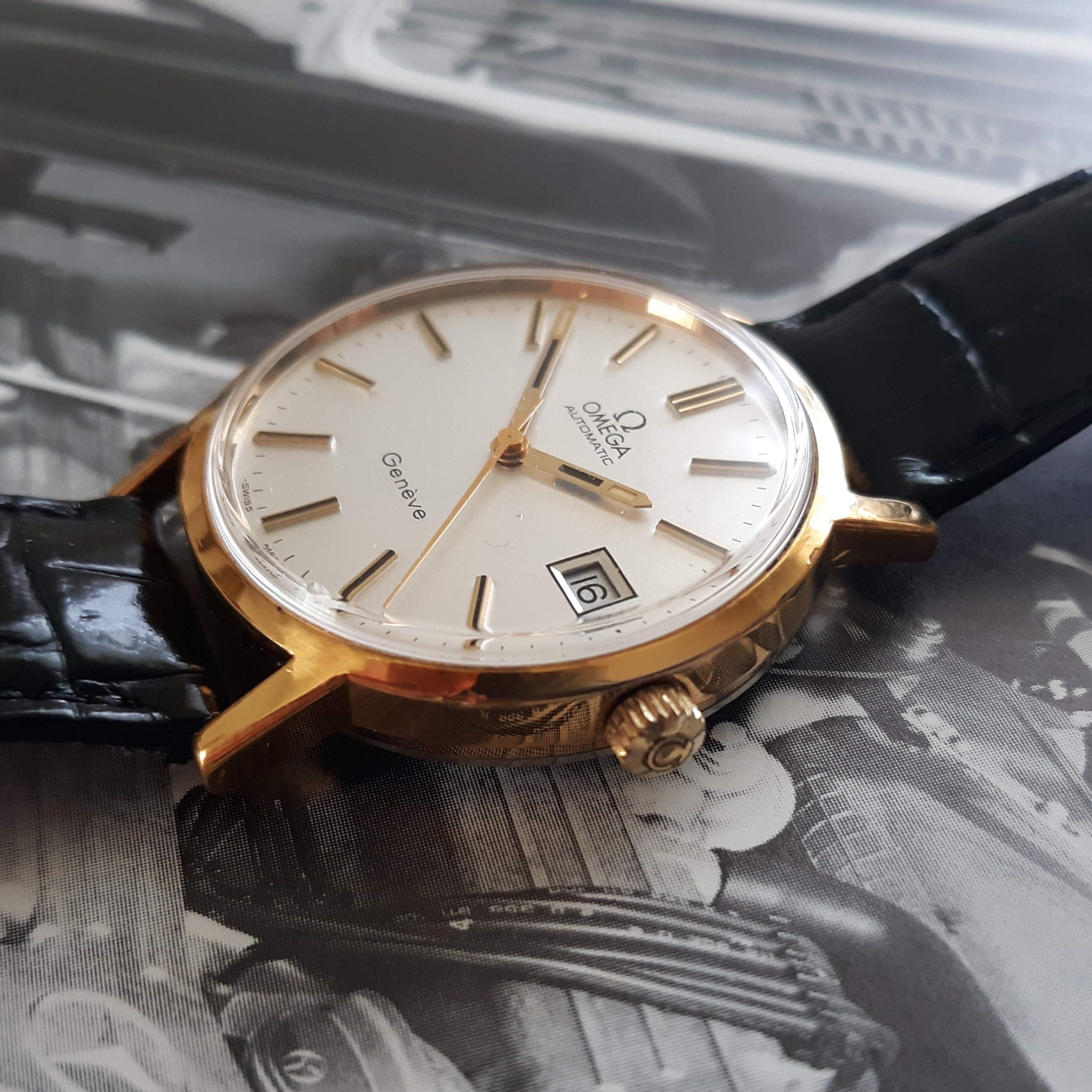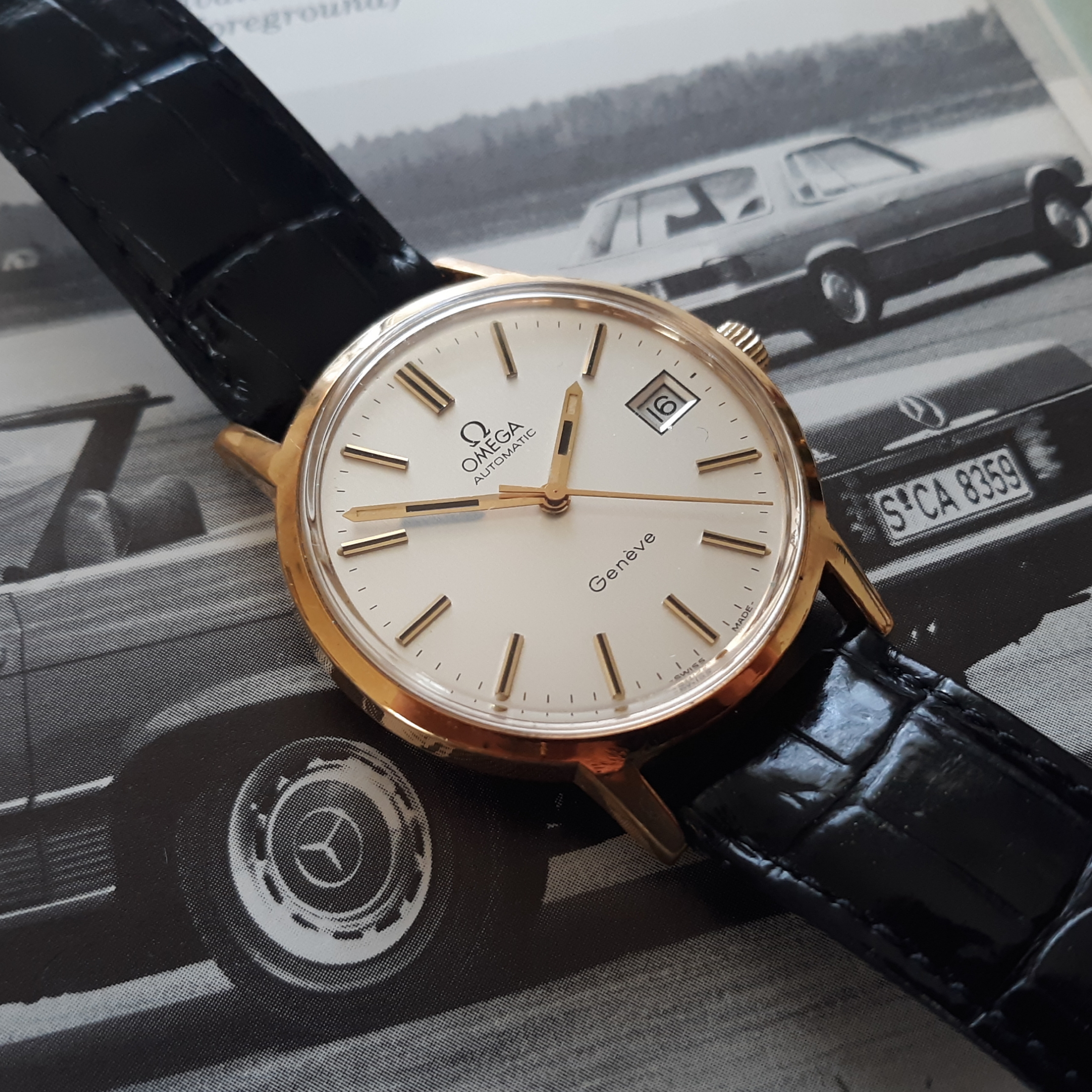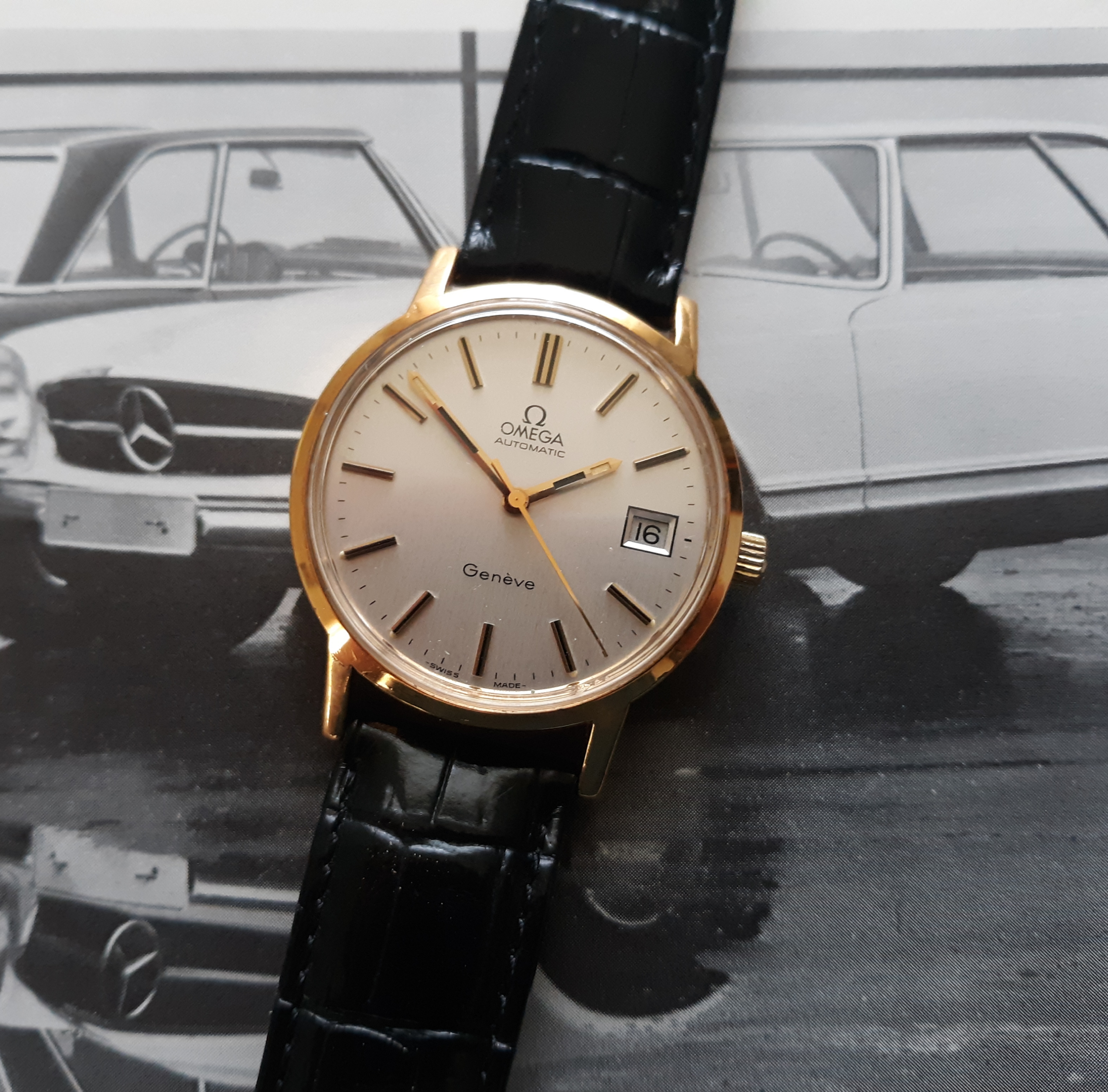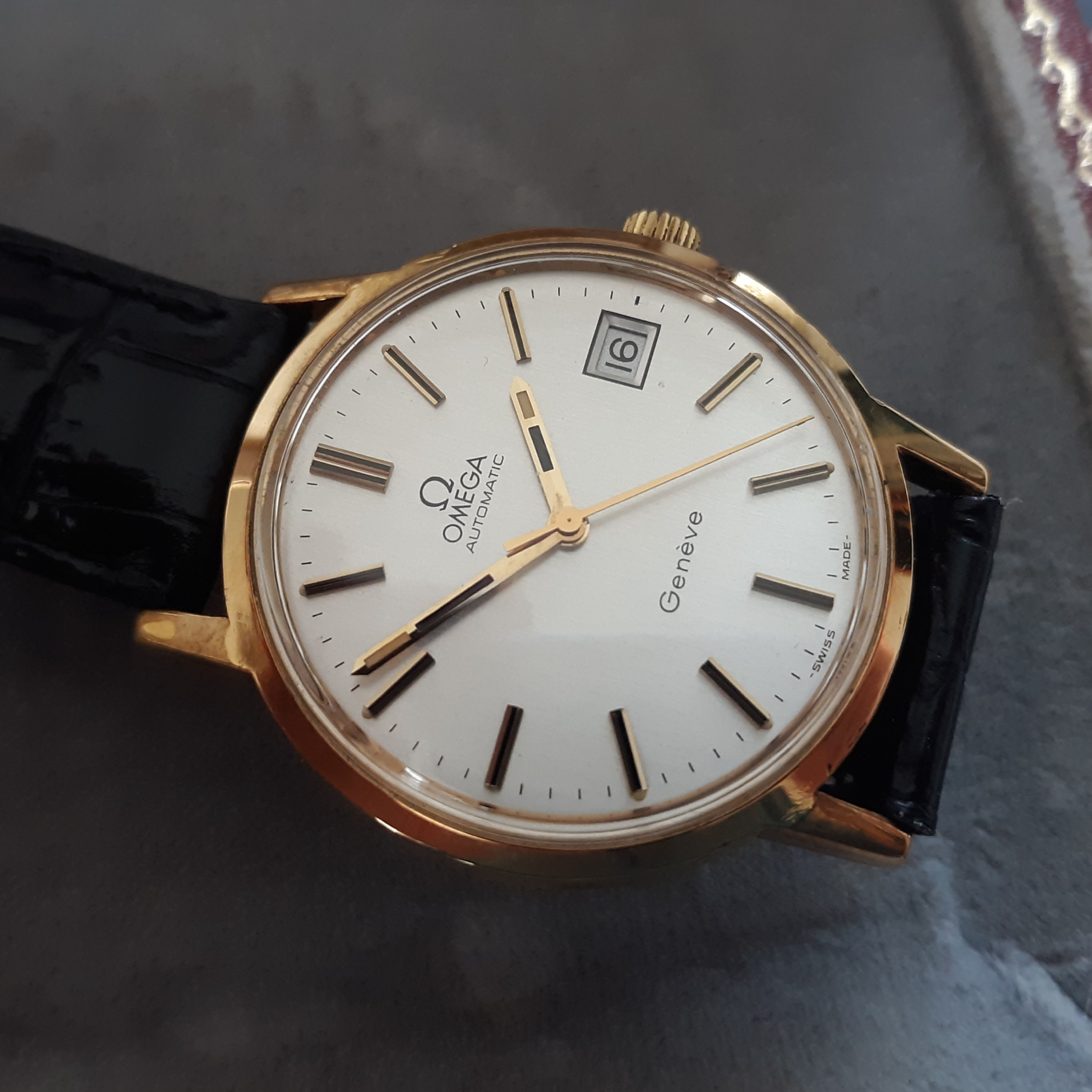 ·Here we have a 1972 Omega Geneve. The reference number is 1660165, that houses a pristine caliber 1012. The case is gold plated, with a thick steel screw on back, and measures just under 35mm in diameter (not including the crown). Lug width is 18mm. There is a minor brassing spot on the upper right lug. The dial is my favorite part of this watch, a brushed sliver, with no blemishes. I do not know the service history, although it keeps great time. The date functions perfectly. It comes in a vintage Omega box, although I'm unsure if it's original to the watch. I'm asking $425 or best offer, plus shipping. Returns only accepted if grossly misrepresented.