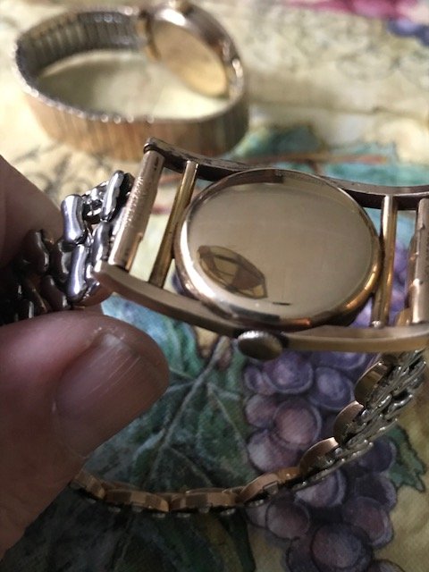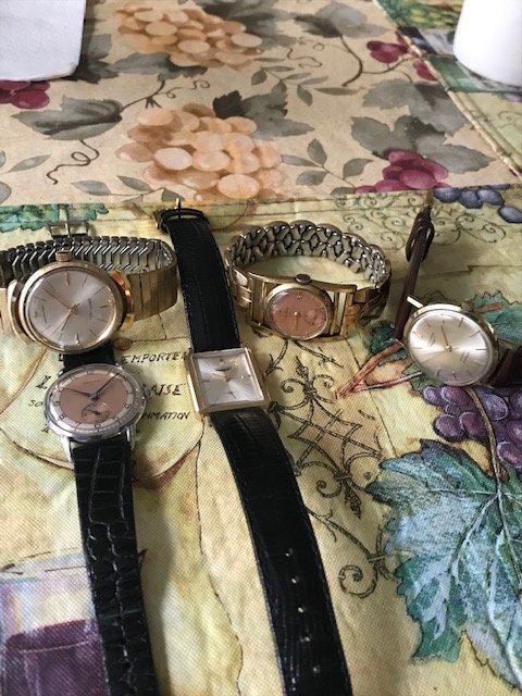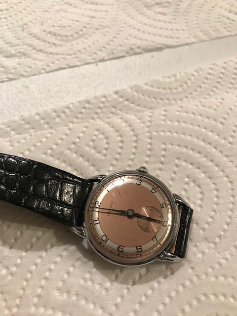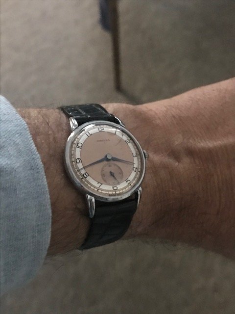 Lower left is a '40's? or '50's? Men's Orfina manual wind with a sharp looking two-tone deco dial and the salmon color really stand out. Super nice runner and the small marks on the dial are much less noticeable in person than in the unforgiving digital pictures. Case is also in great shape as well.